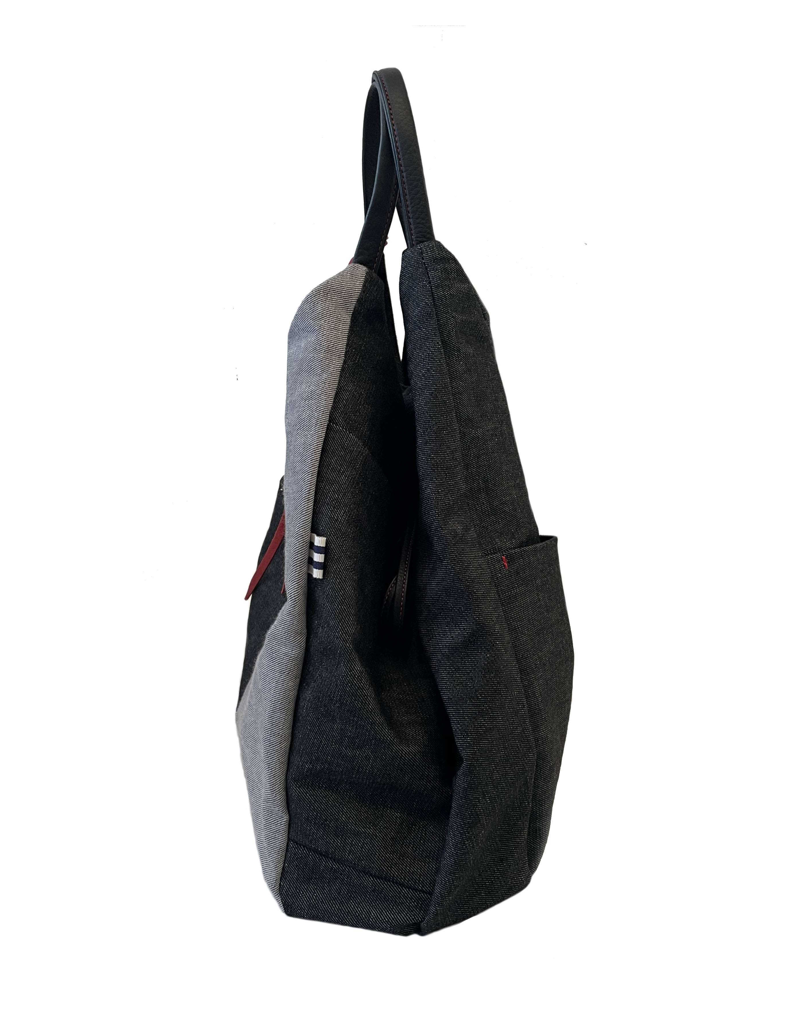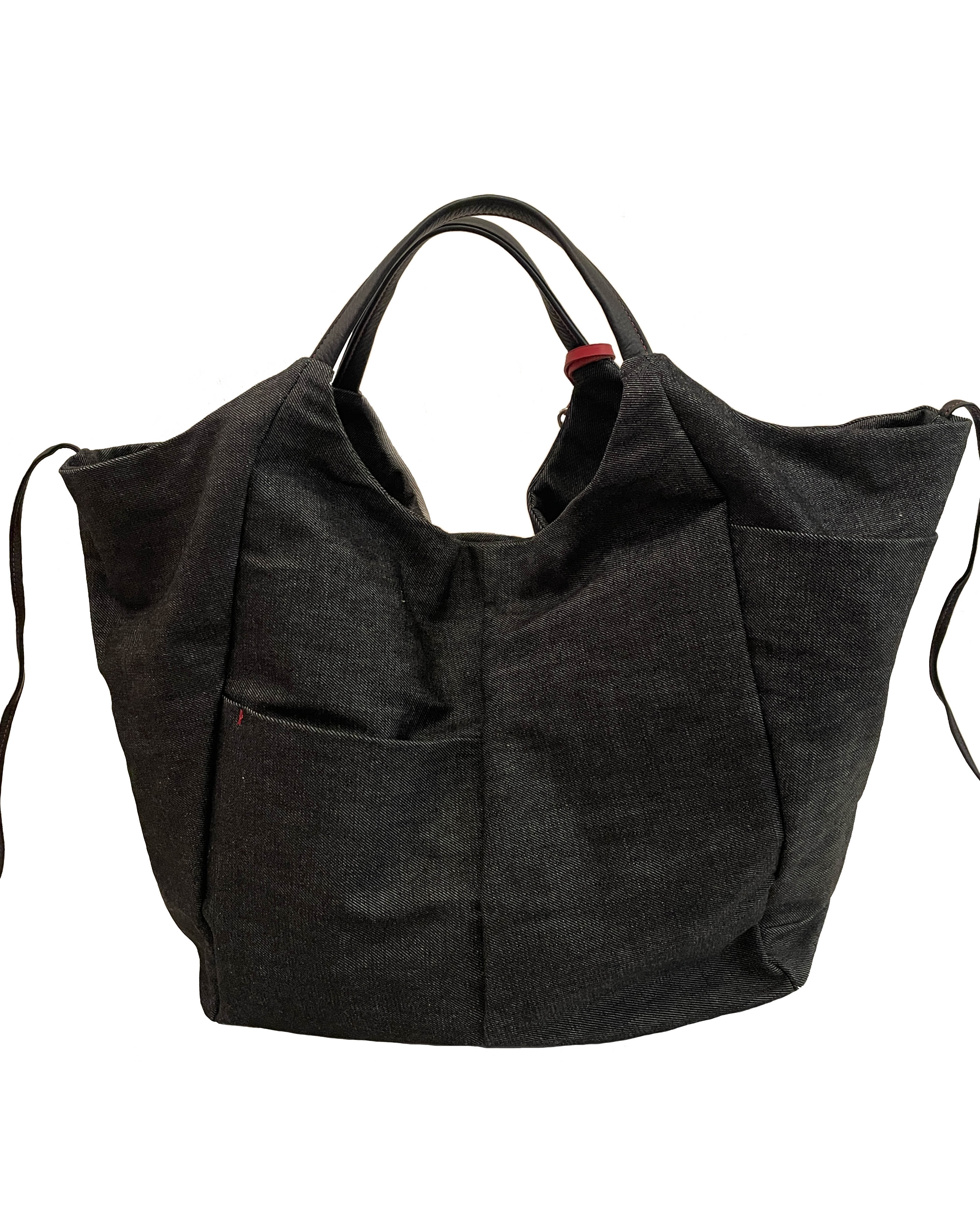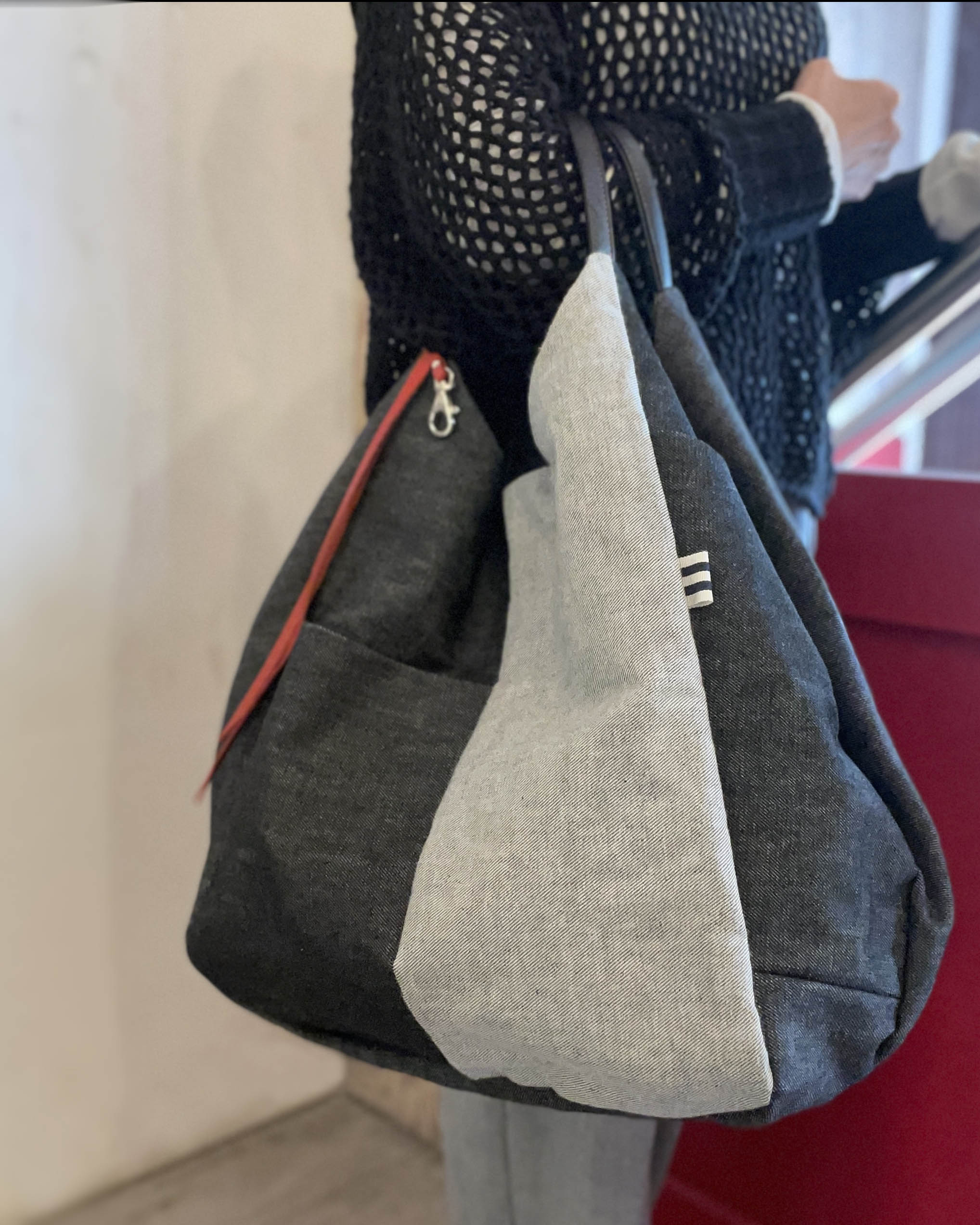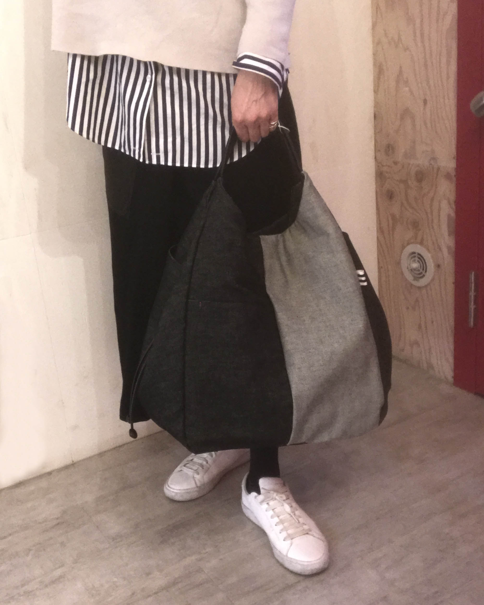 大容量のトートバッグ。両サイドに付いているヒモを結ぶと山型に変形・・口元が絞られるので、中の荷物も安心です。大きい荷物を入れる場合はヒモを縛らず広げた状態で。しっかり荷物を入れたい時、重宝します。