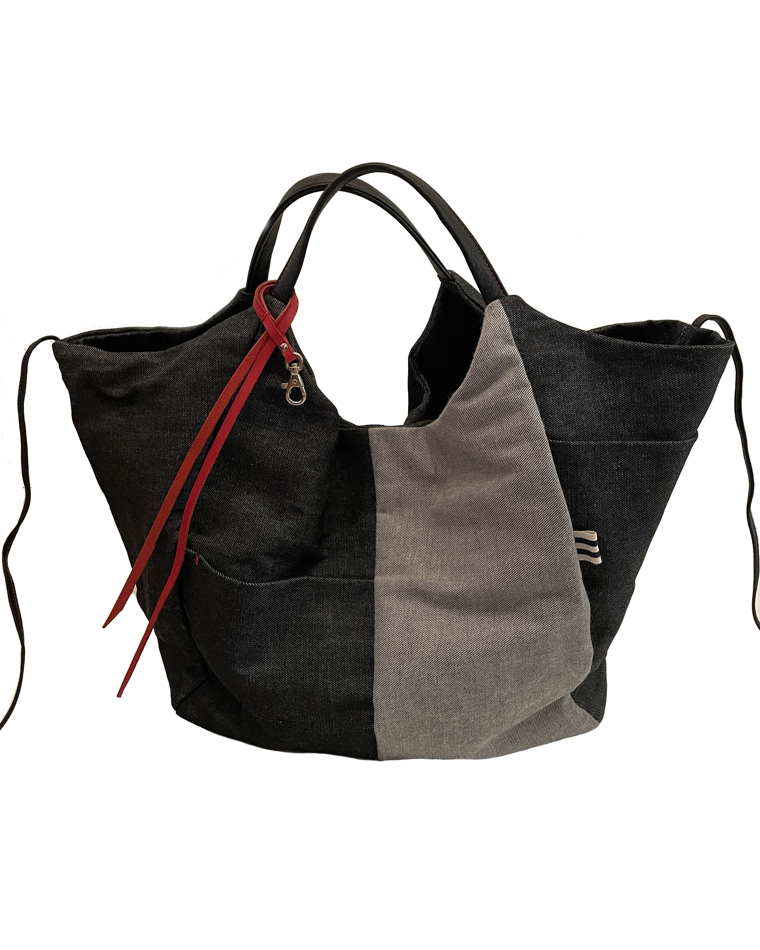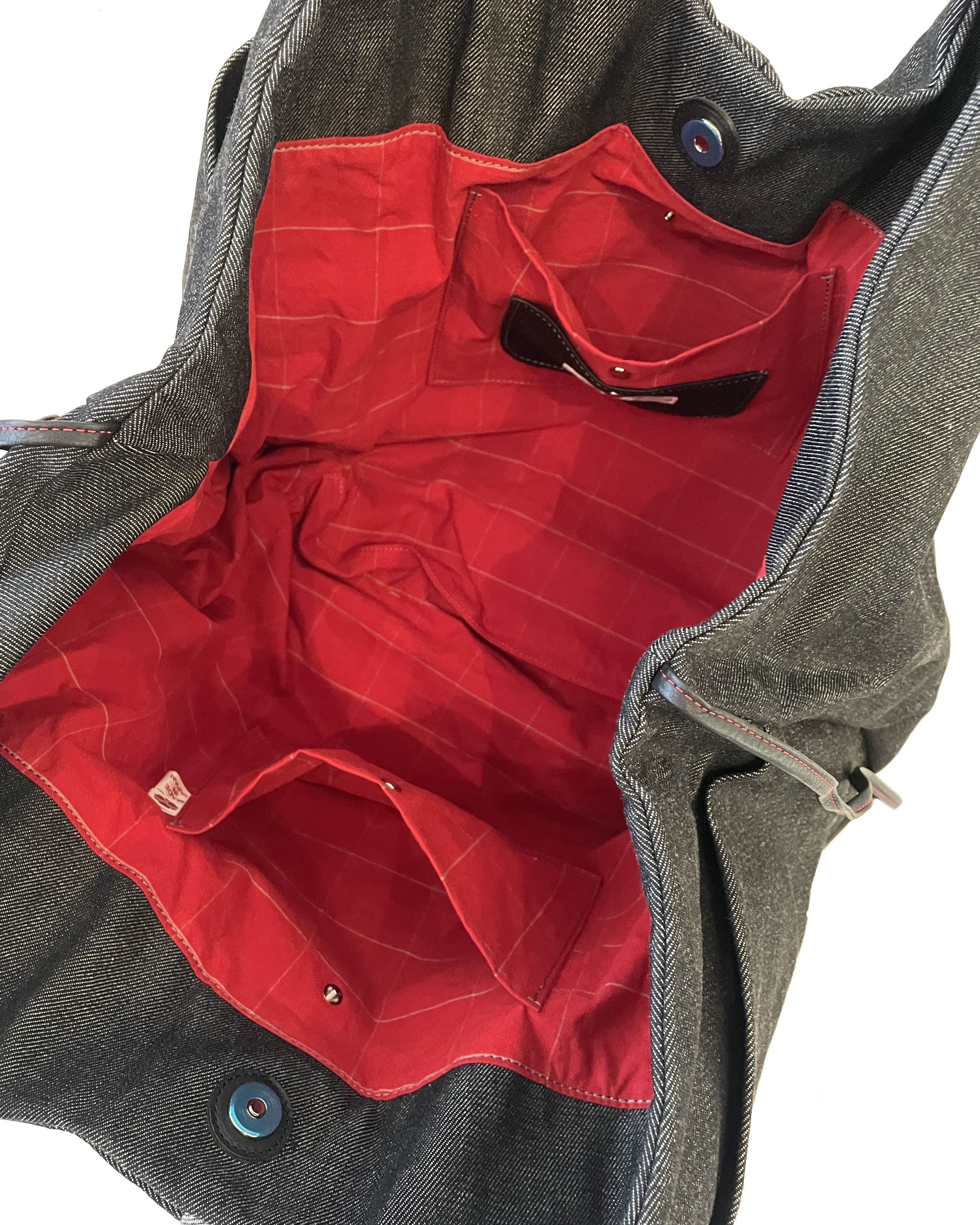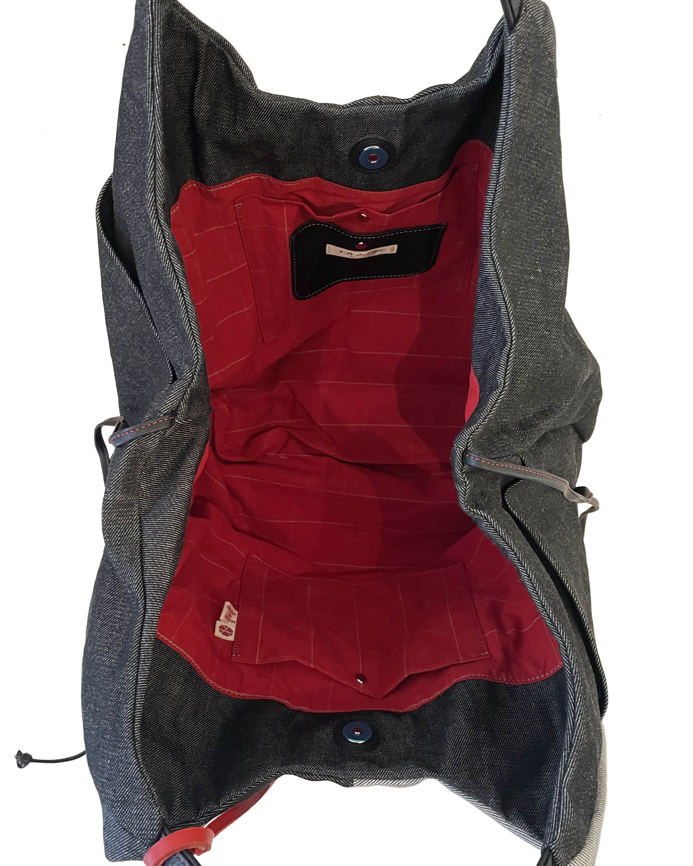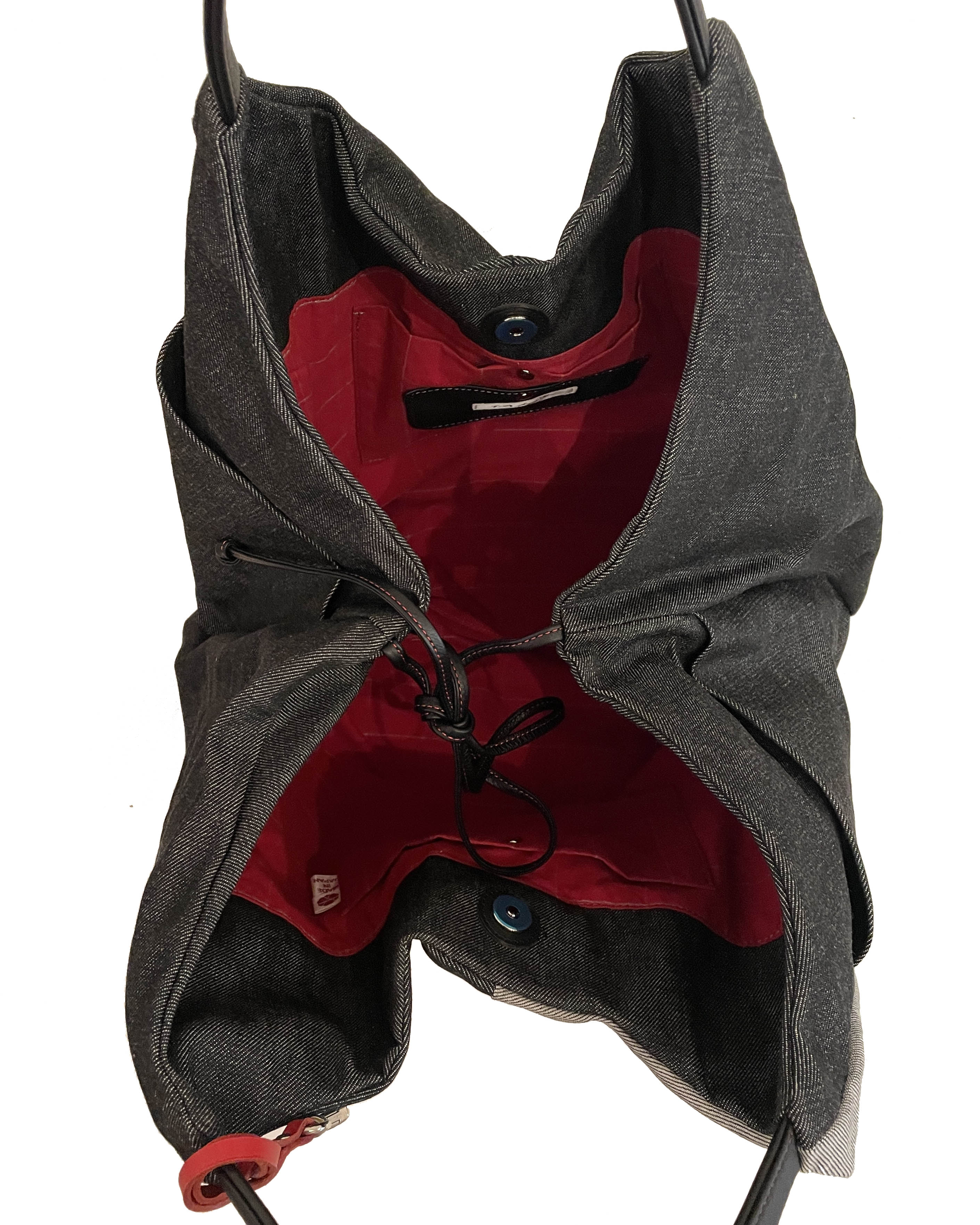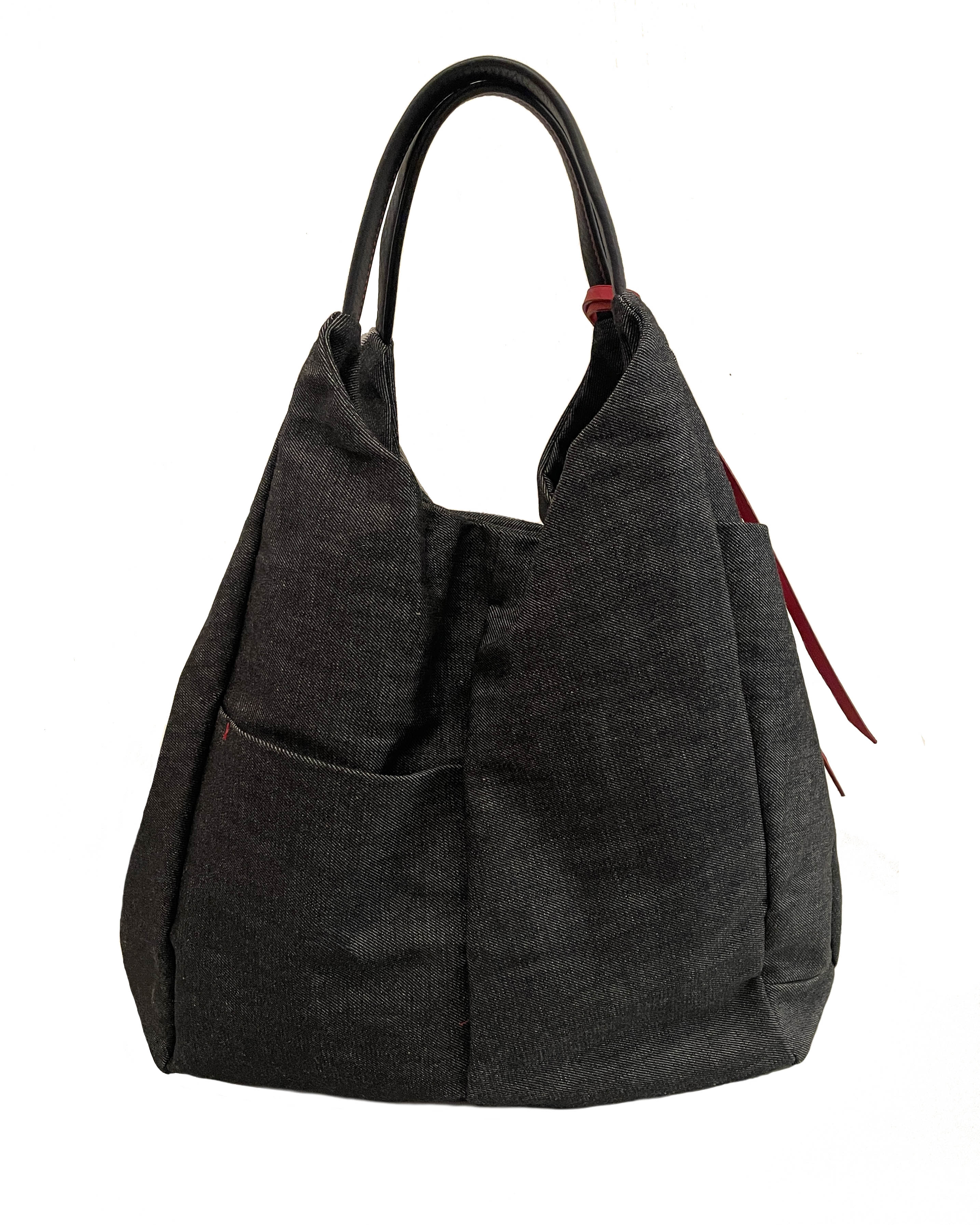 大容量のトートバッグ。両サイドに付いているヒモを結ぶと山型に変形・・口元が絞られるので、中の荷物も安心です。大きい荷物を入れる場合はヒモを縛らず広げた状態で。しっかり荷物を入れたい時、重宝します。