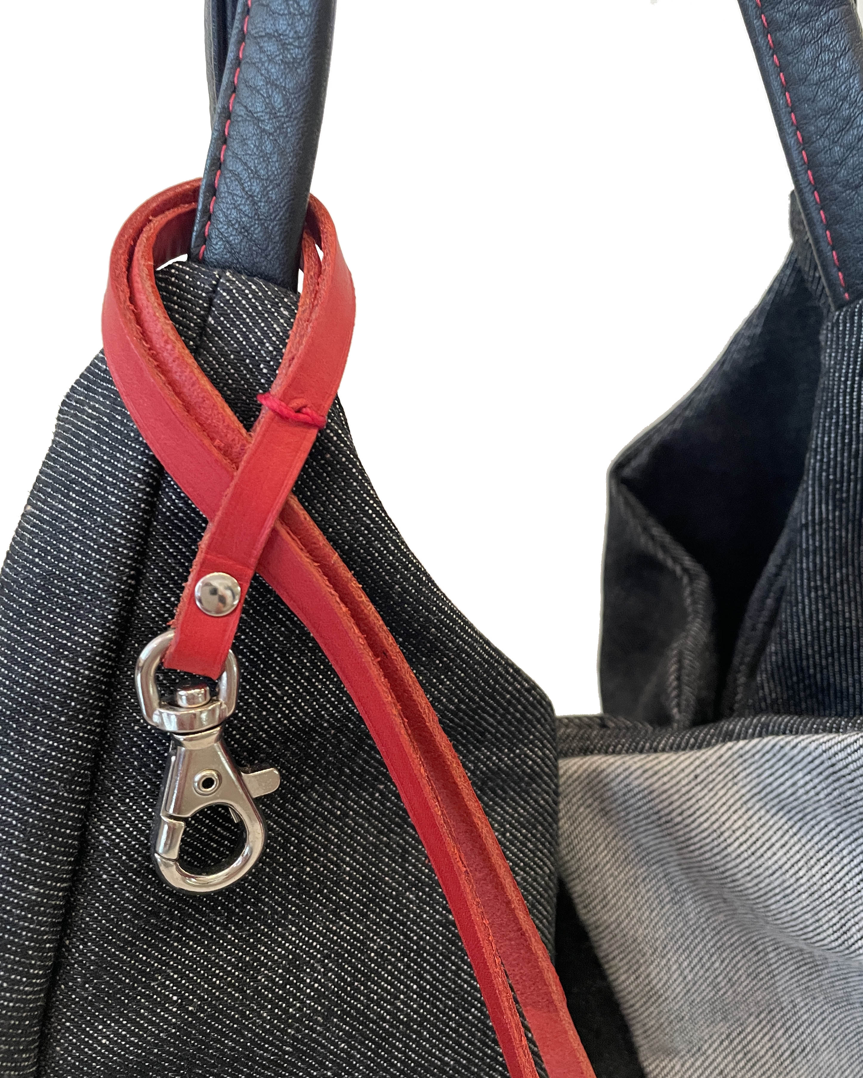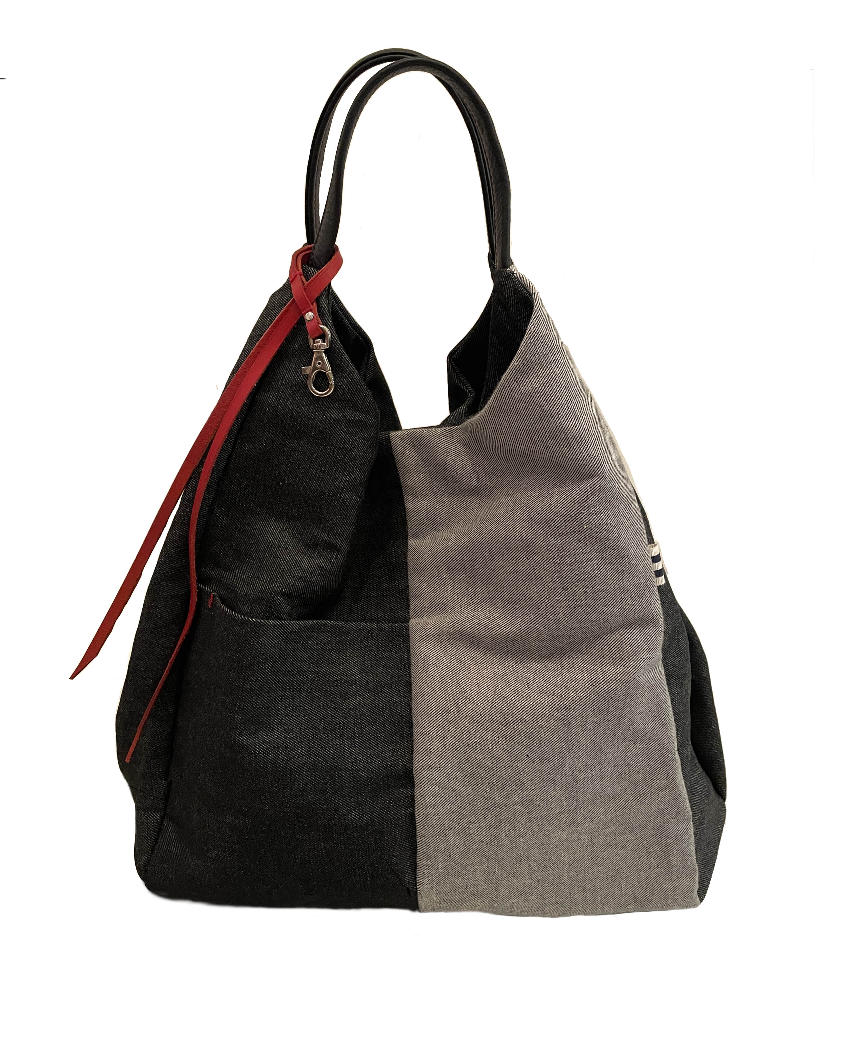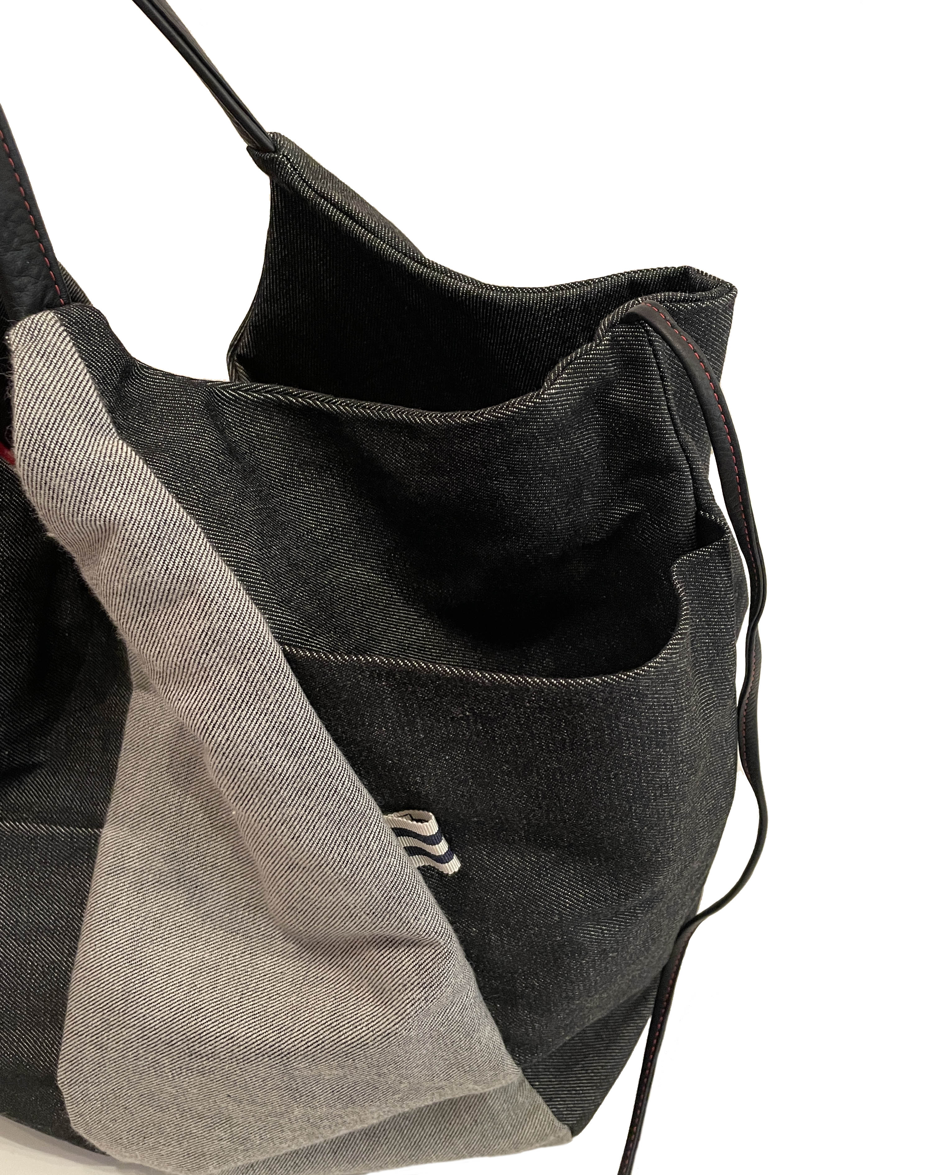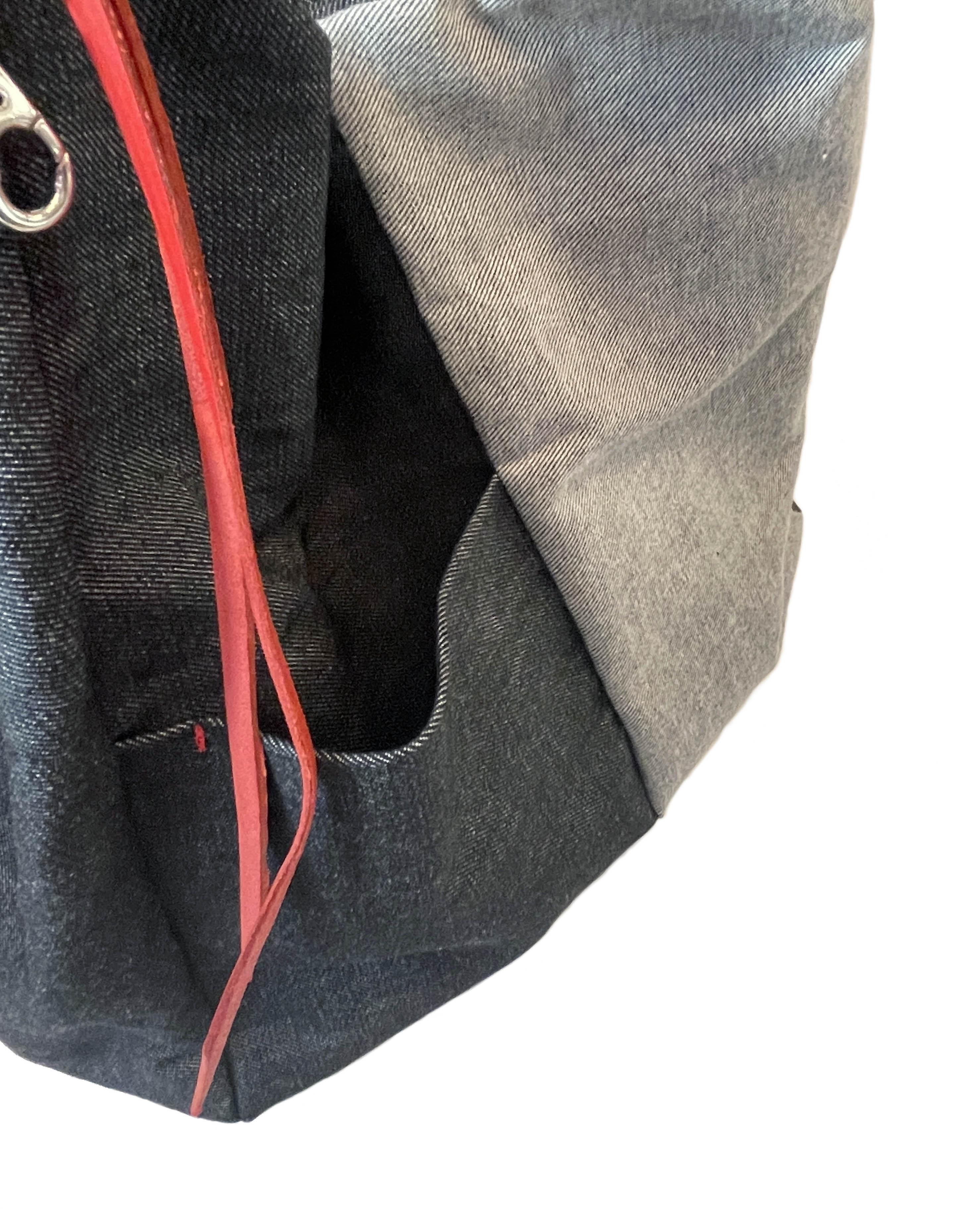 大容量のトートバッグ。両サイドに付いているヒモを結ぶと山型に変形・・口元が絞られるので、中の荷物も安心です。大きい荷物を入れる場合はヒモを縛らず広げた状態で。しっかり荷物を入れたい時、重宝します。