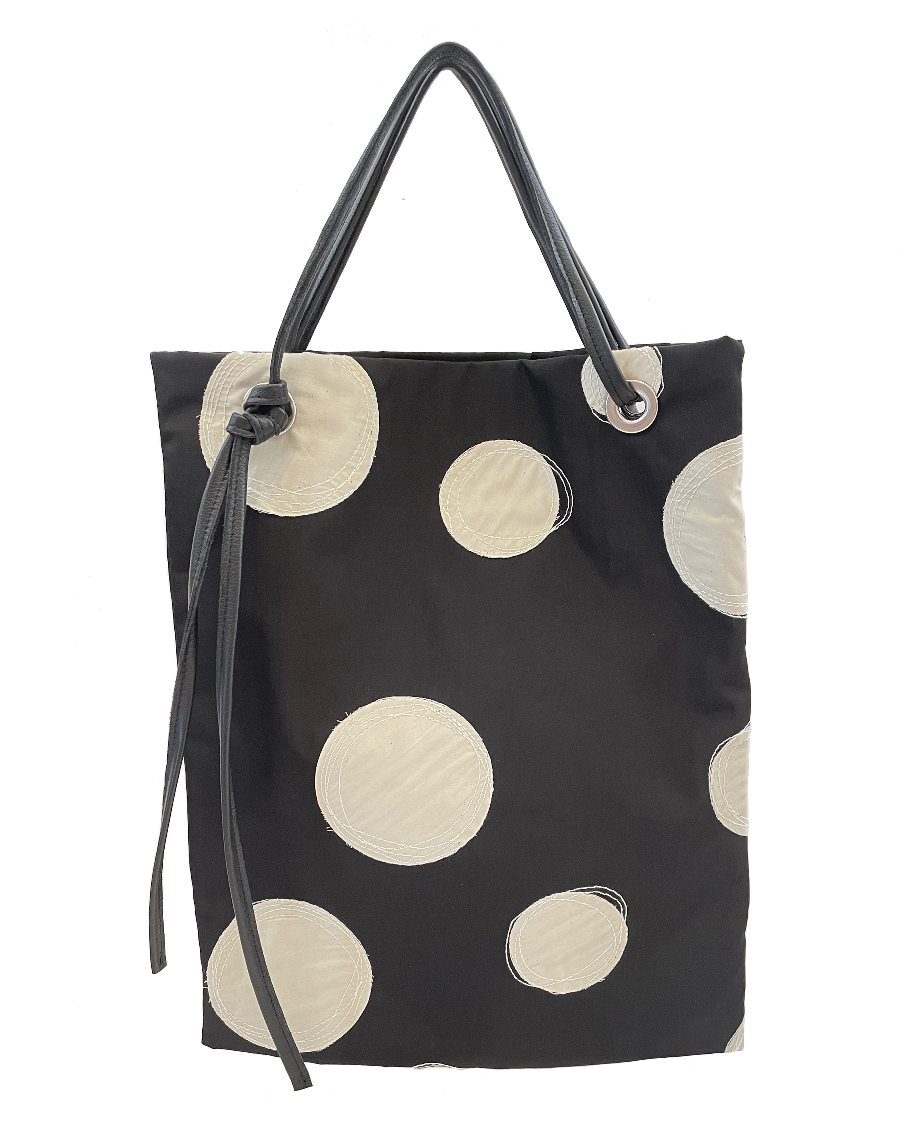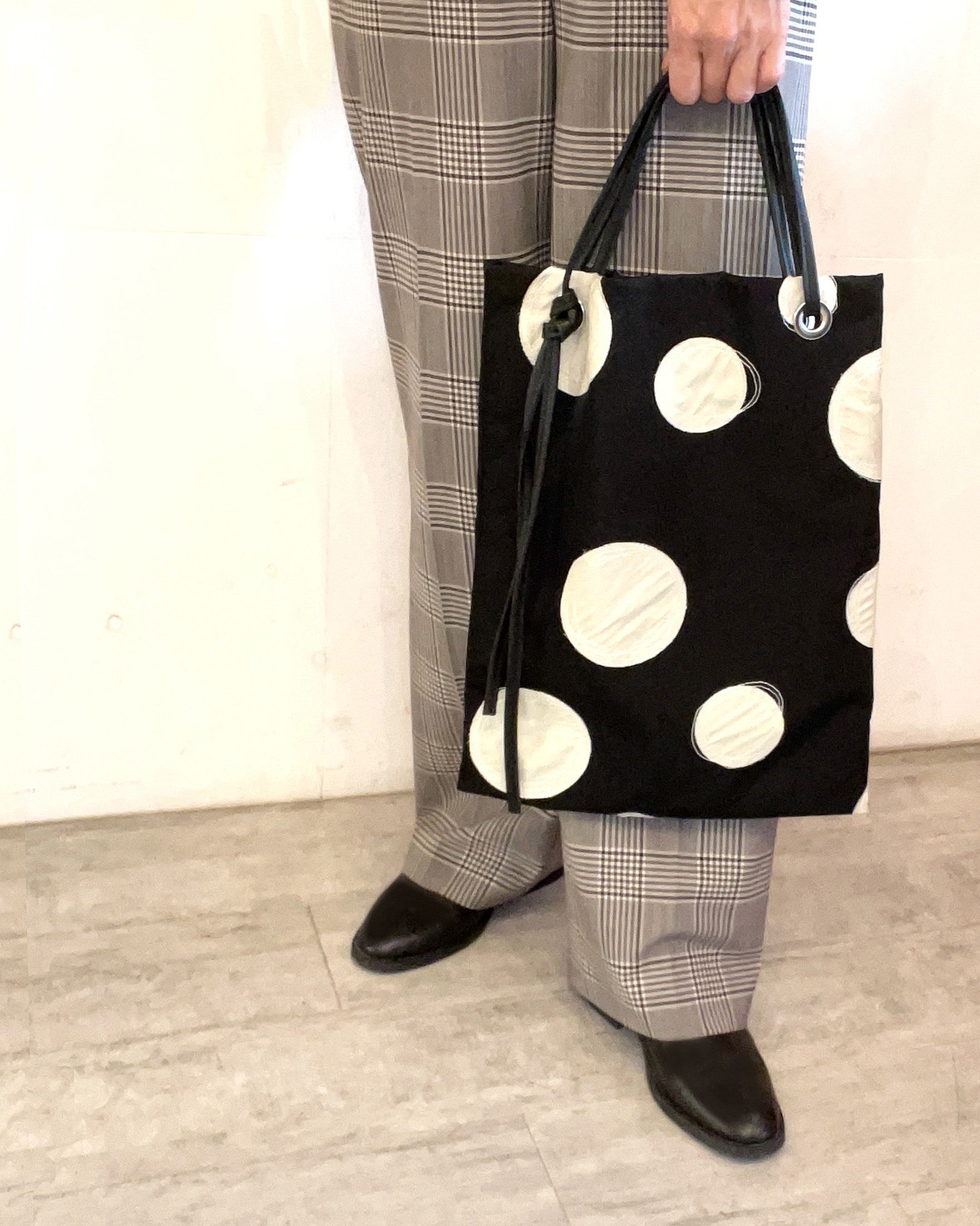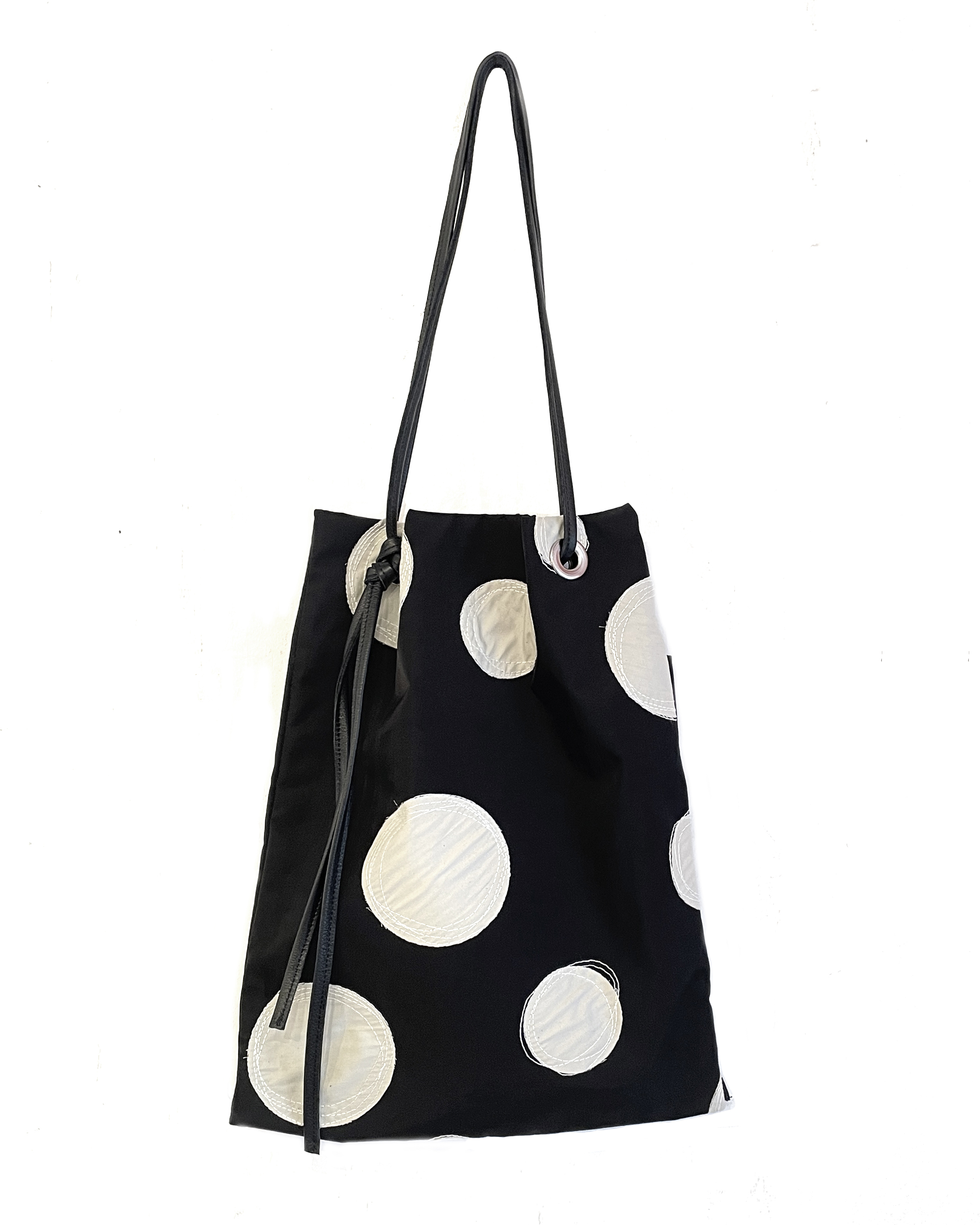 大き目のドット柄の上に施されたランダムなステッチが大人かわいい。少し重いかと思いきや、持ってみるととても軽い素材です。