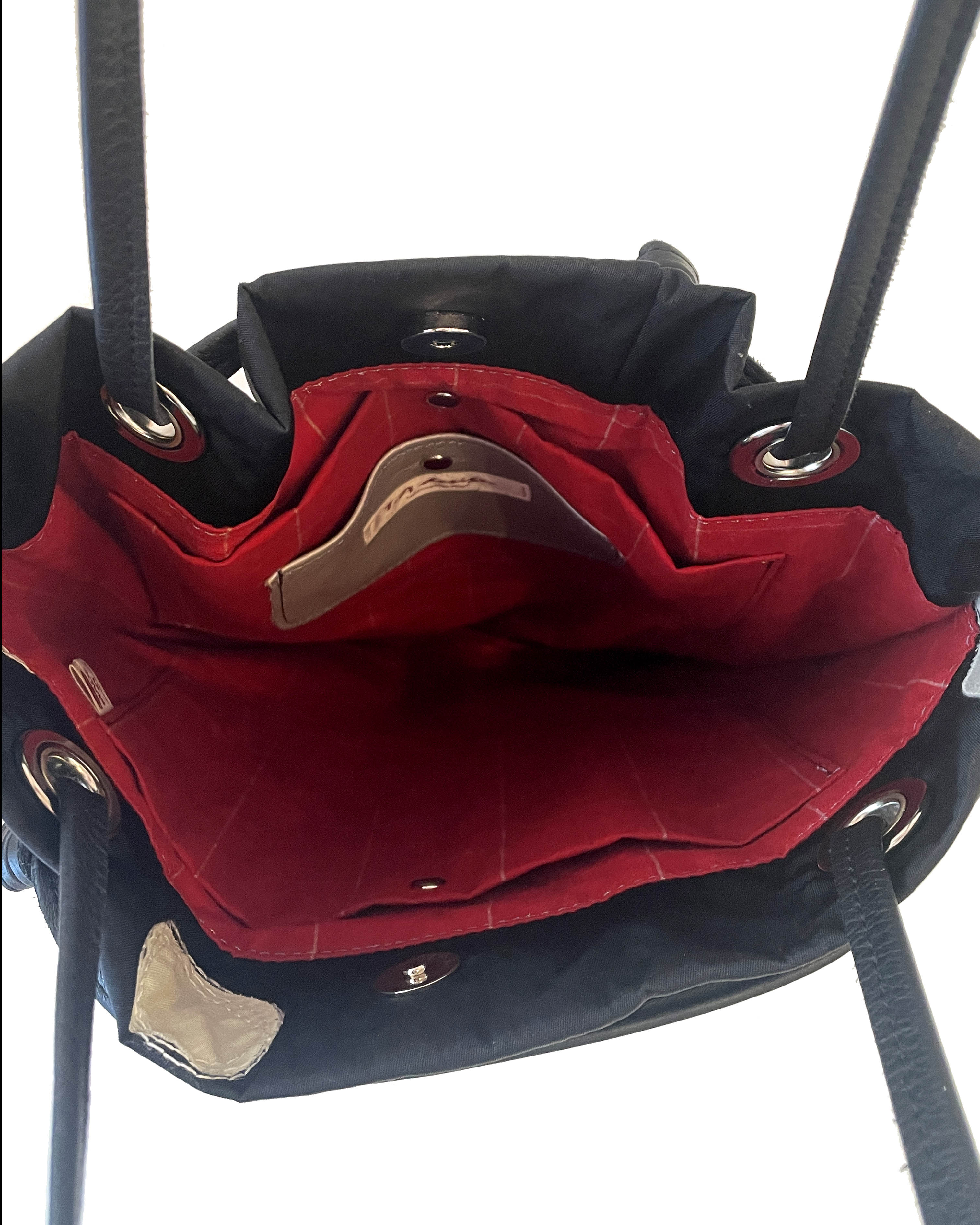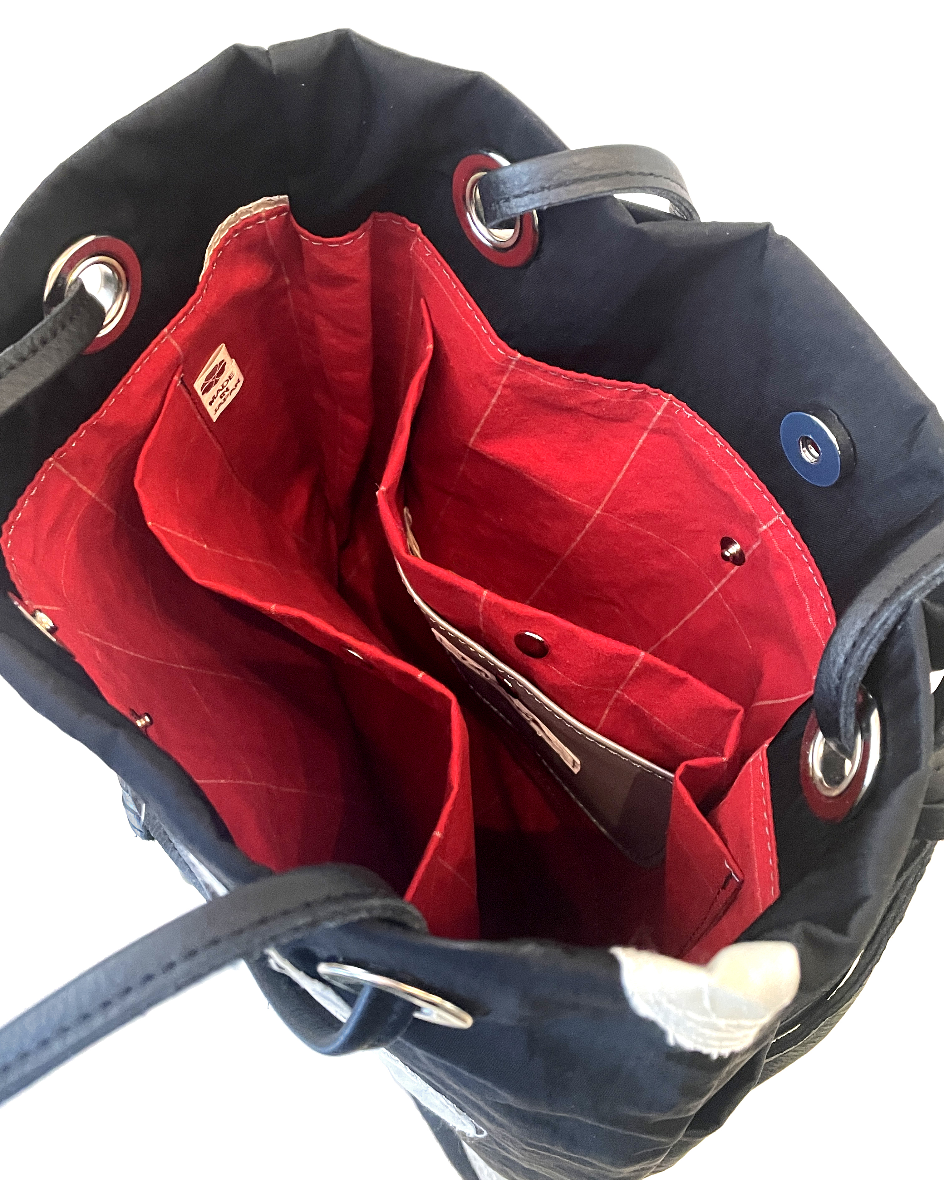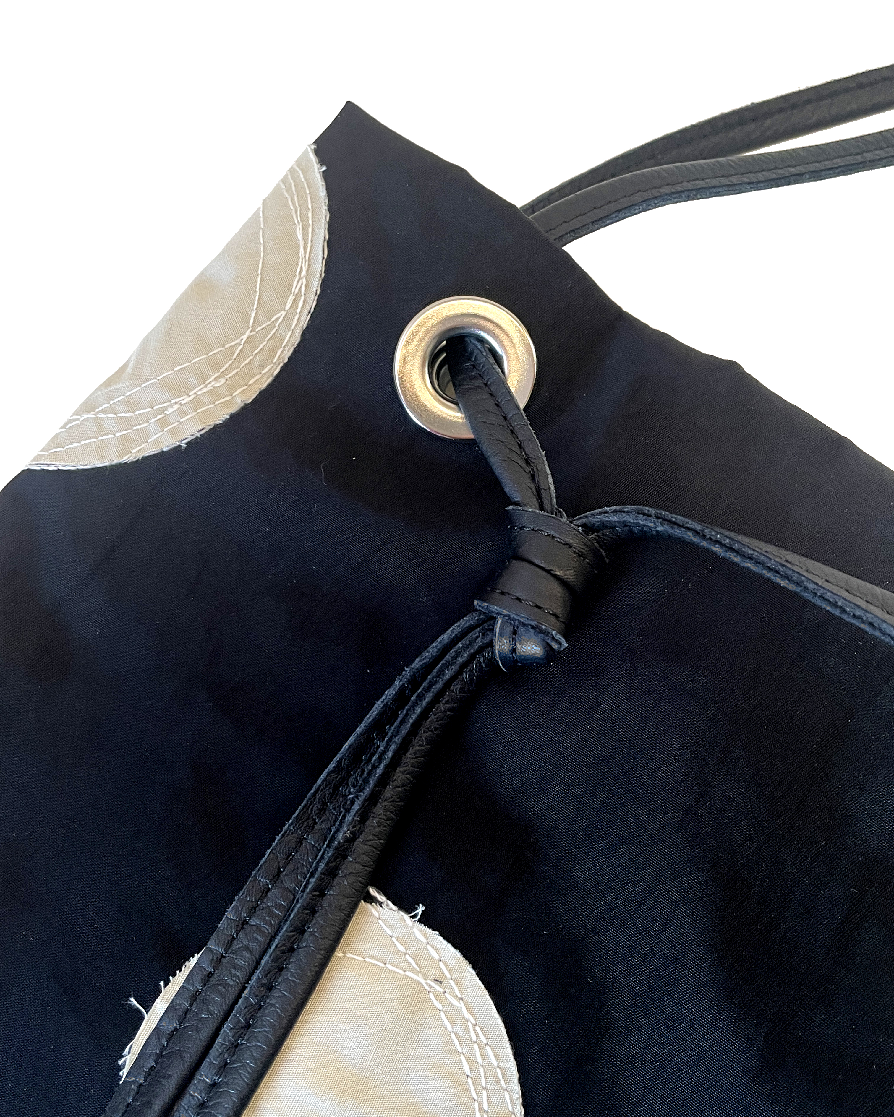 素 材:本体はナイロン生地に丸く抜いたコットン生地を貼りつけ、ステッチを施した刺繍素材です。ベースがナイロン生地なので、非常に軽く仕上がっています。