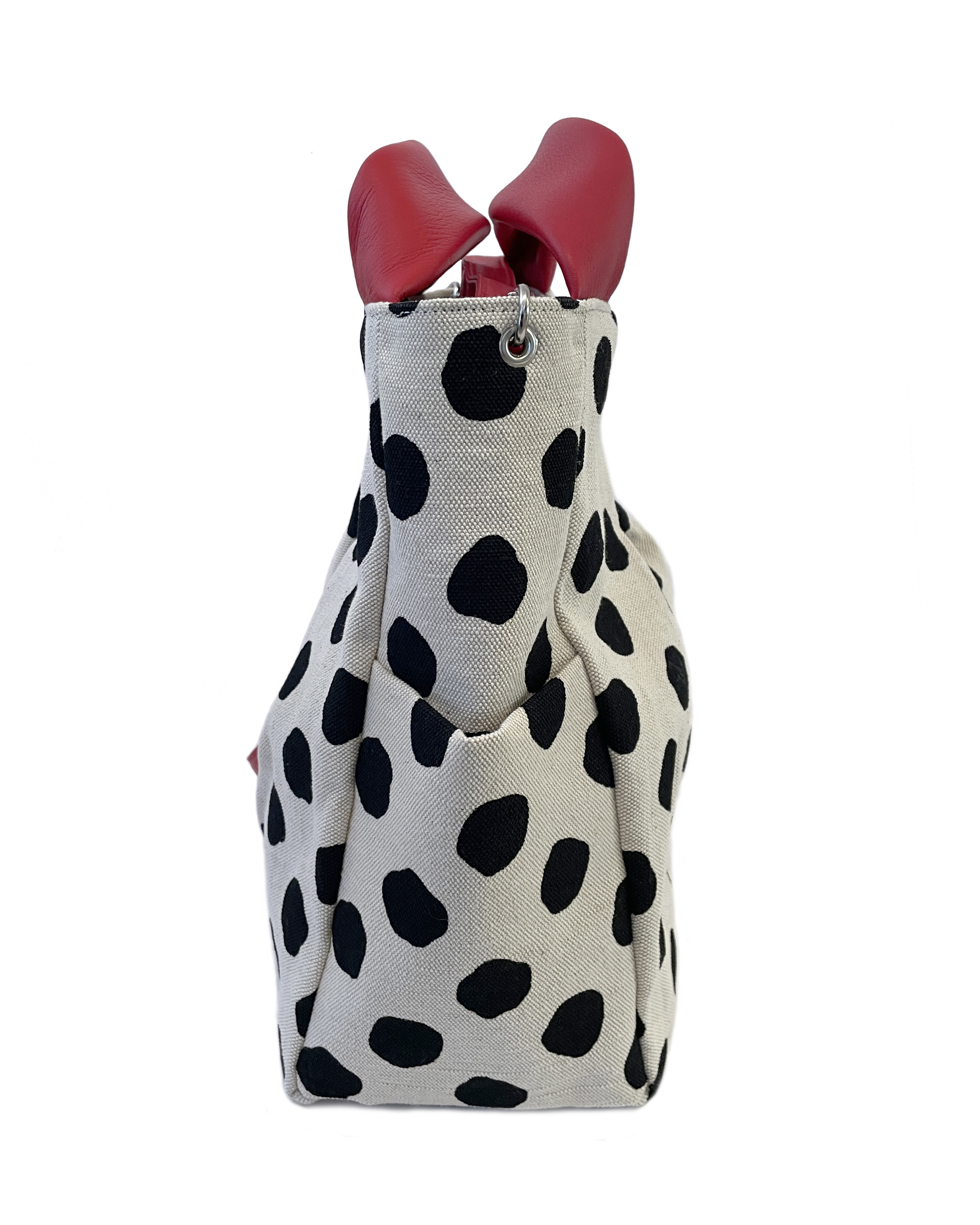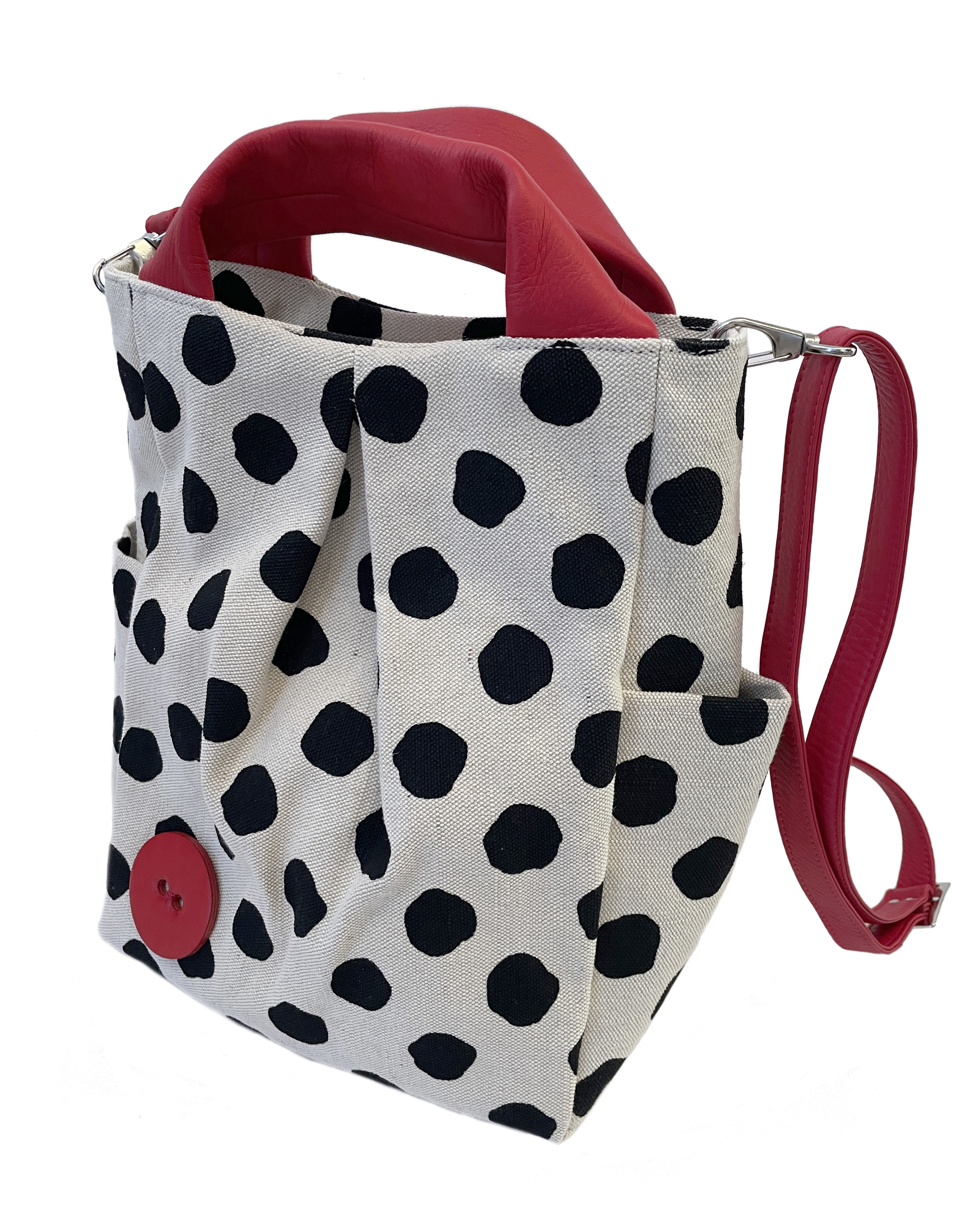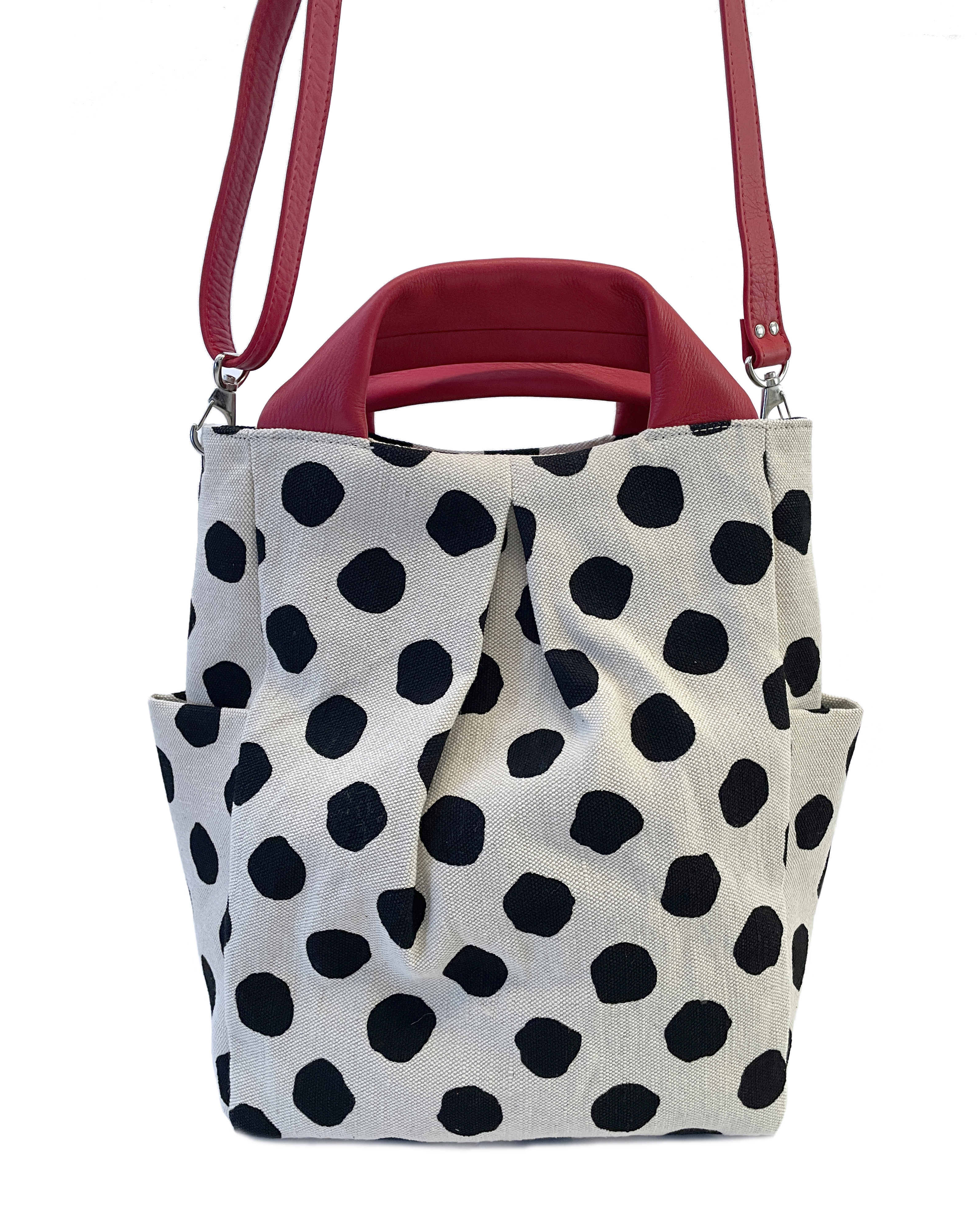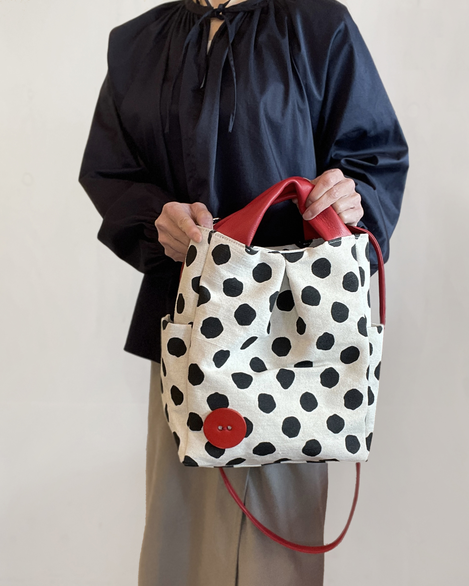 大き目のフリーハンドのドットプリント生地に付属のアカの牛革がアクセント。