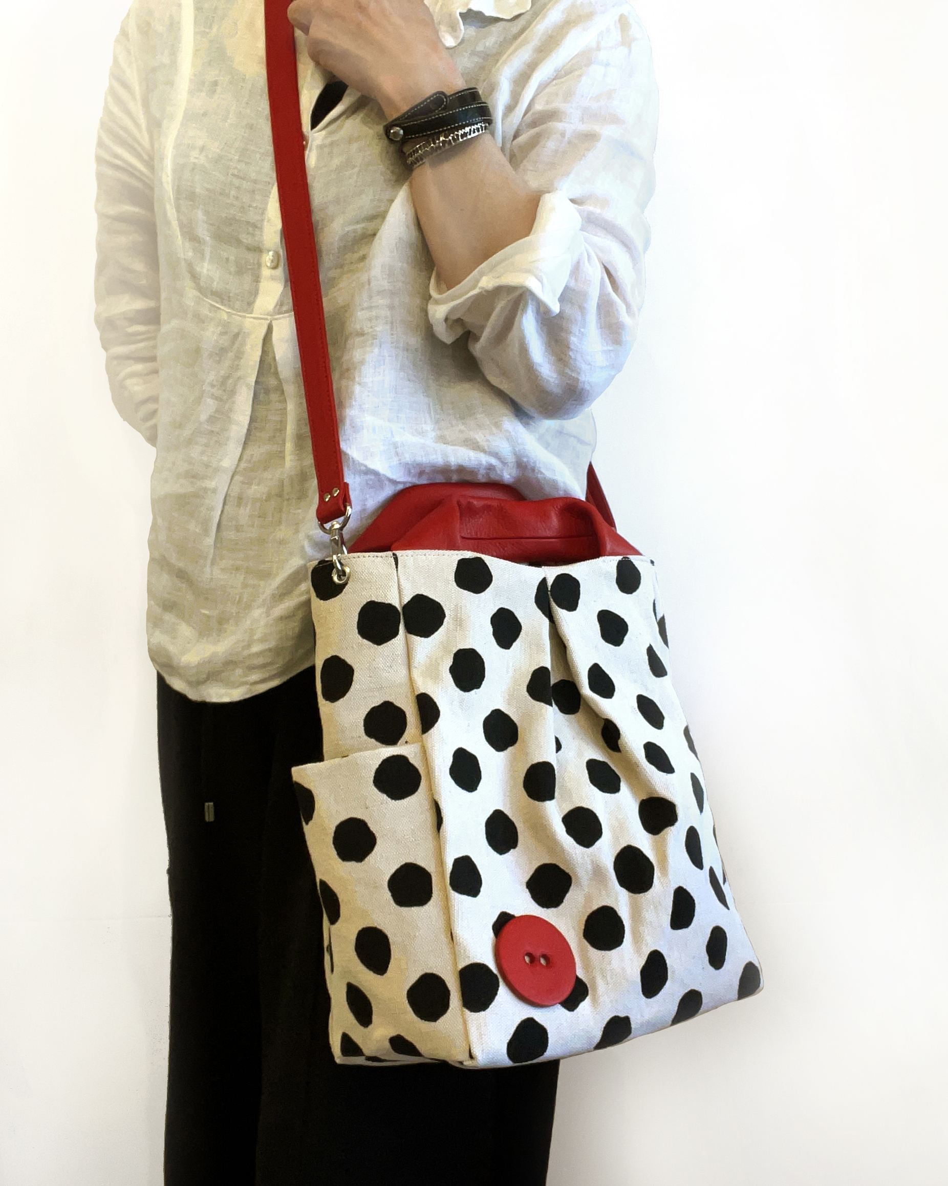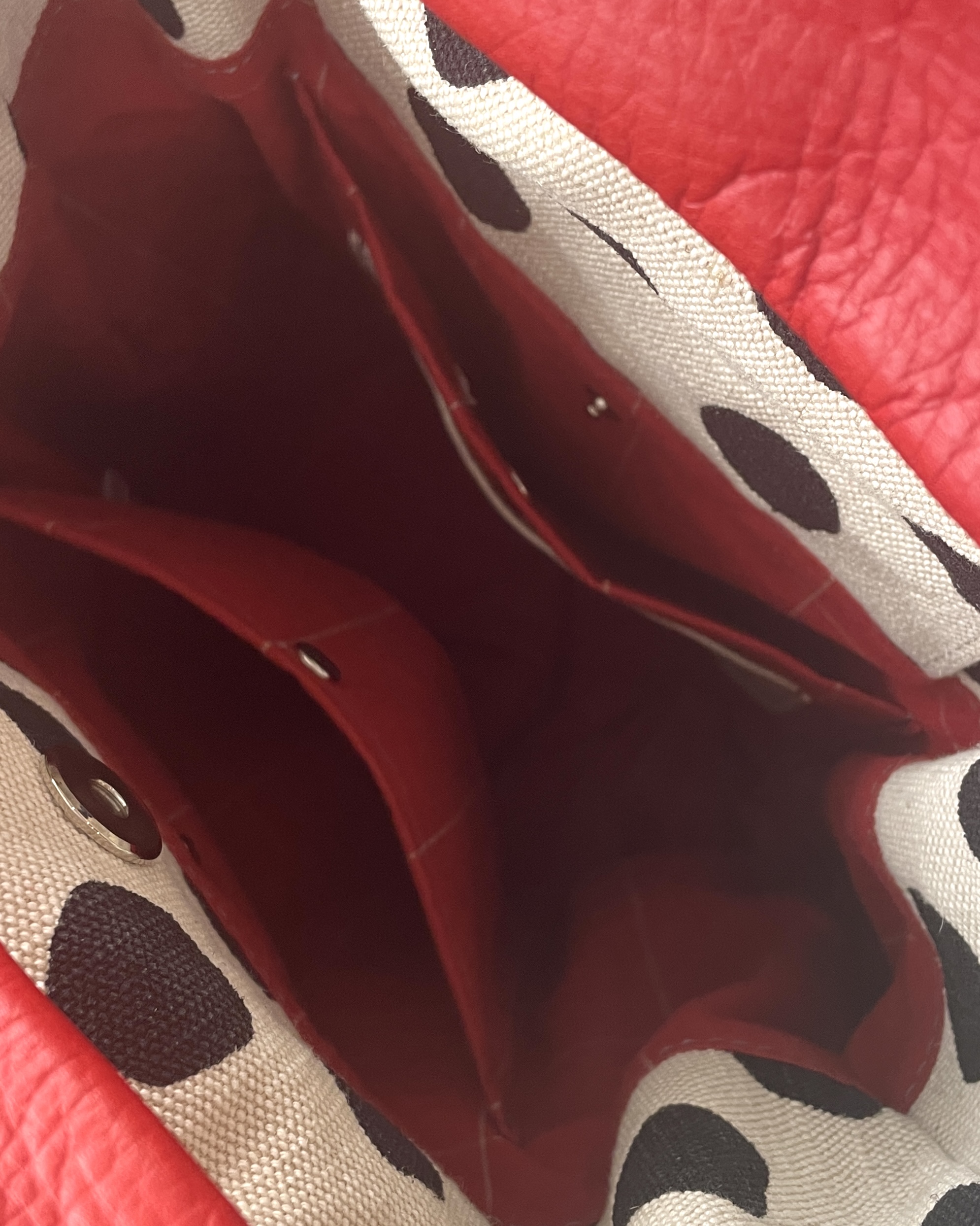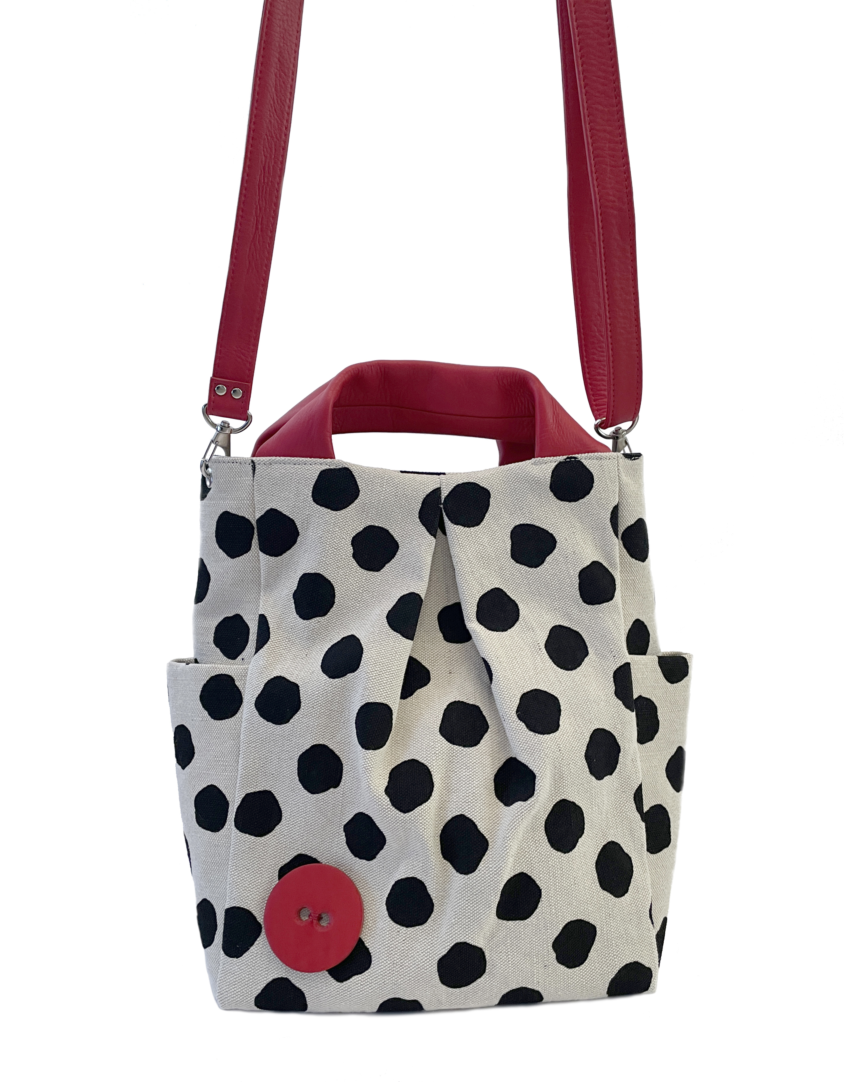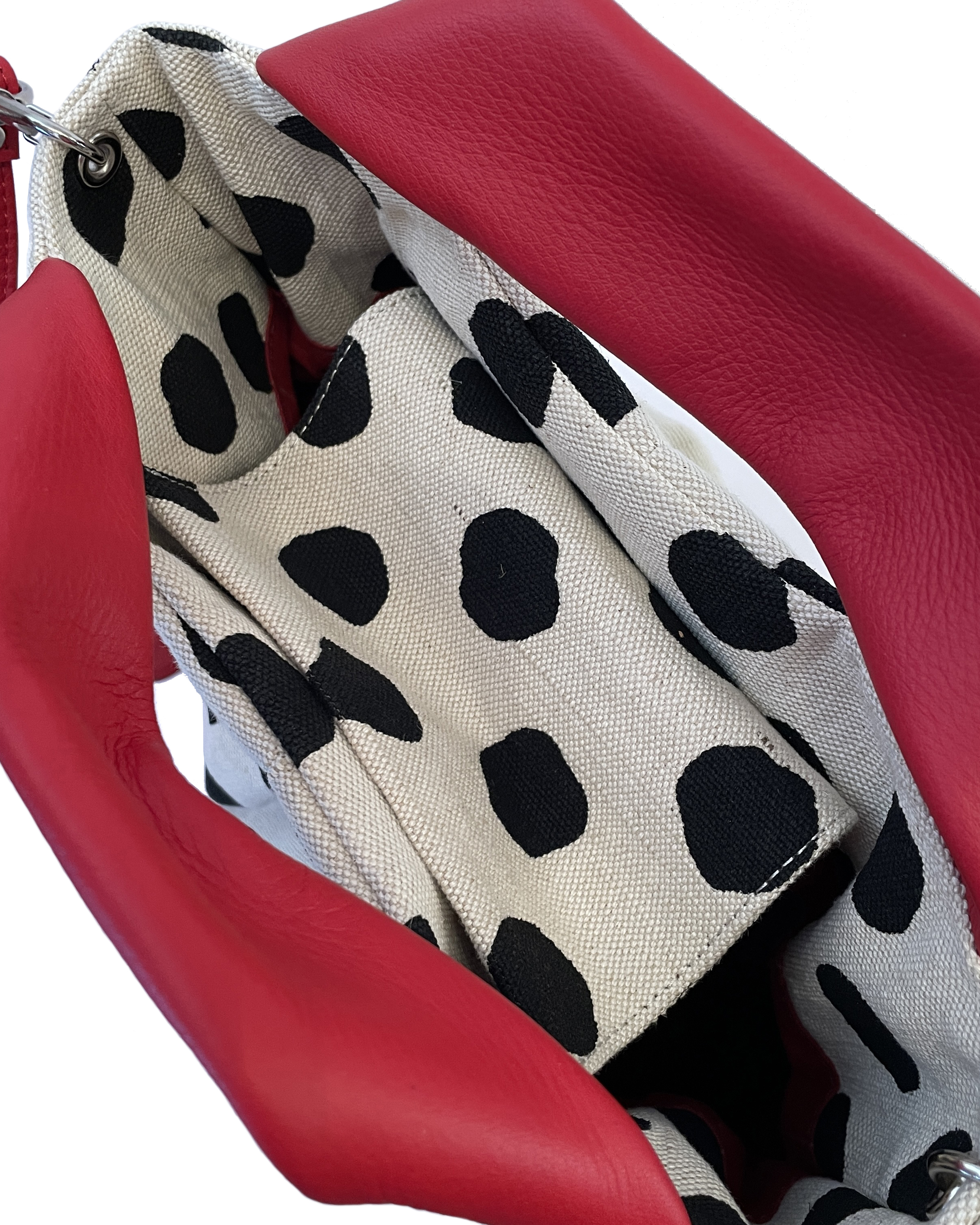 大き目のフリーハンドのドットプリント生地に付属のアカの牛革がアクセント。