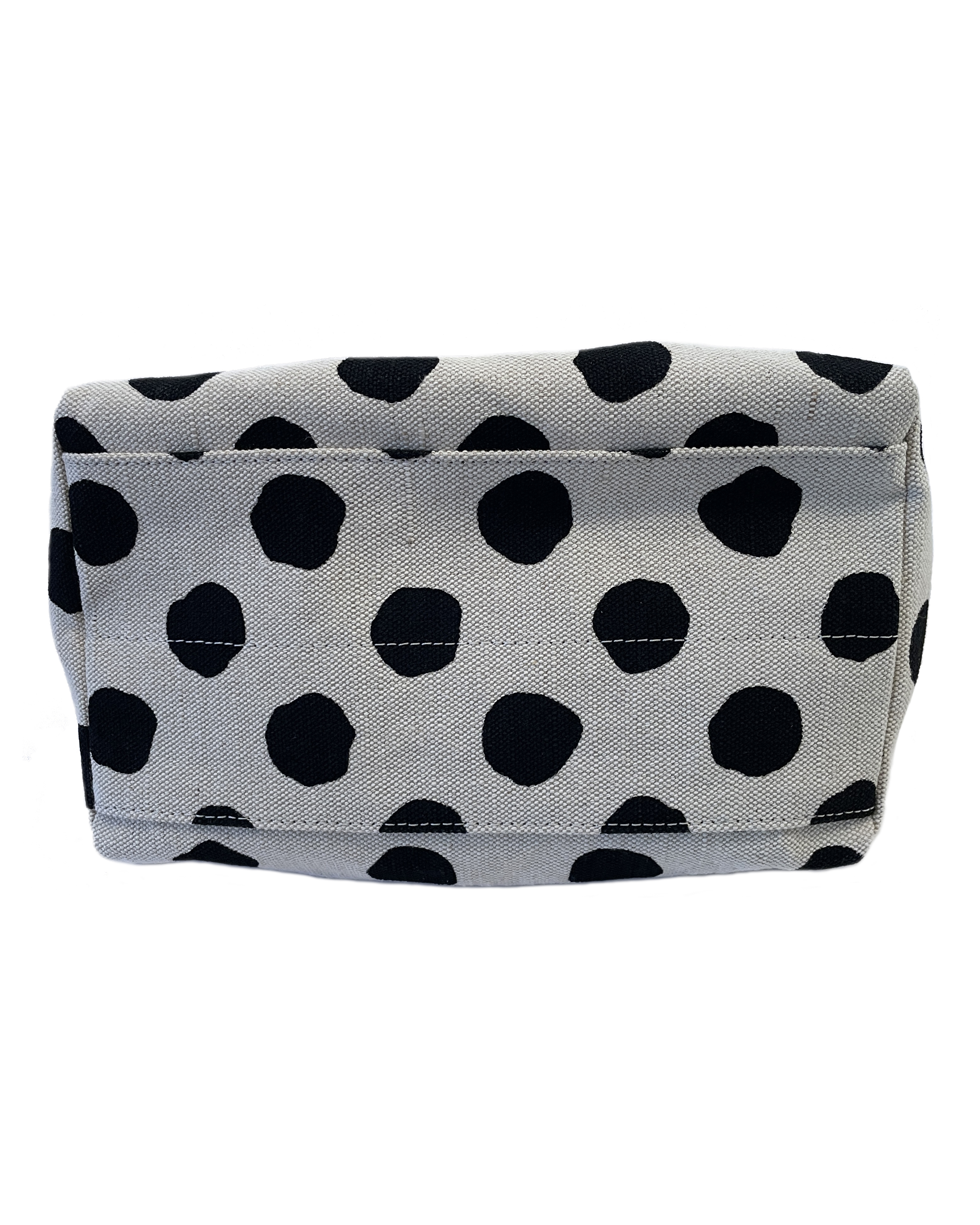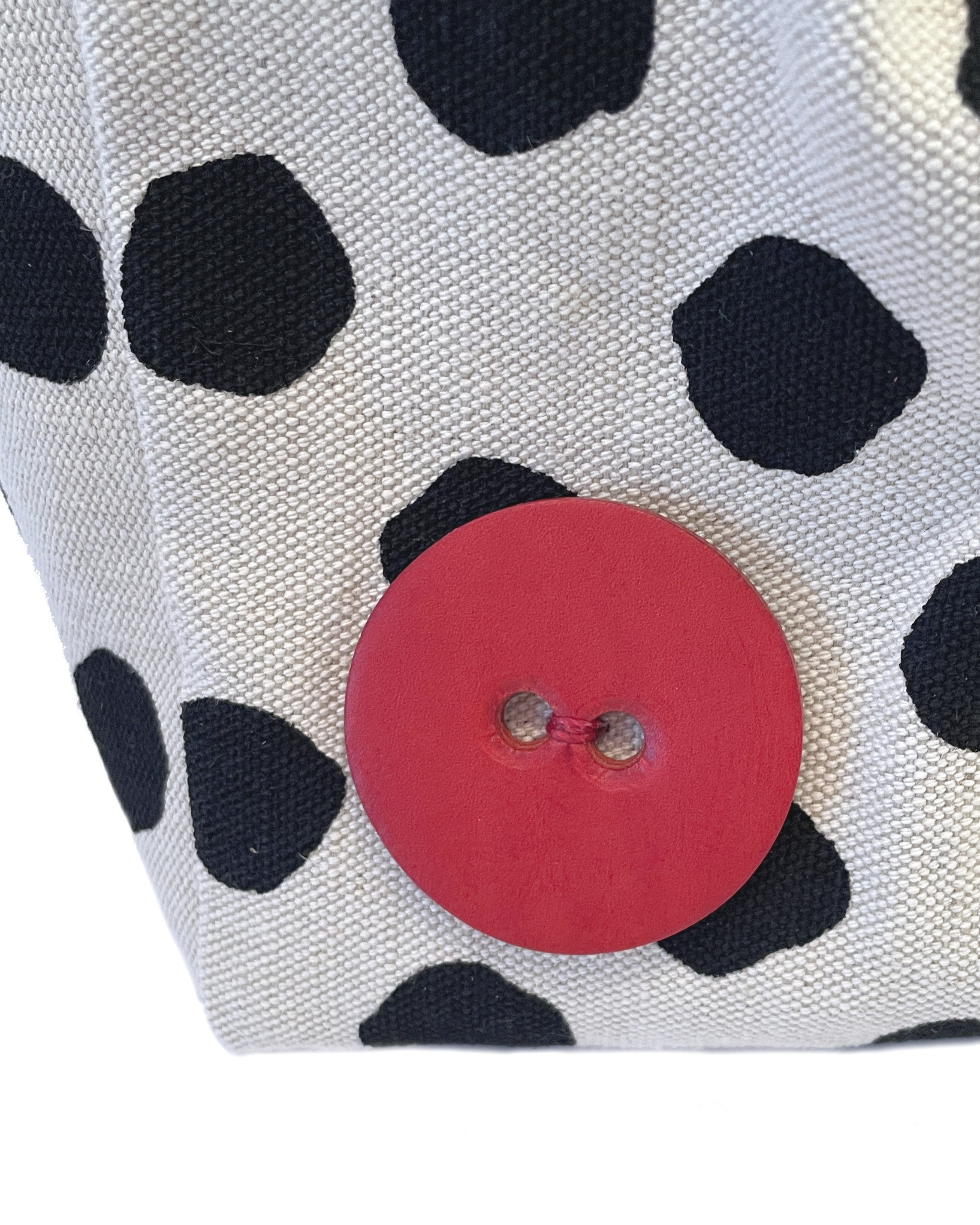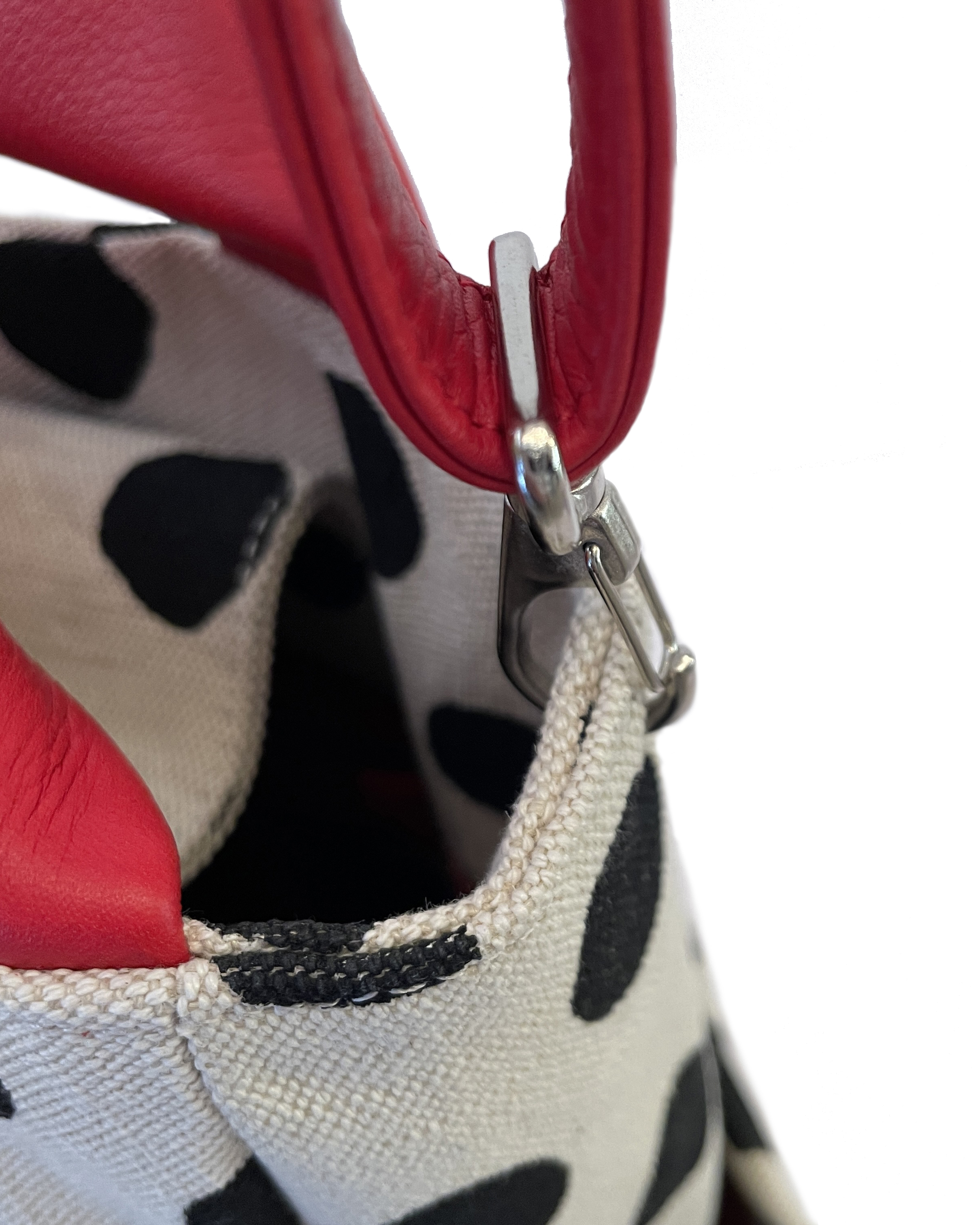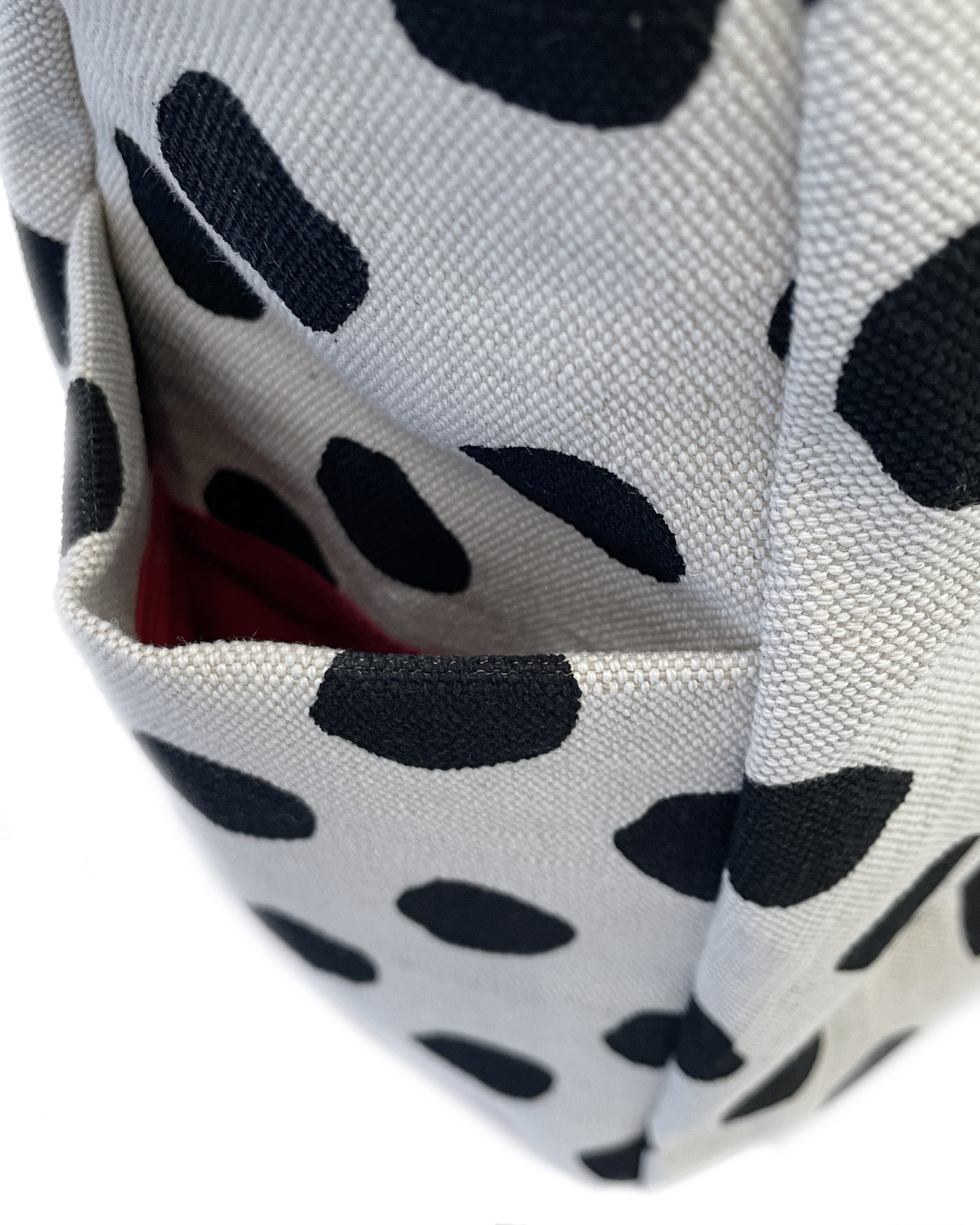 大き目のフリーハンドのドットプリント生地に付属のアカの牛革がアクセント。