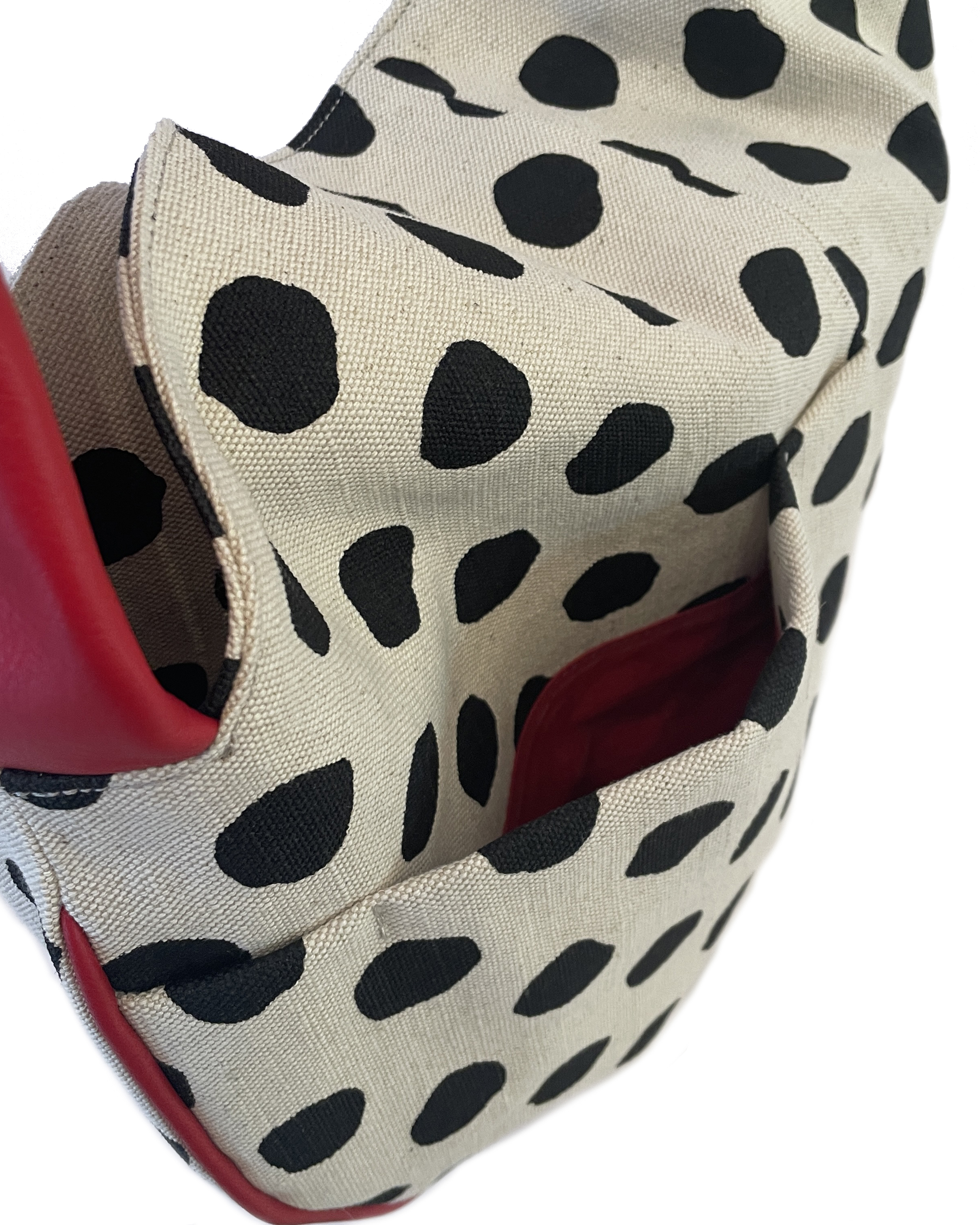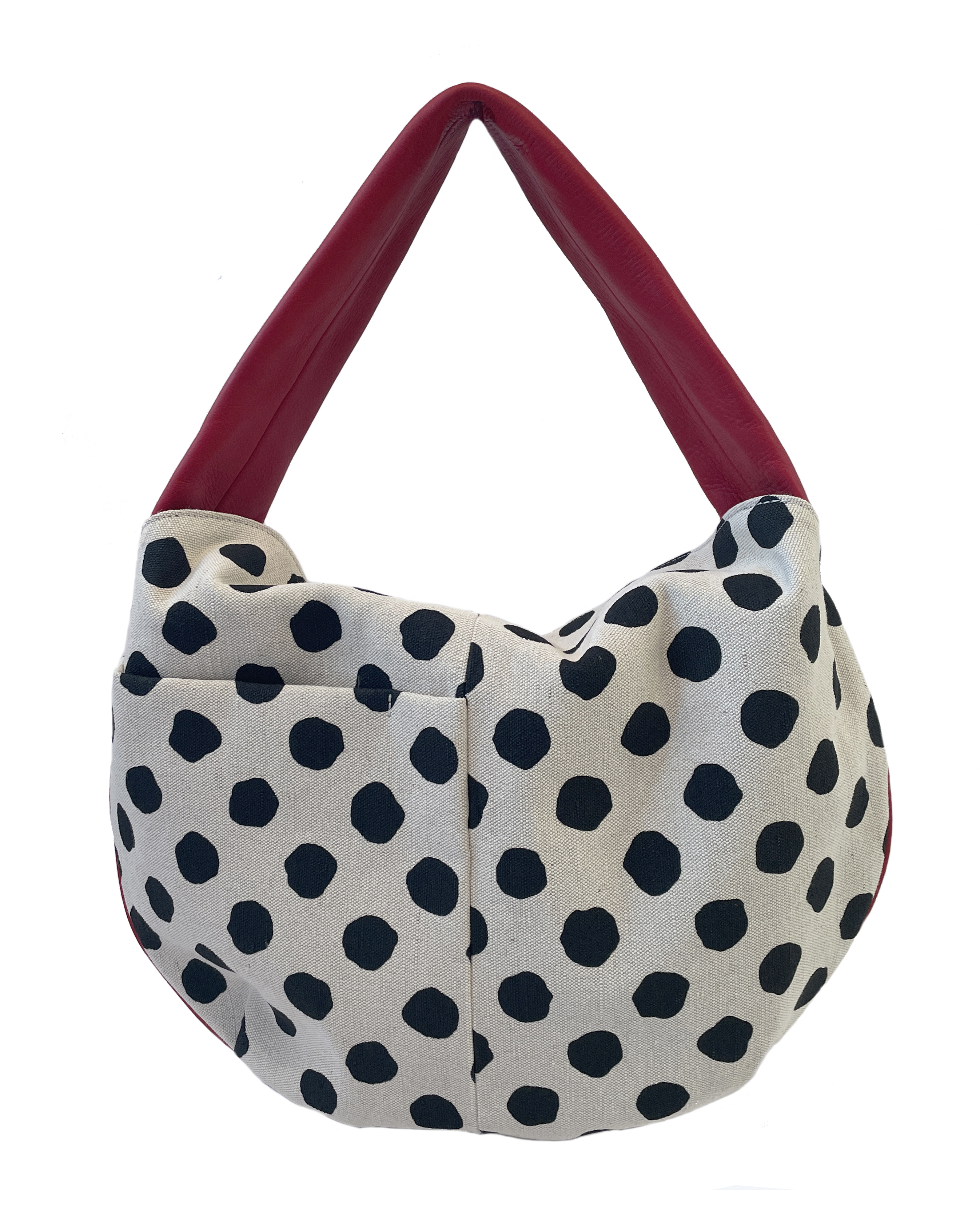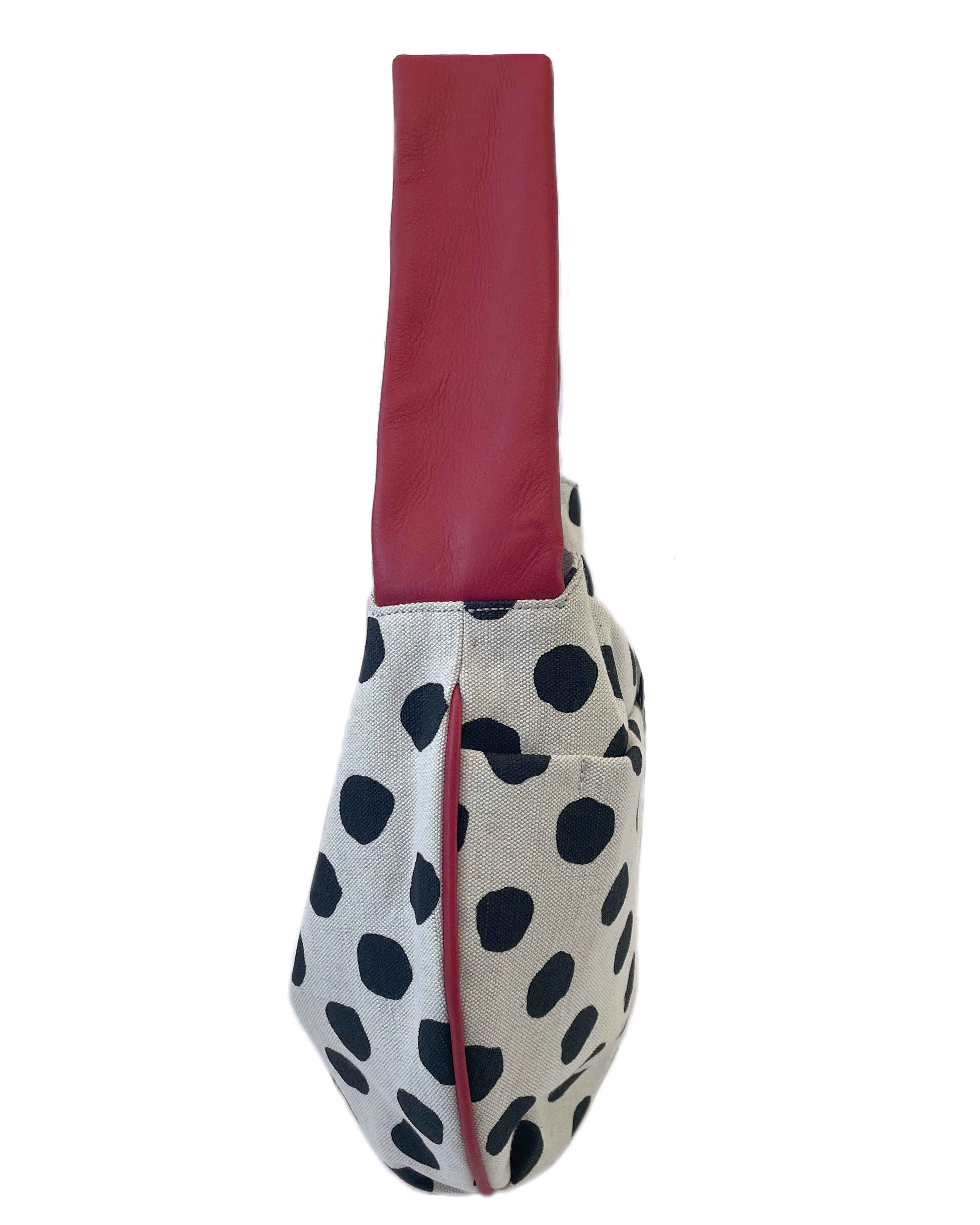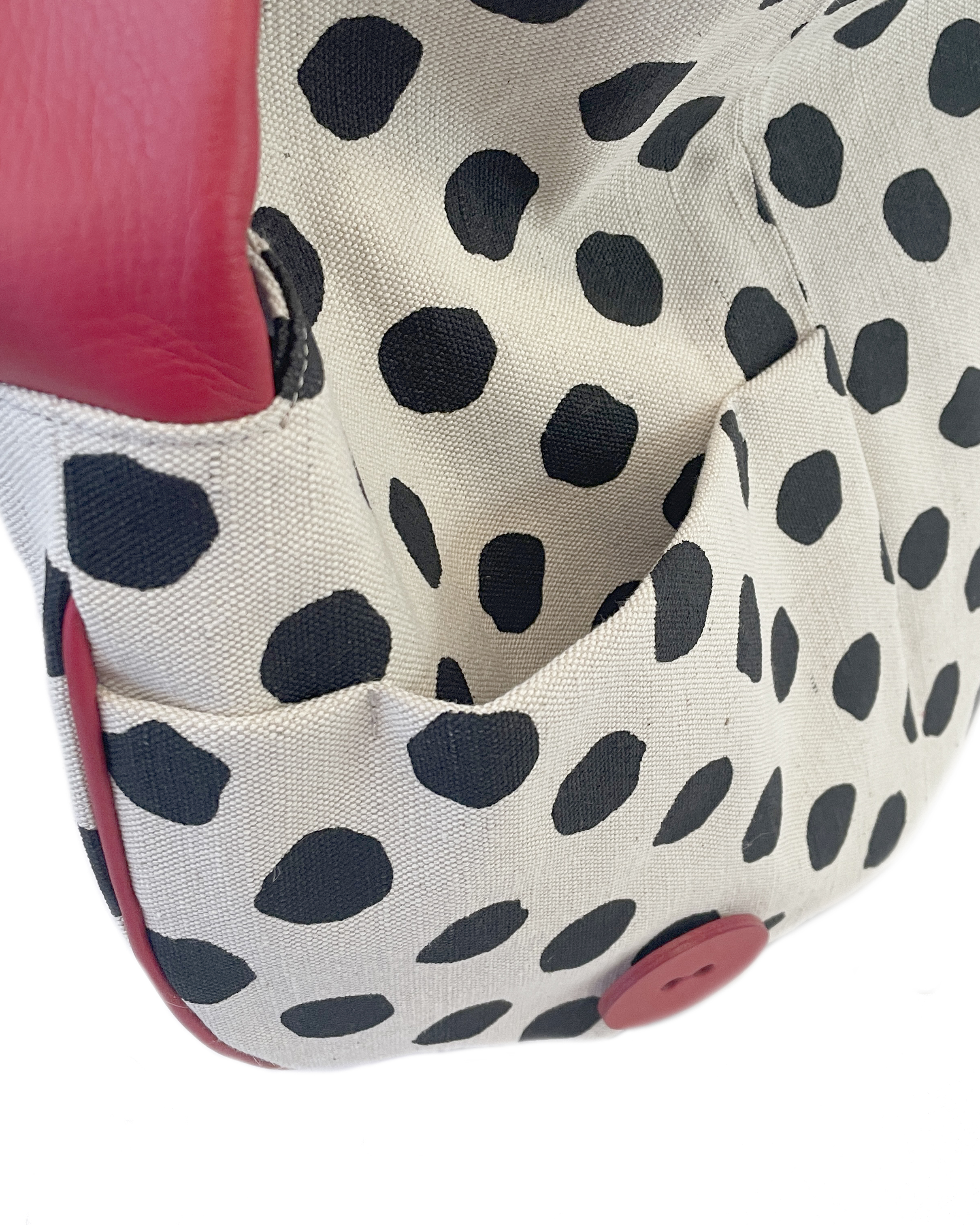 大き目のフリーハンドのドットプリント生地に付属のアカの牛革がアクセント。