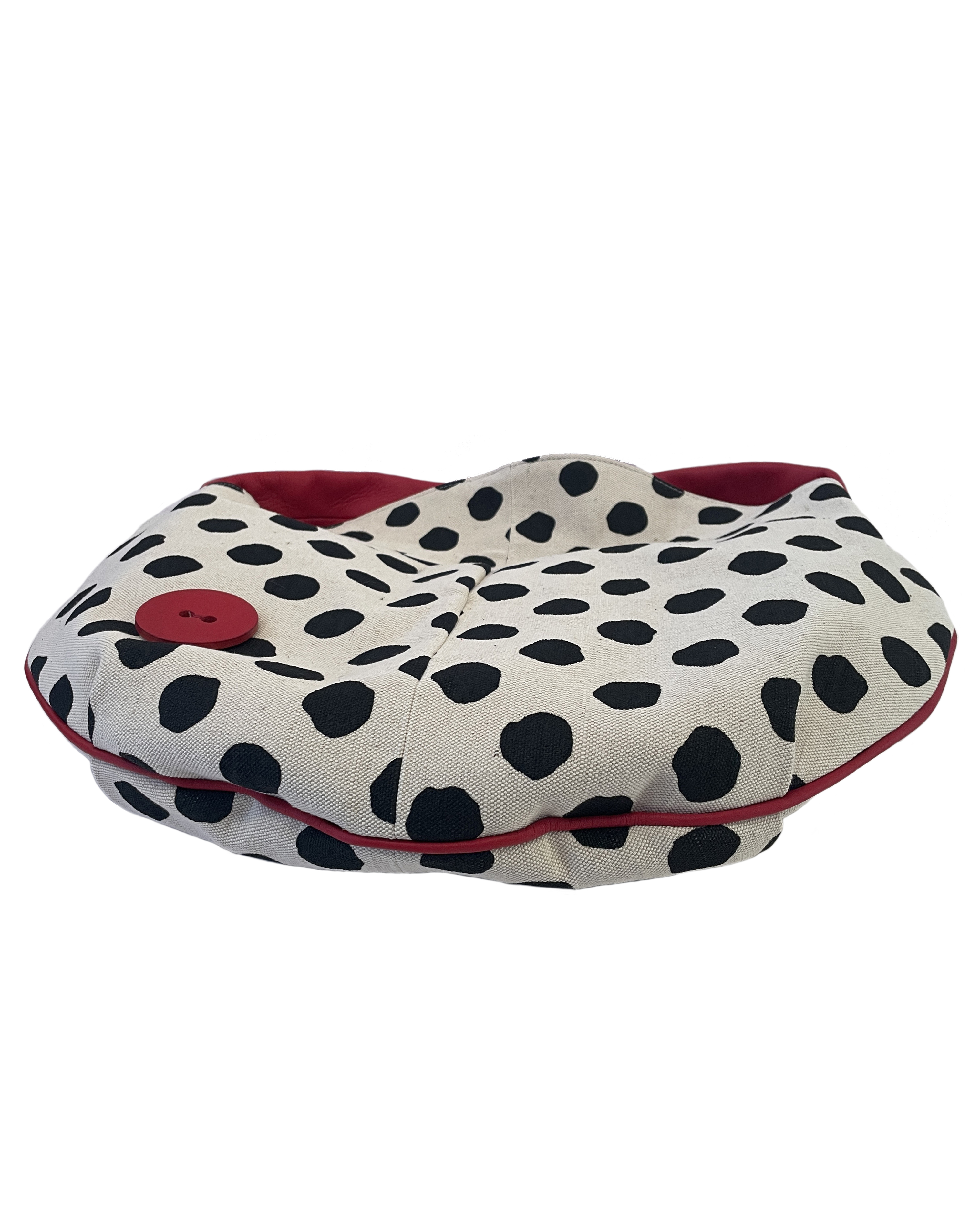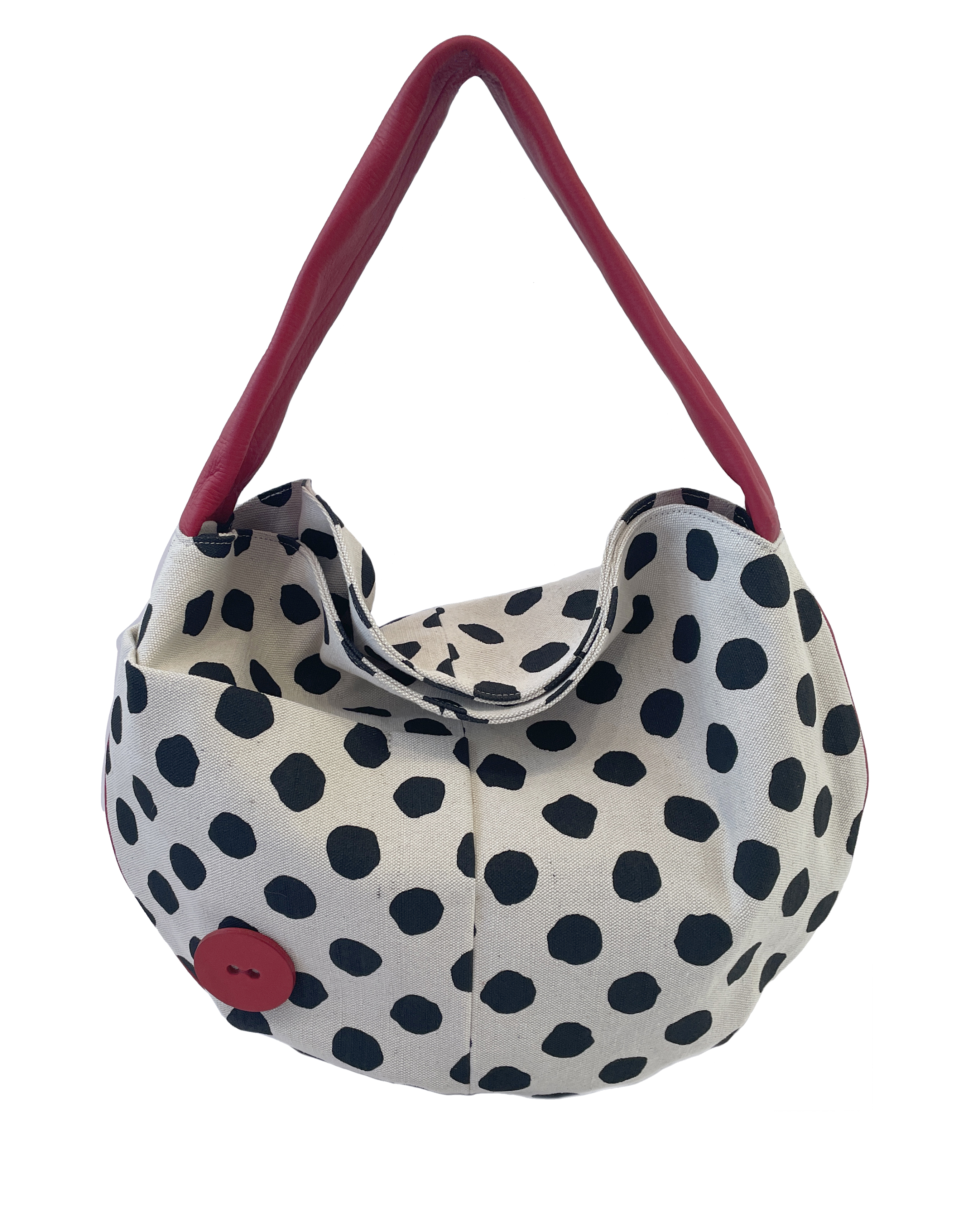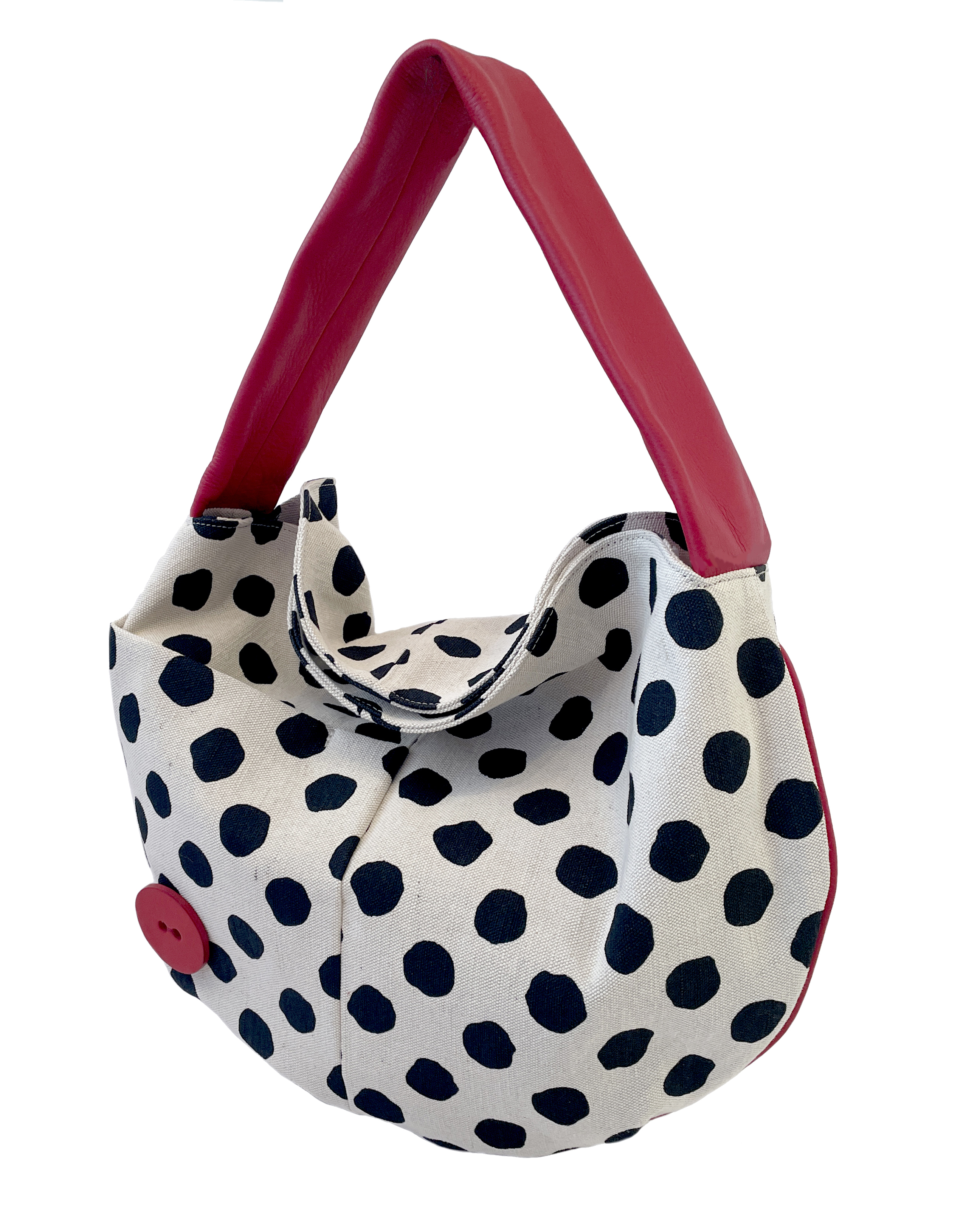 大き目のフリーハンドのドットプリント生地に付属のアカの牛革がアクセント。