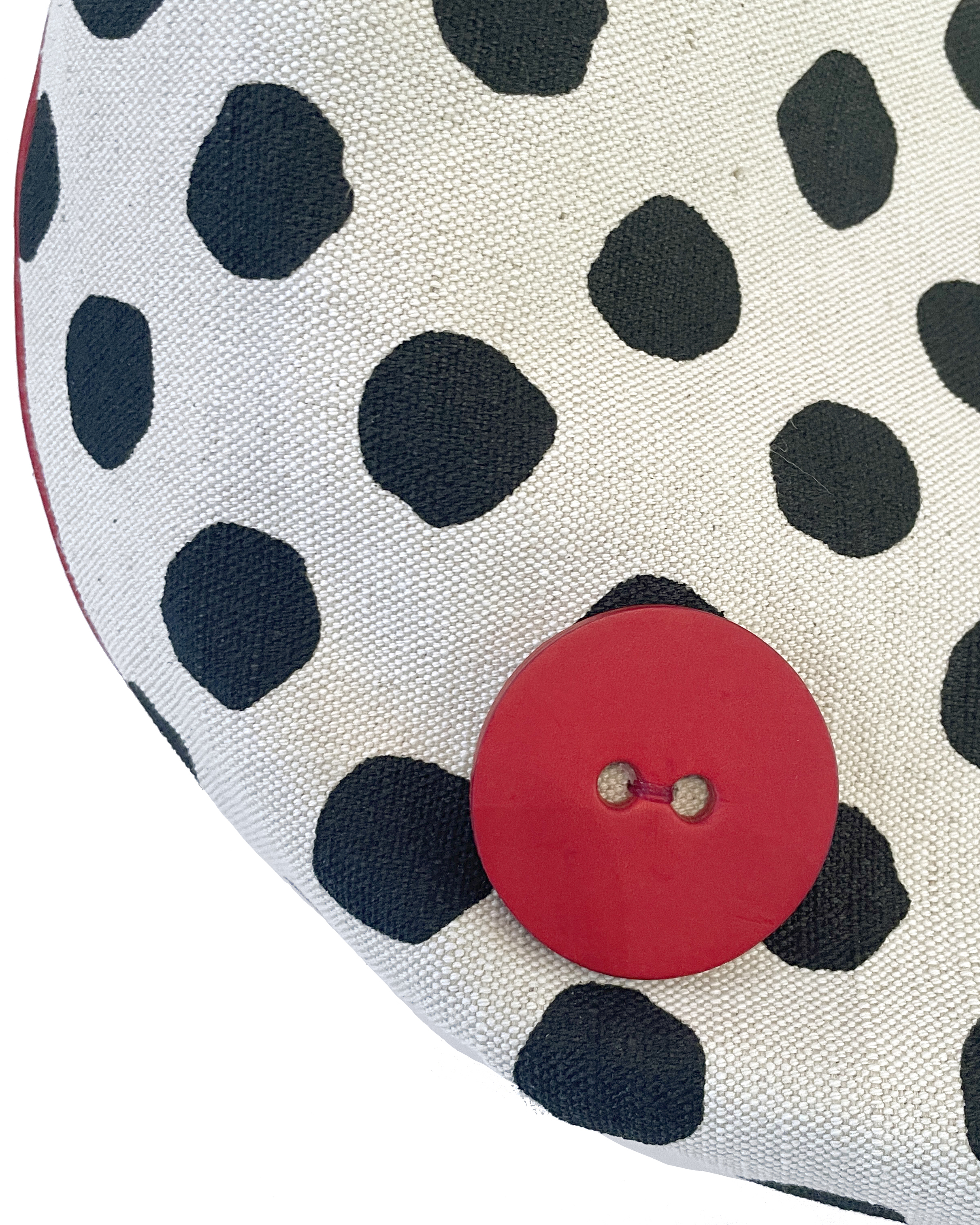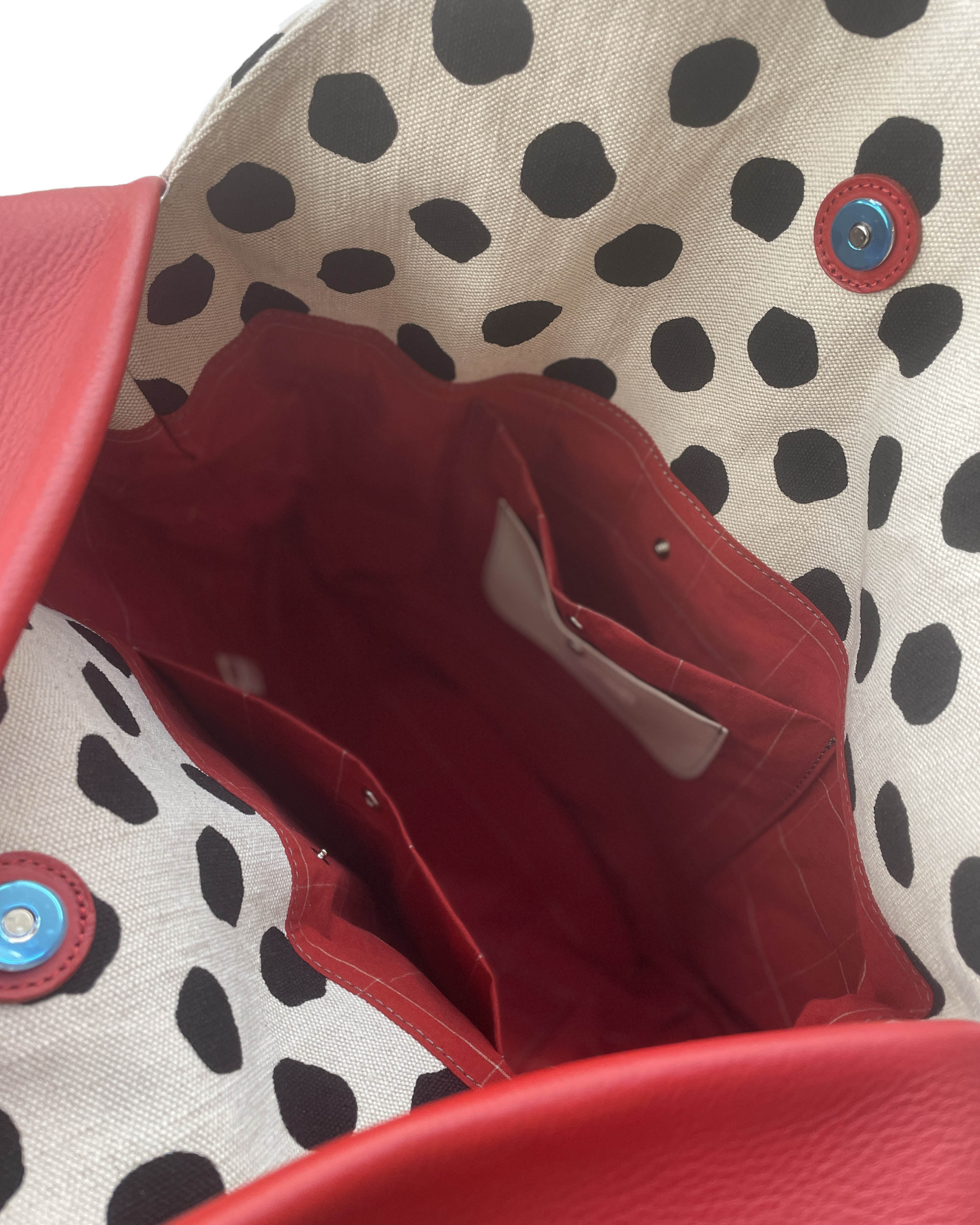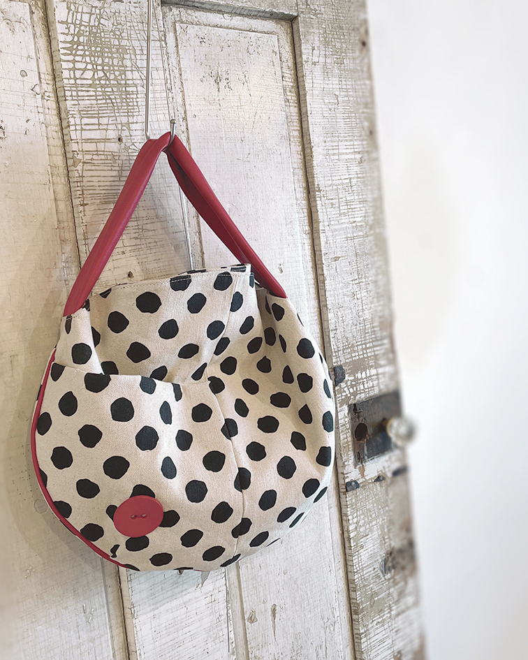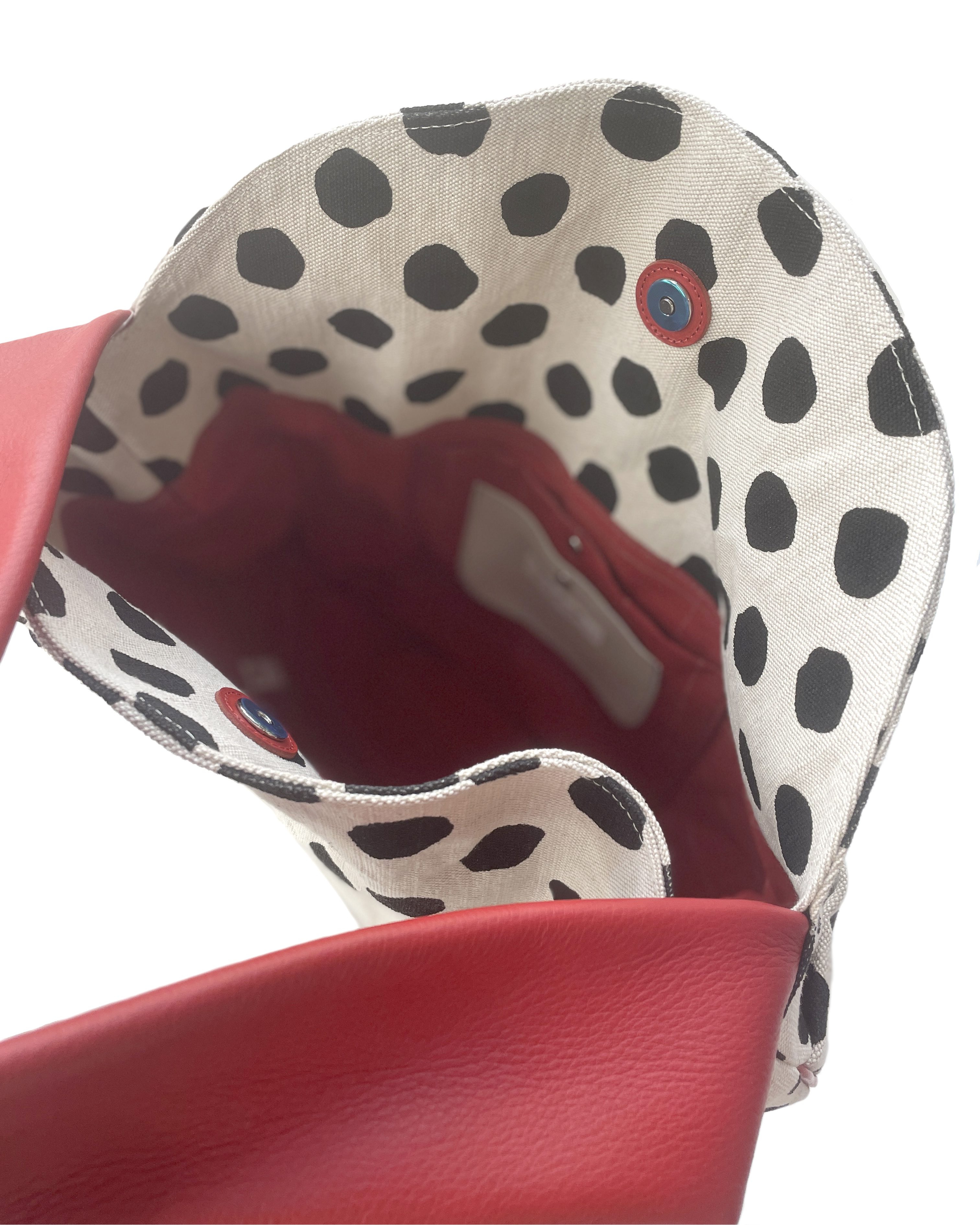 大き目のフリーハンドのドットプリント生地に付属のアカの牛革がアクセント。