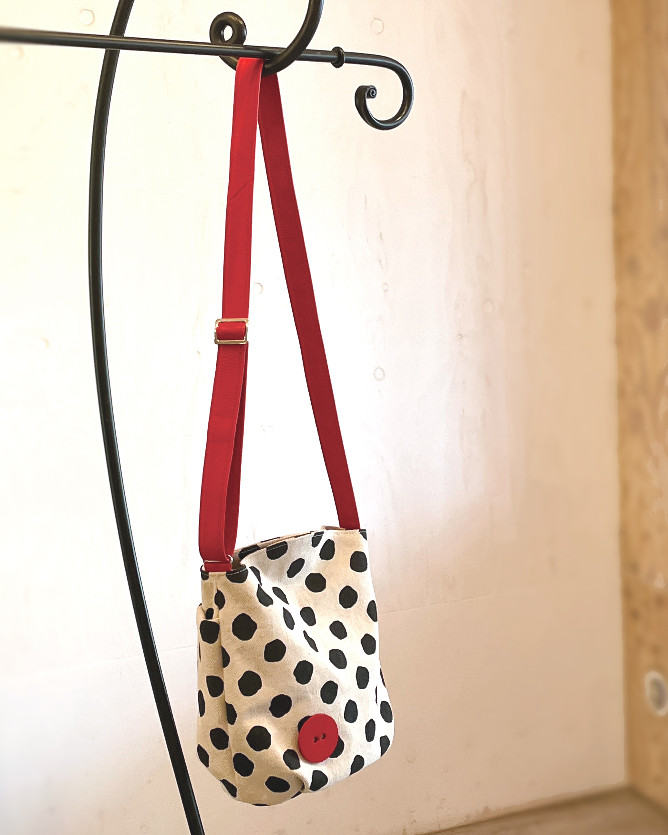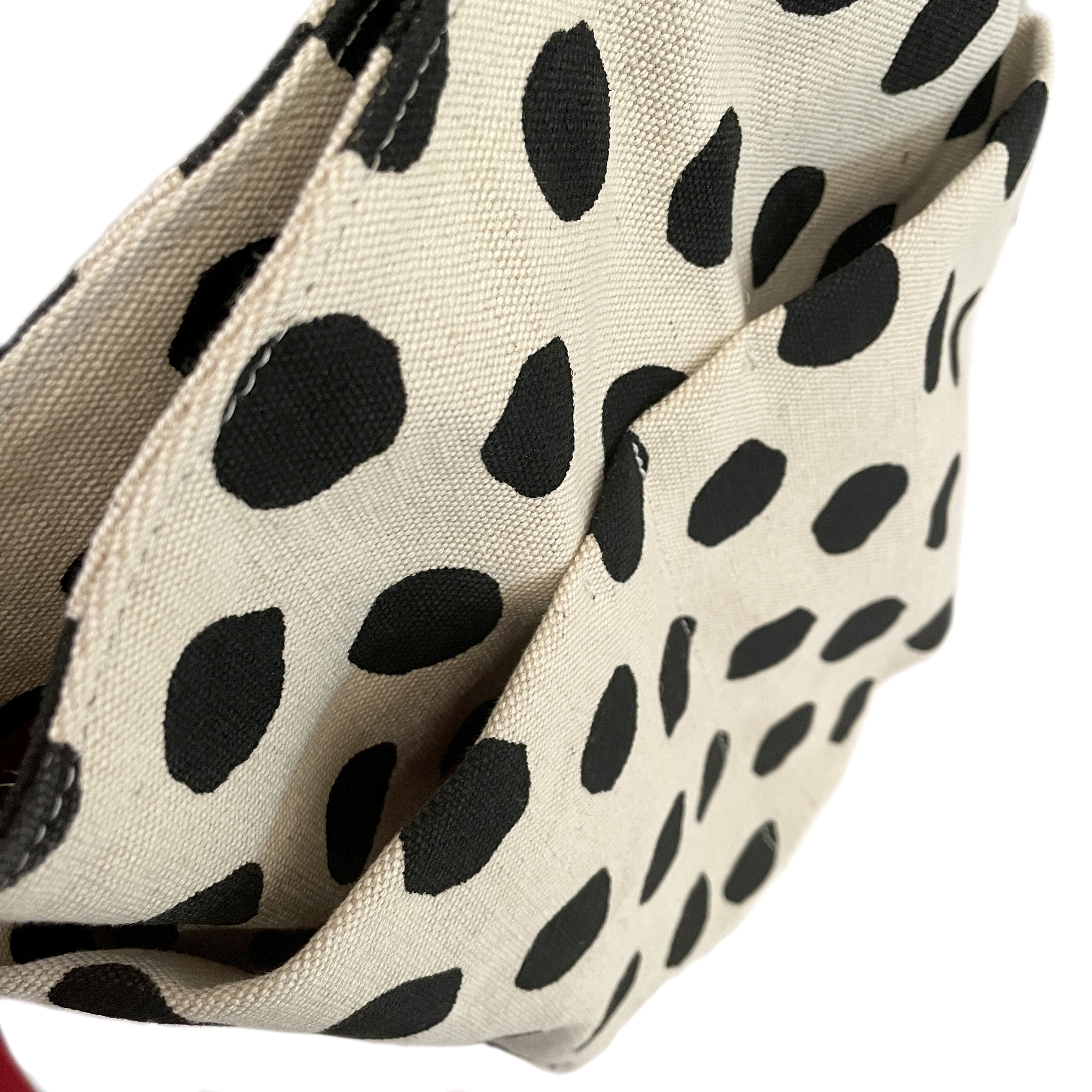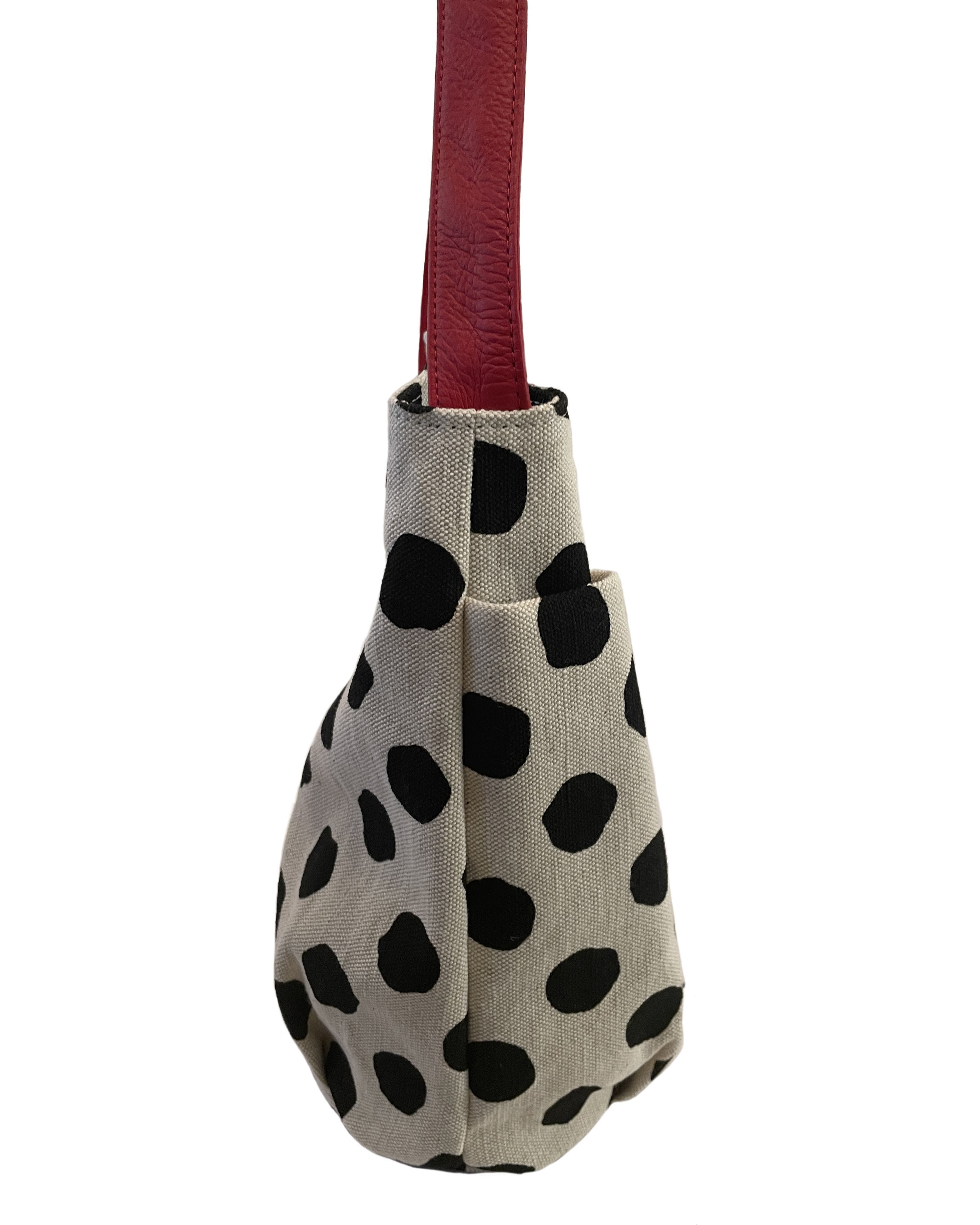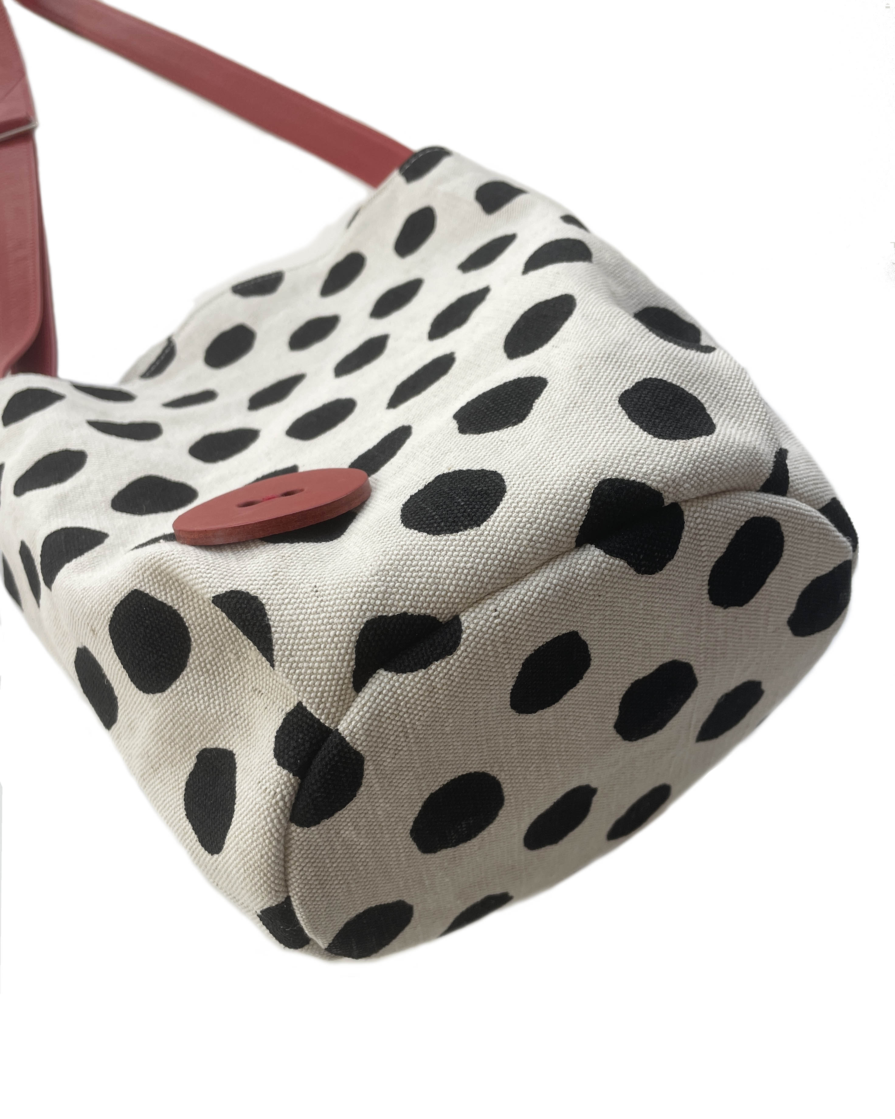 大き目のフリーハンドのドットプリント生地に付属のアカの牛革がアクセント。