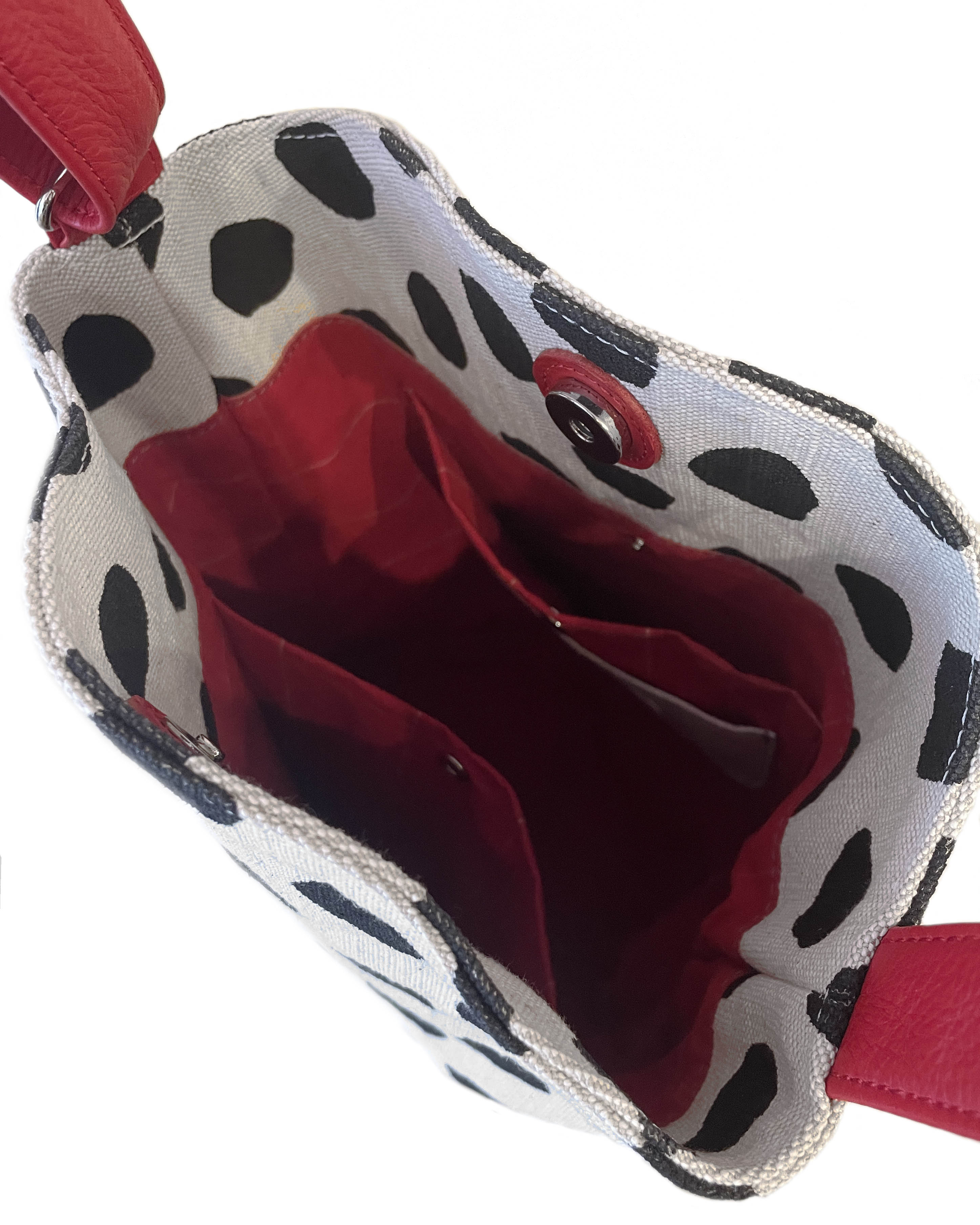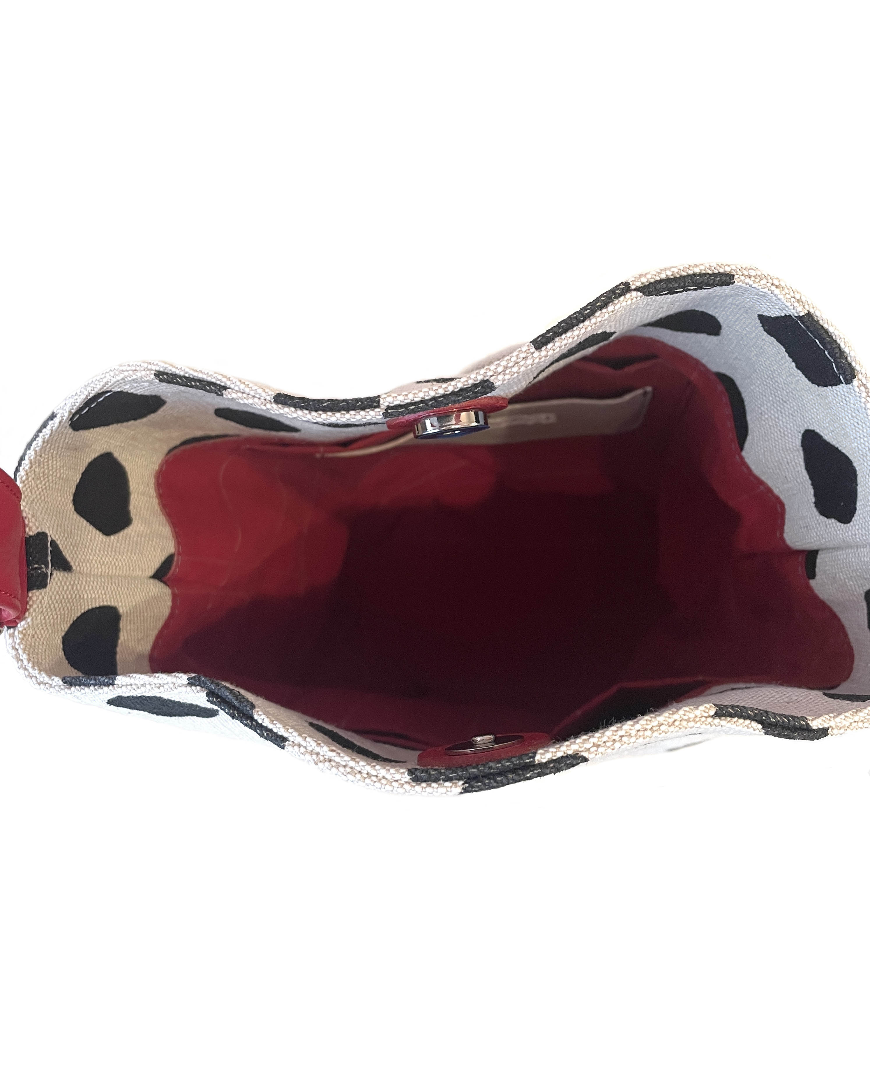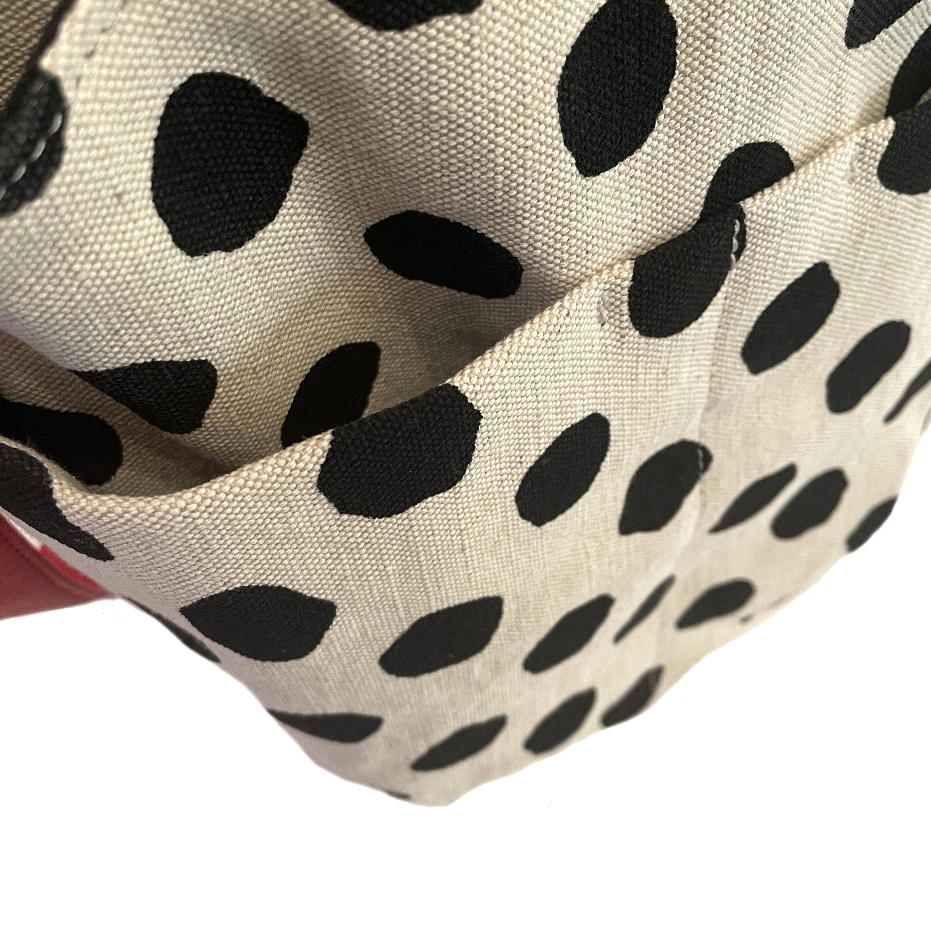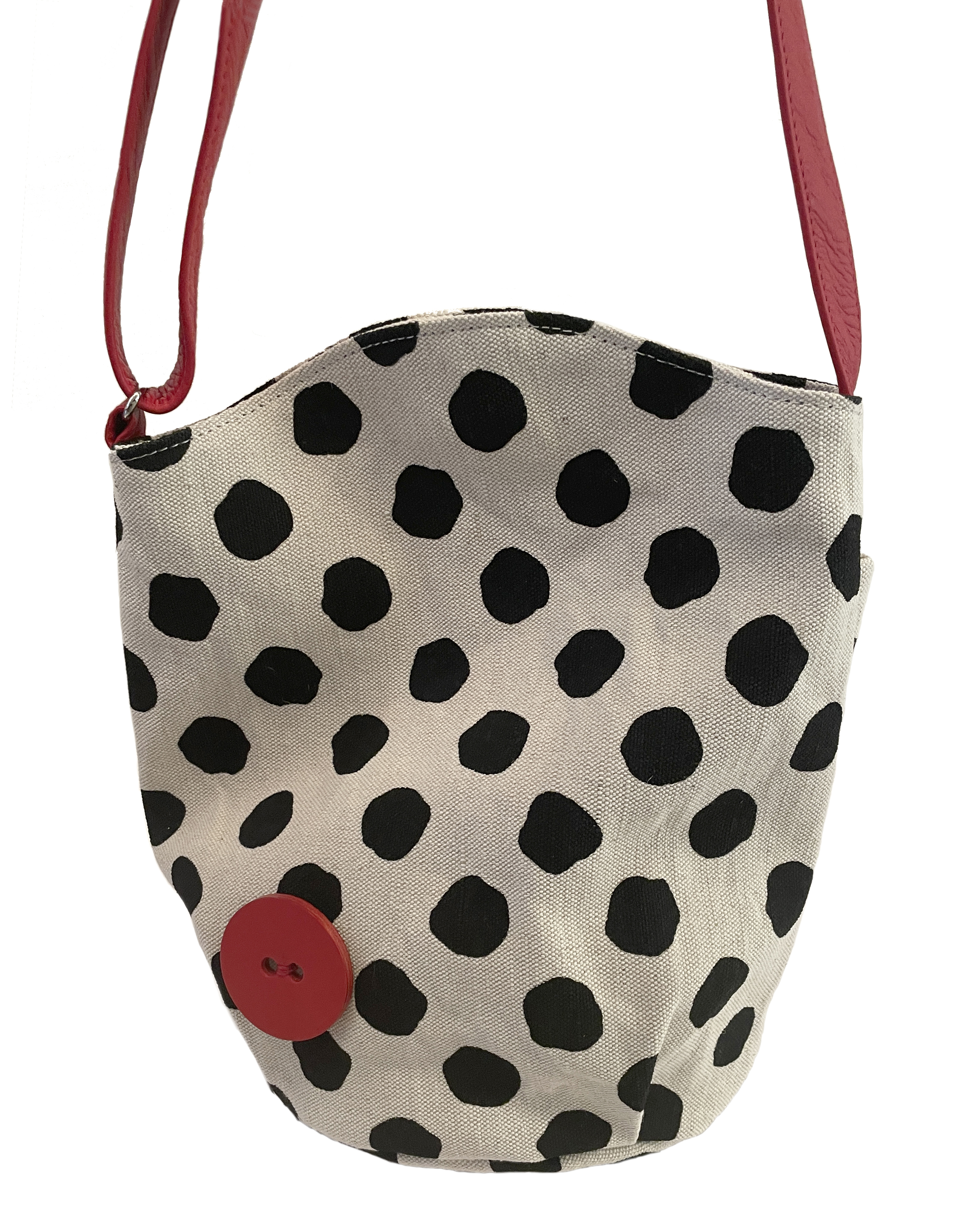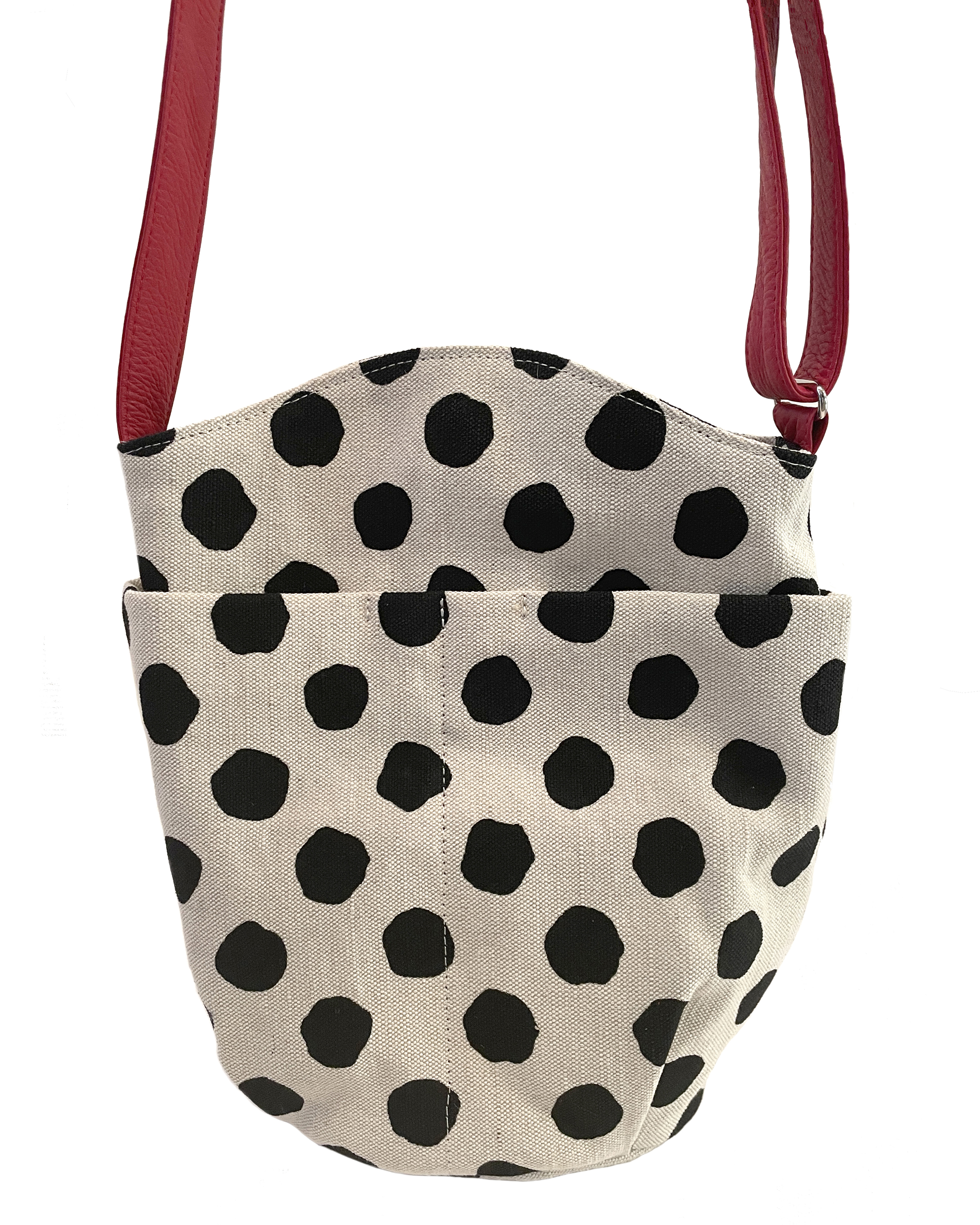 大き目のフリーハンドのドットプリント生地に付属のアカの牛革がアクセント。