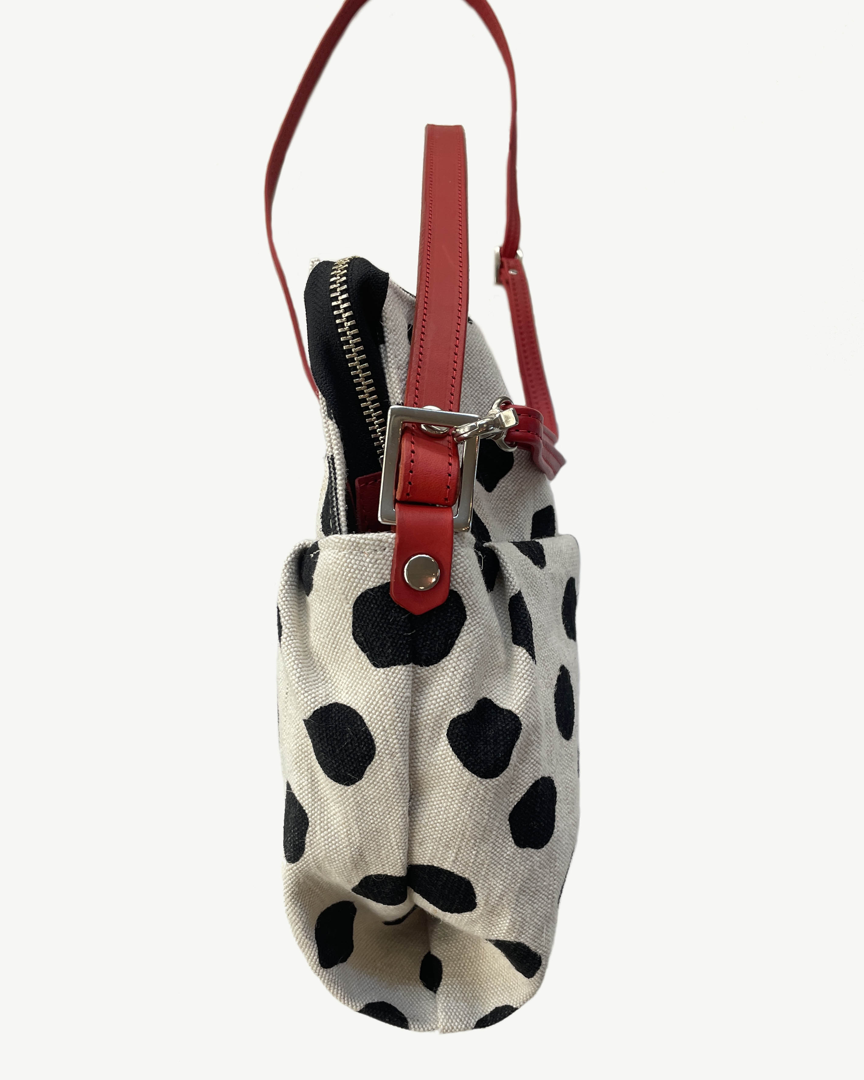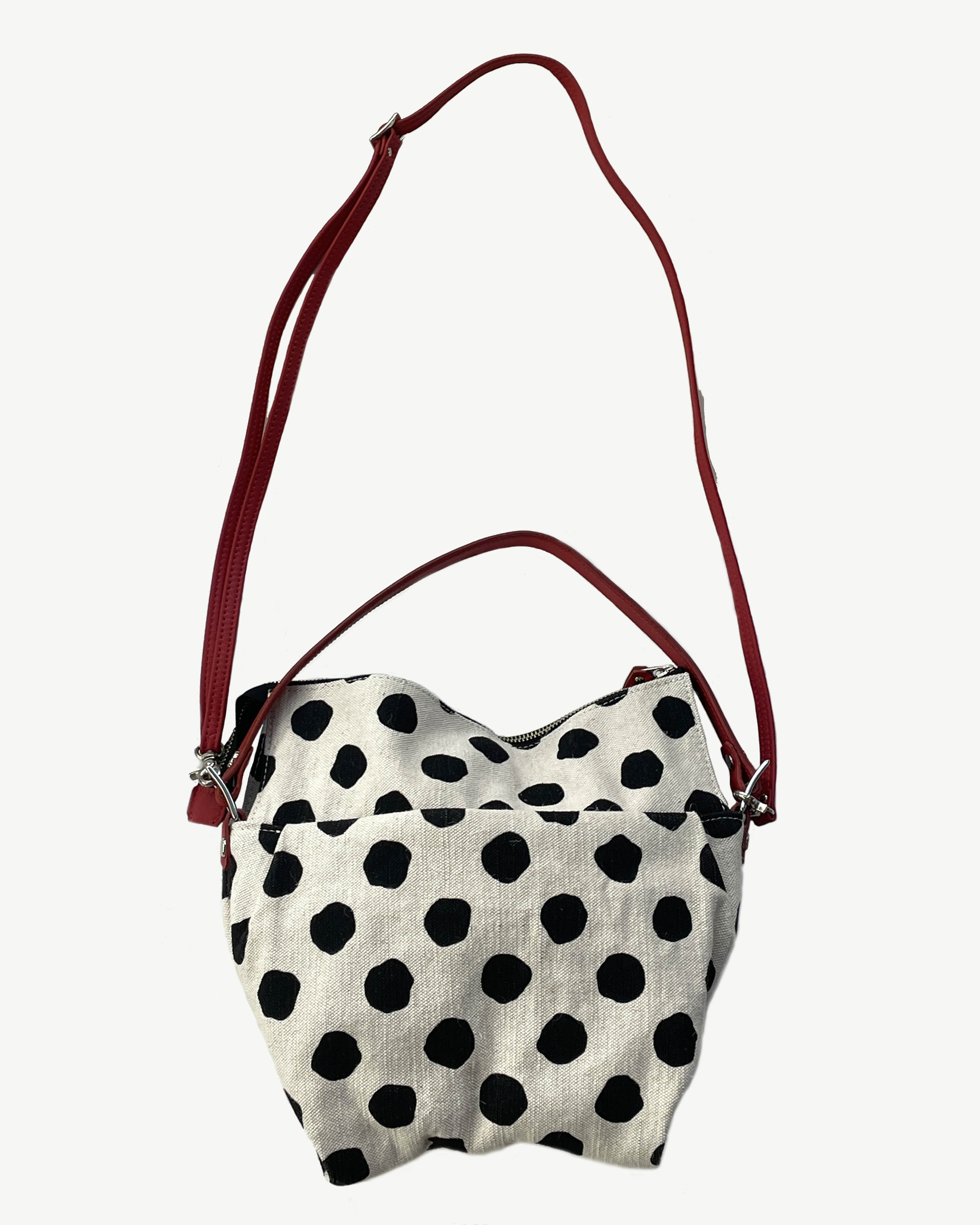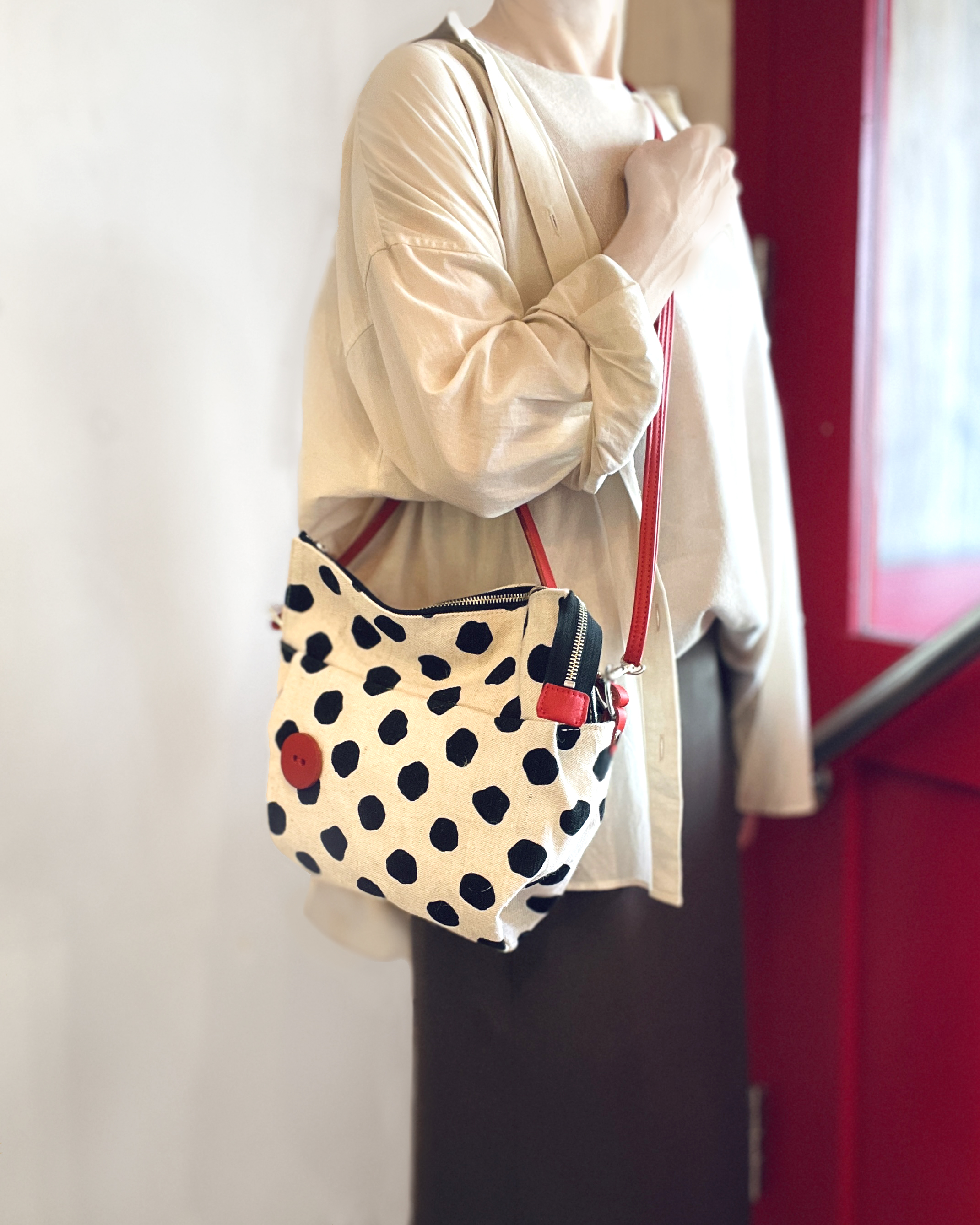 大き目のフリーハンドのドットプリント生地に付属のアカの牛革がアクセント。