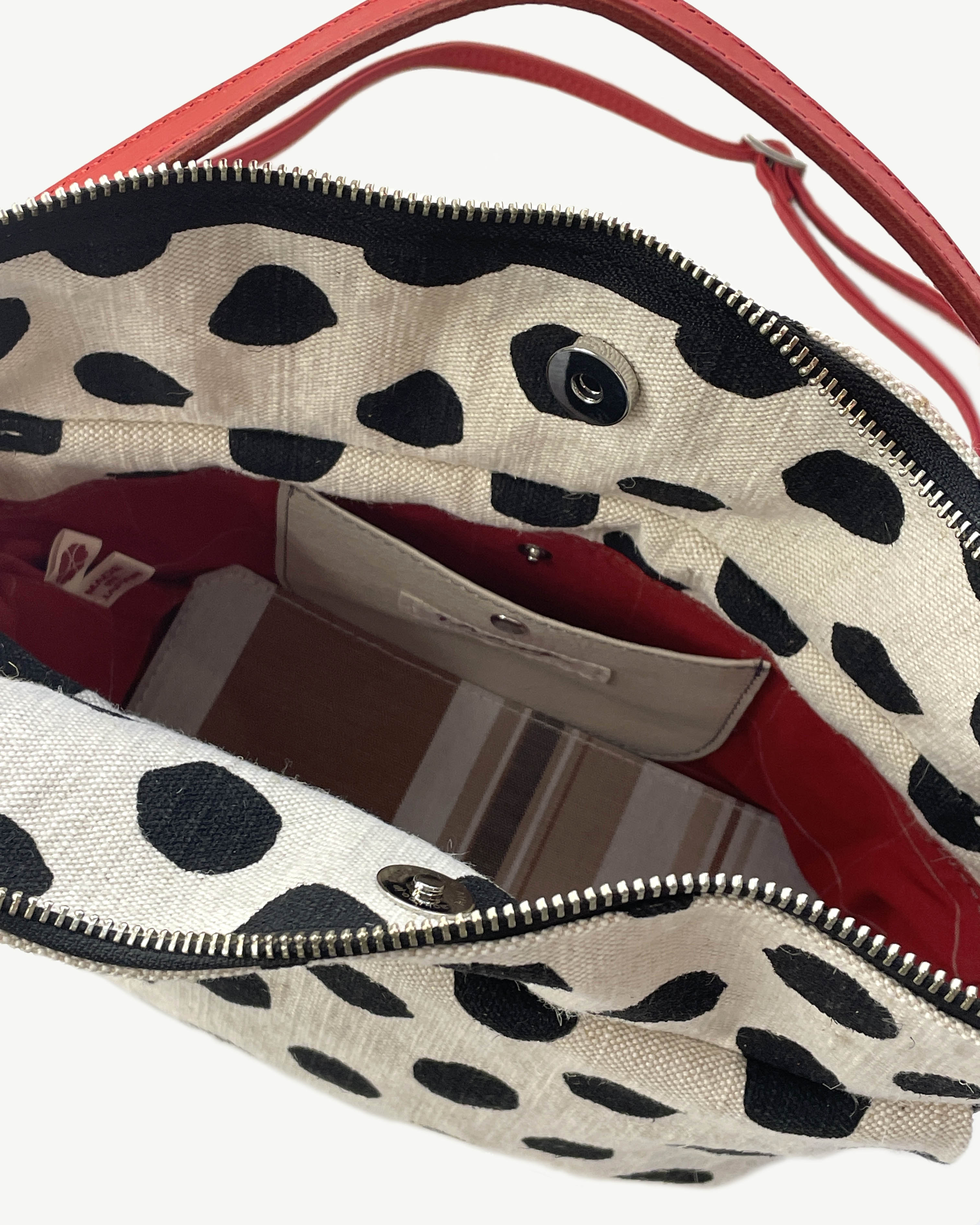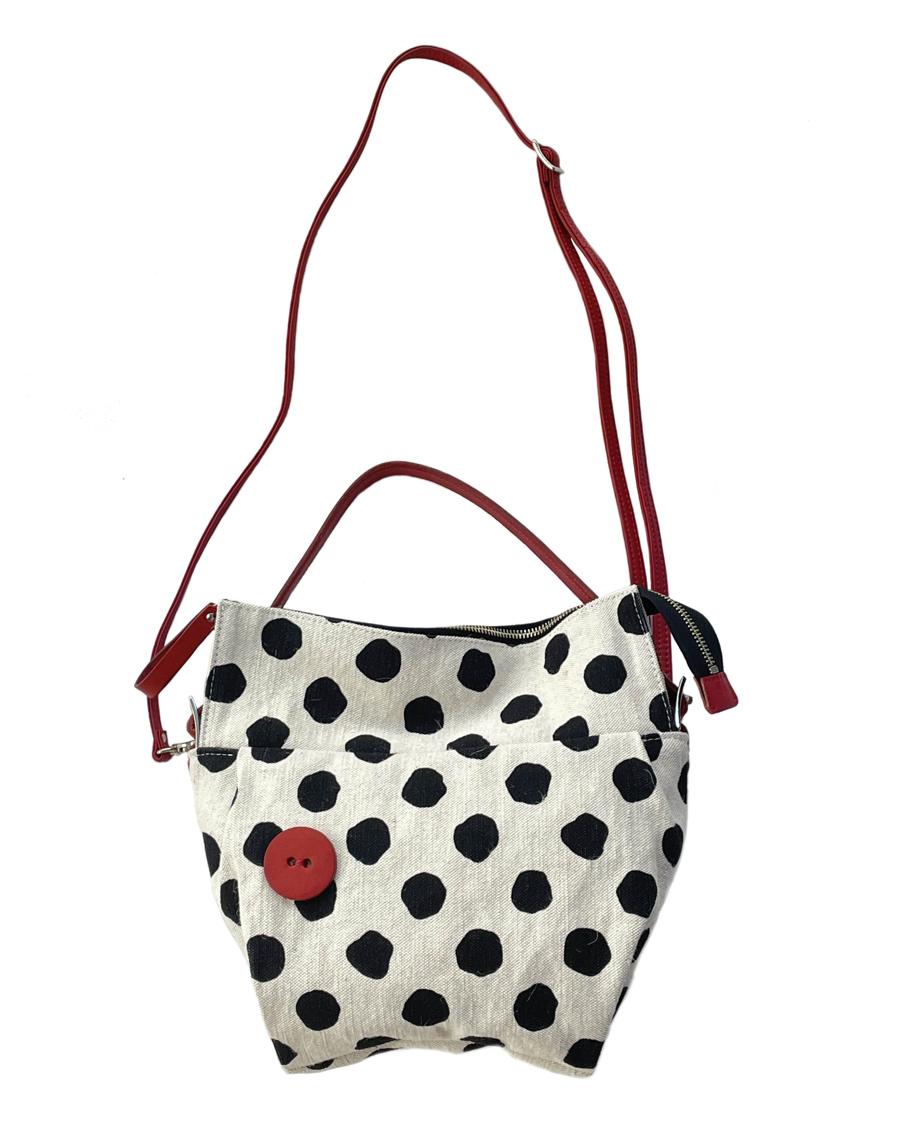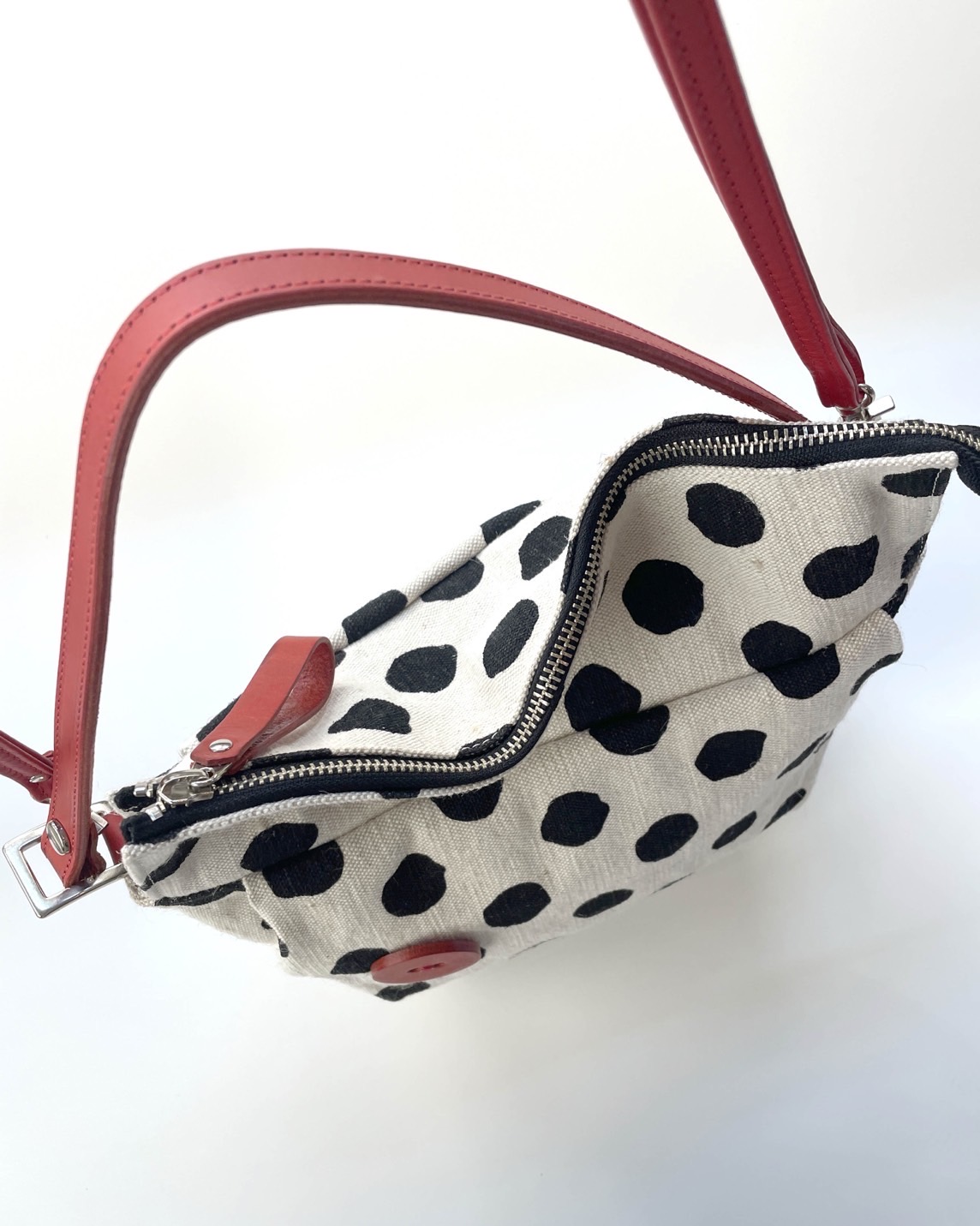 大き目のフリーハンドのドットプリント生地に付属のアカの牛革がアクセント。