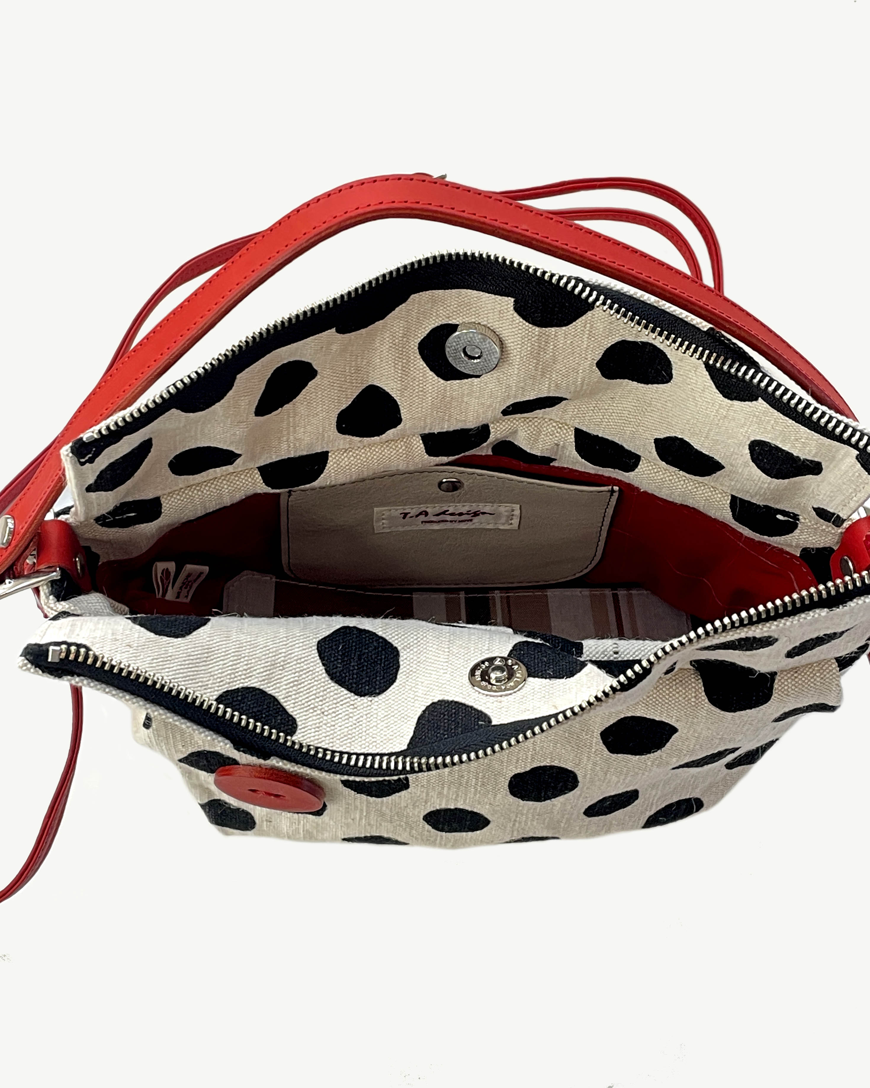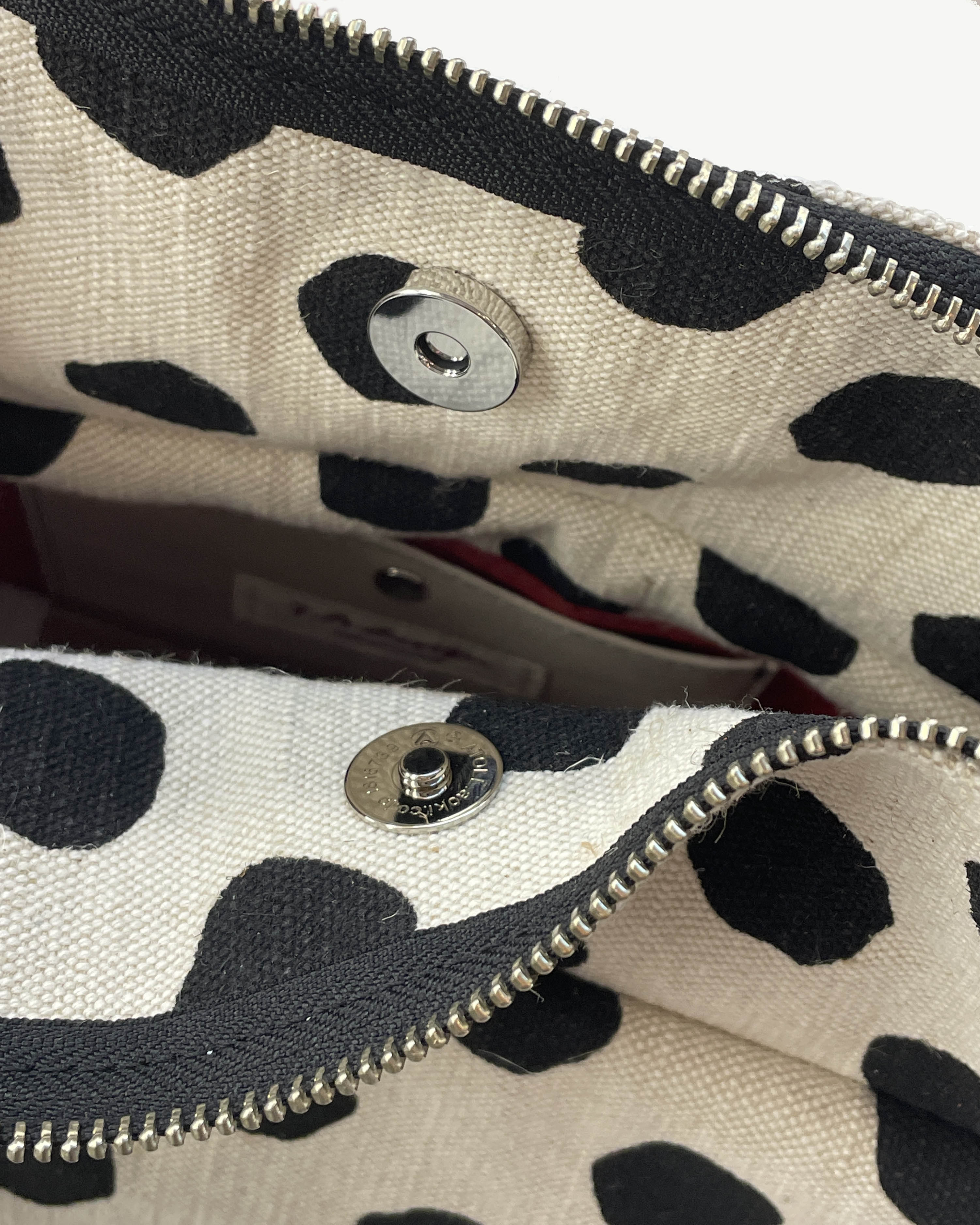 ダルメシアン柄が目を引くポシェットは、コンパクトながら機能的な2wayタイプ。