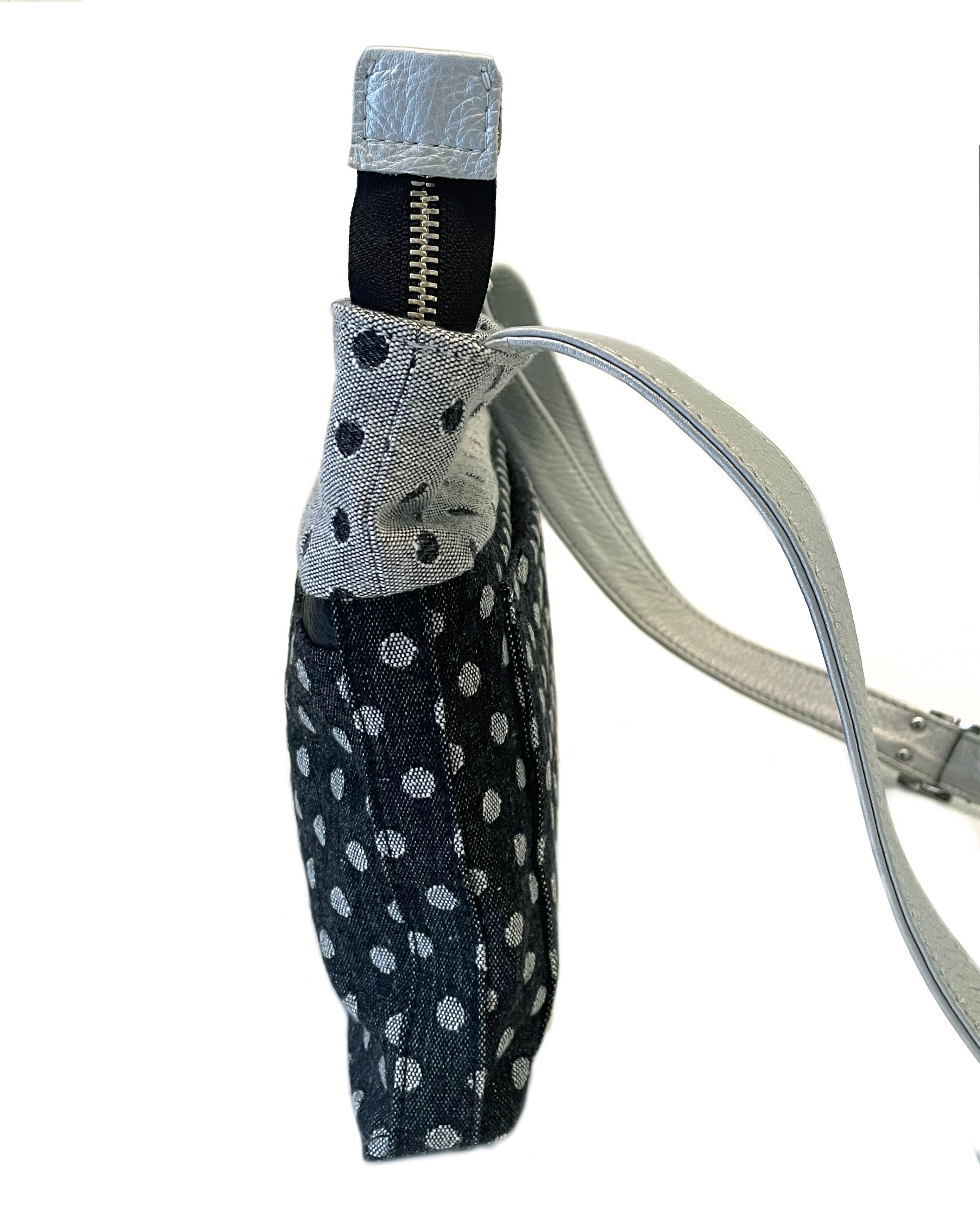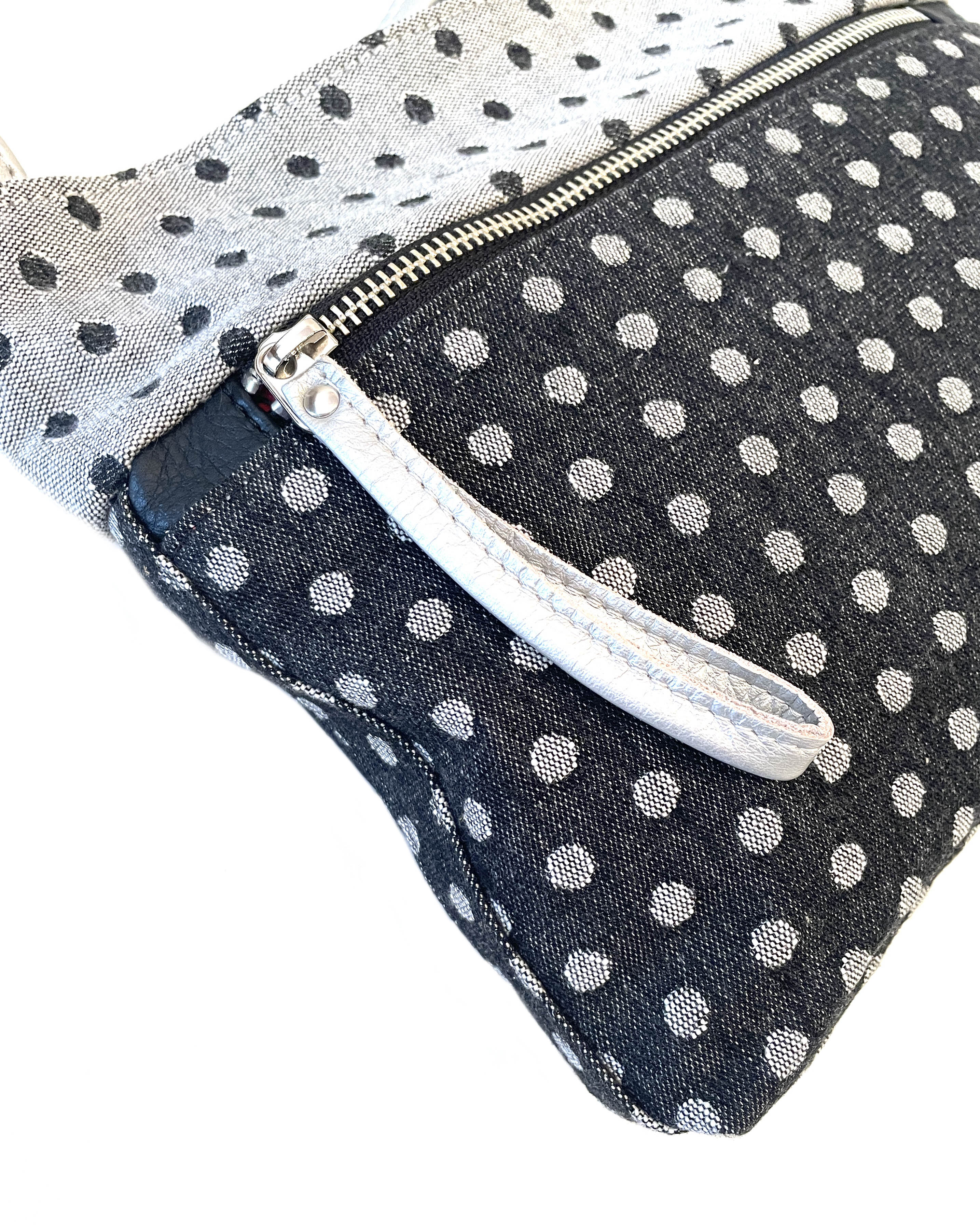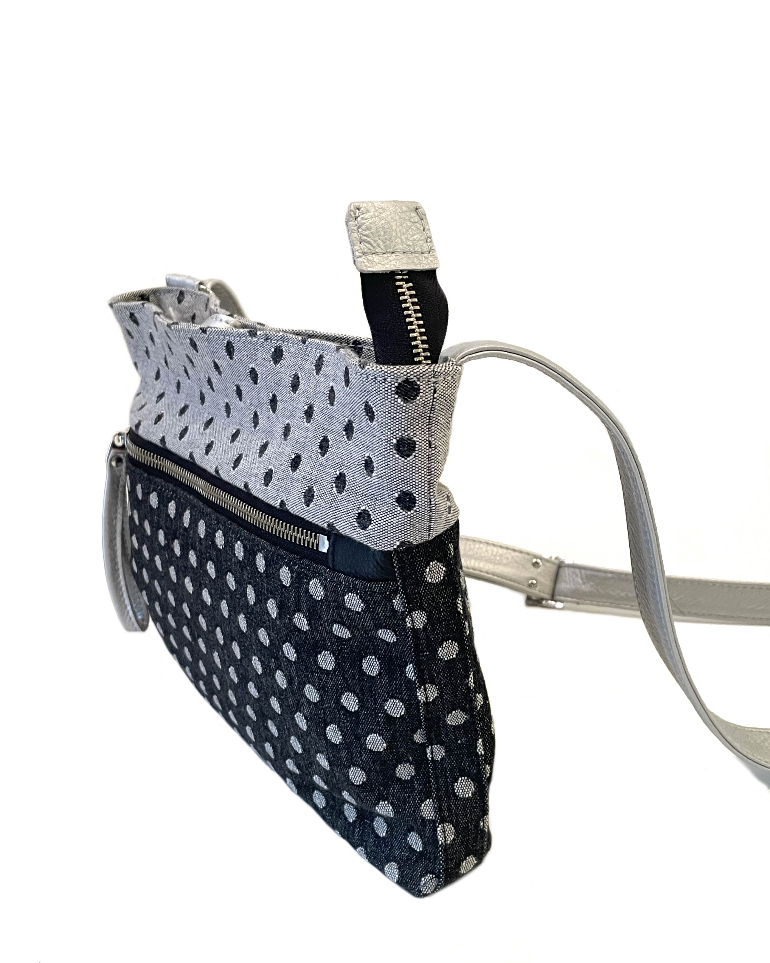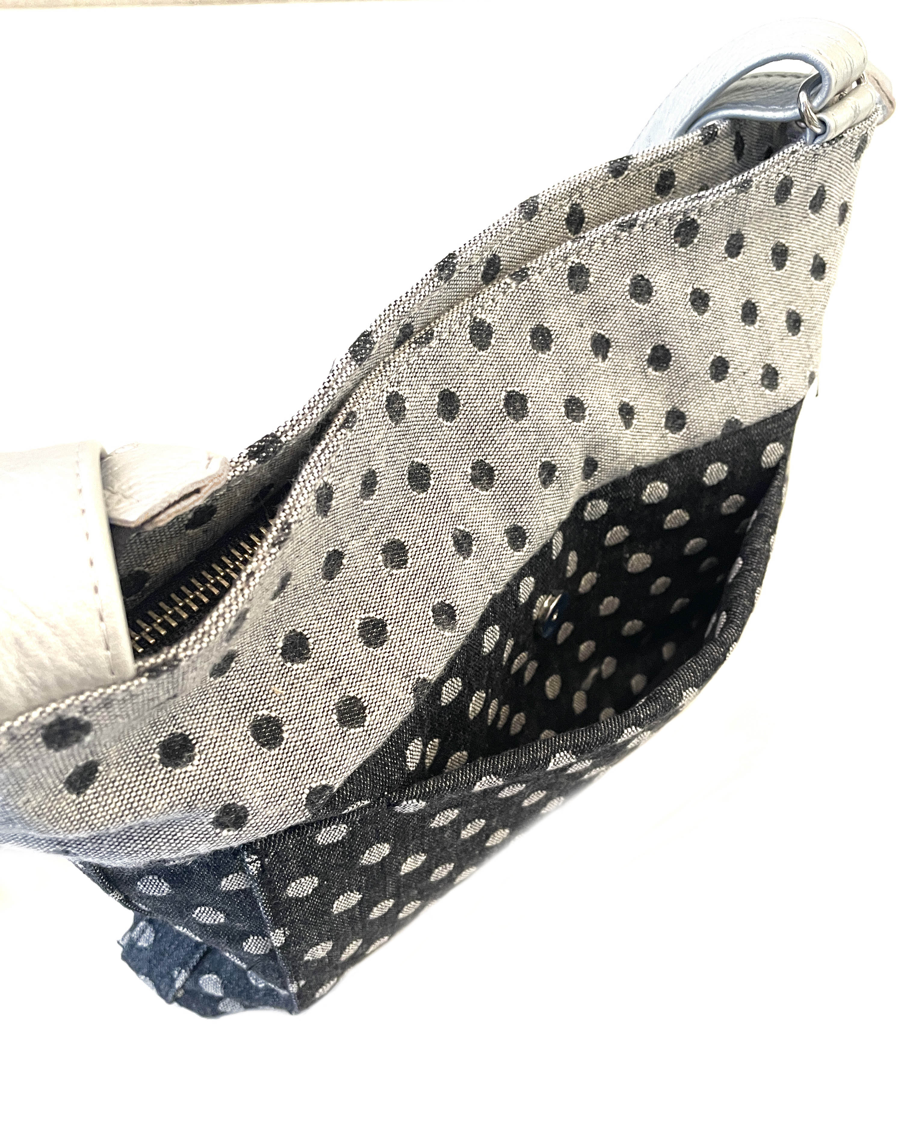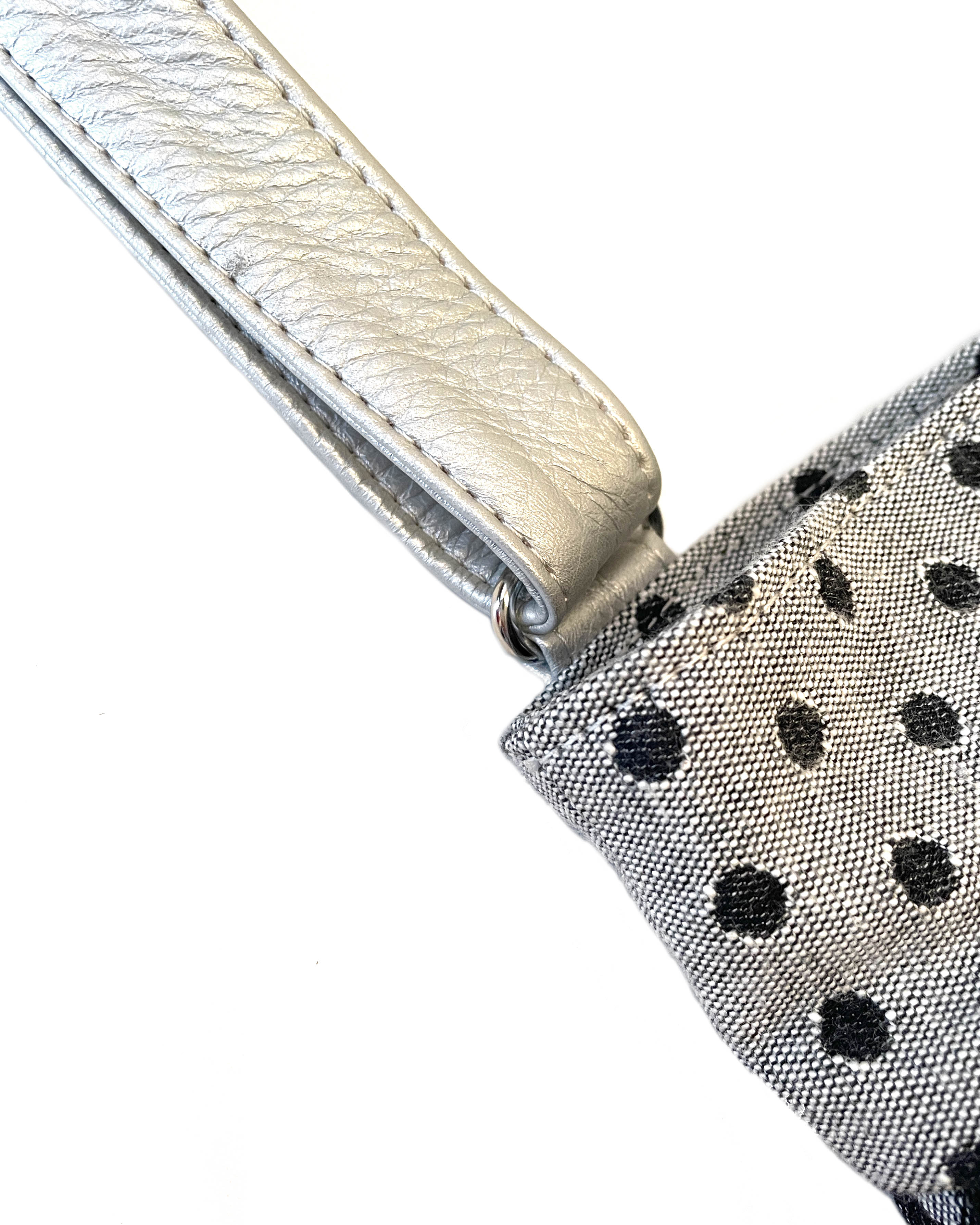 デニム素材にドット柄をあしらった、愛らしいデザインが特徴です。その優しい色合いと素材感は、どんな装いにも馴染みやすく、それでいてコーディネートに心地よいアクセントを加えてくれます。