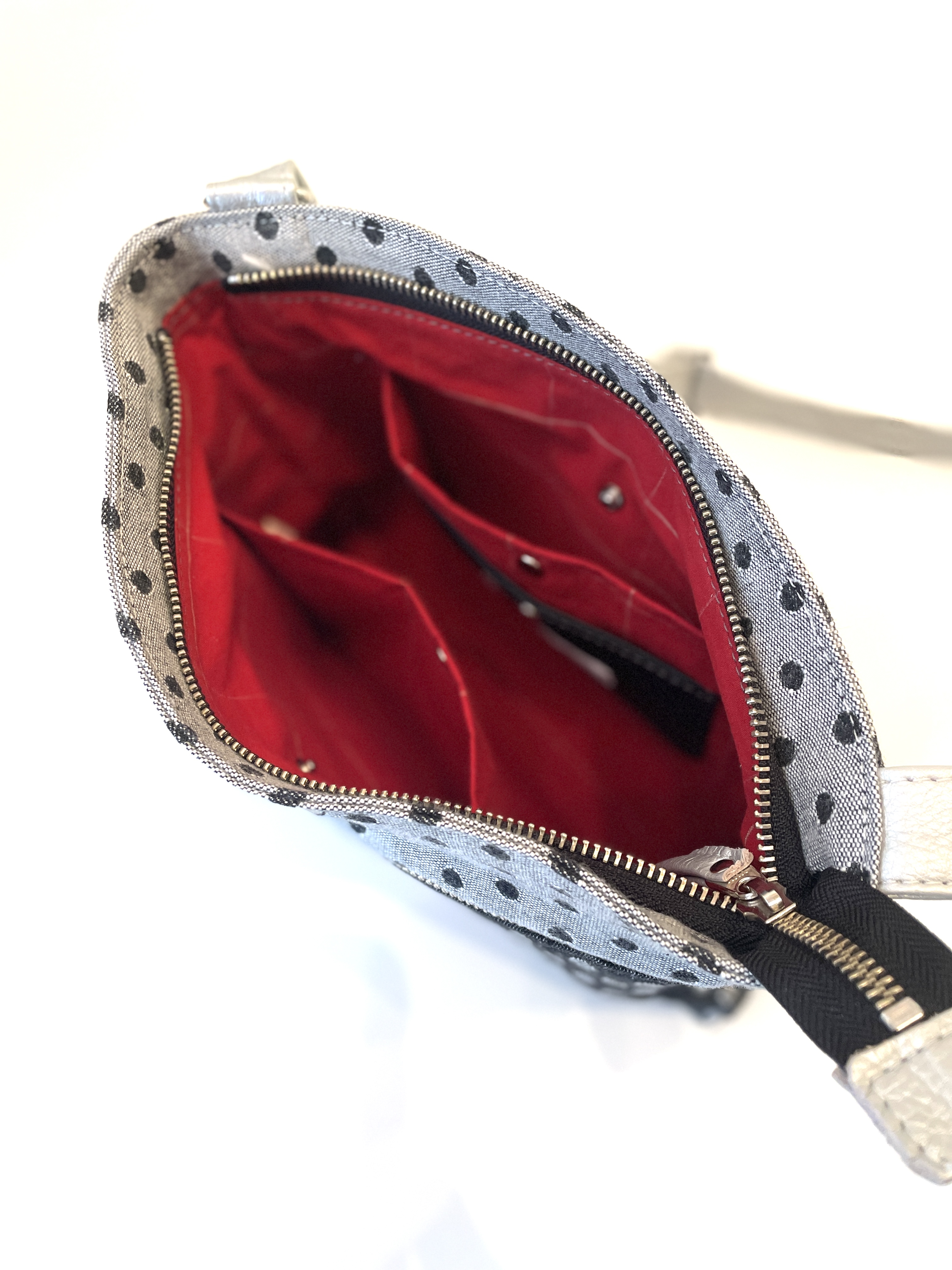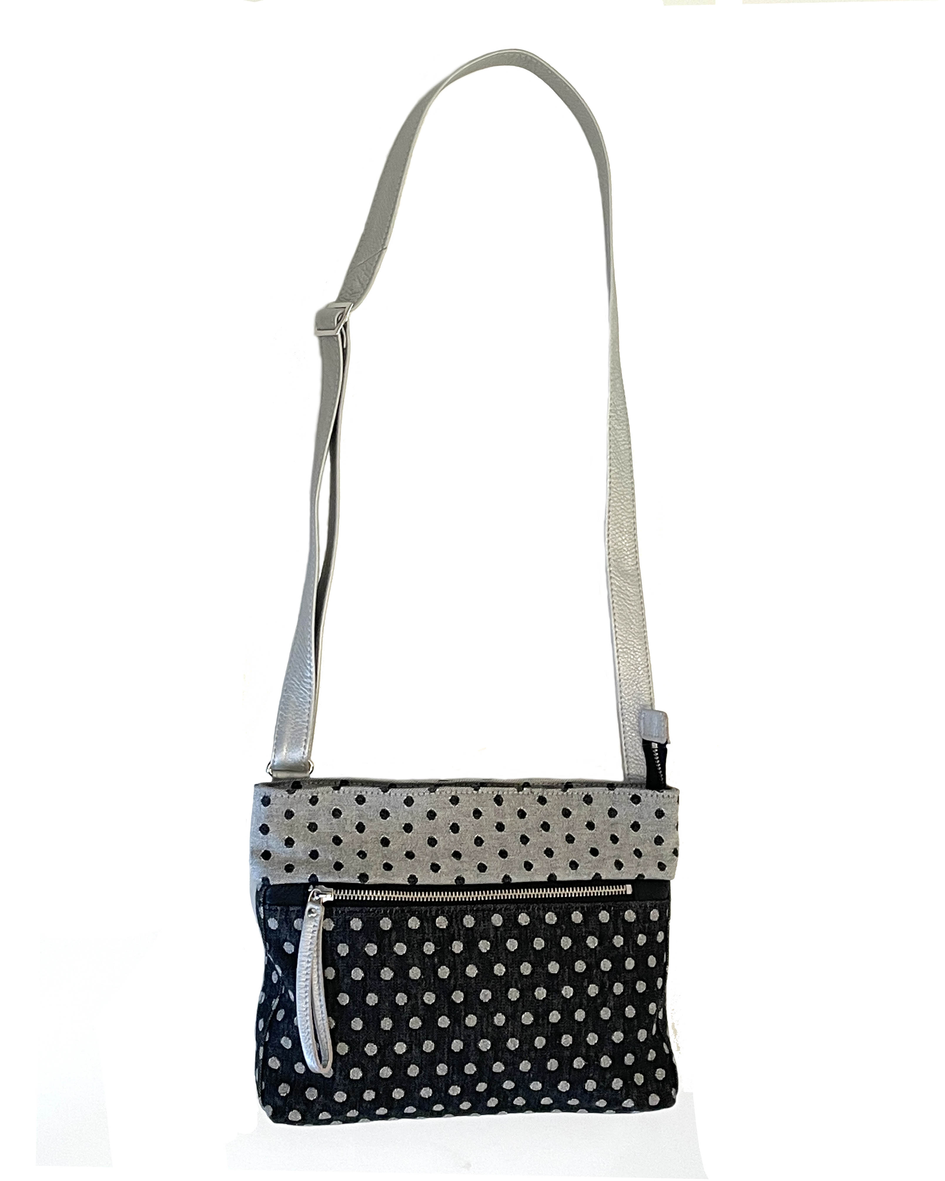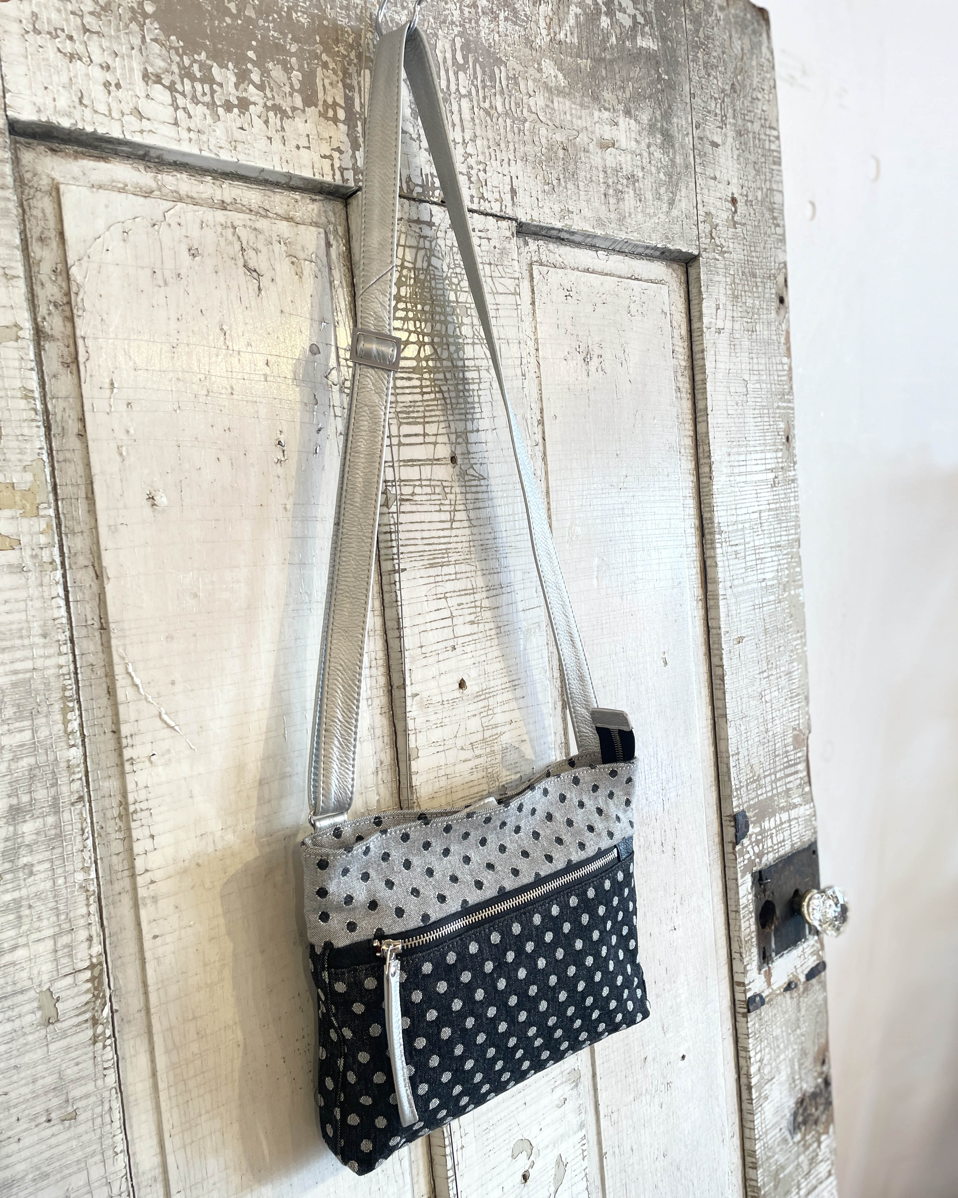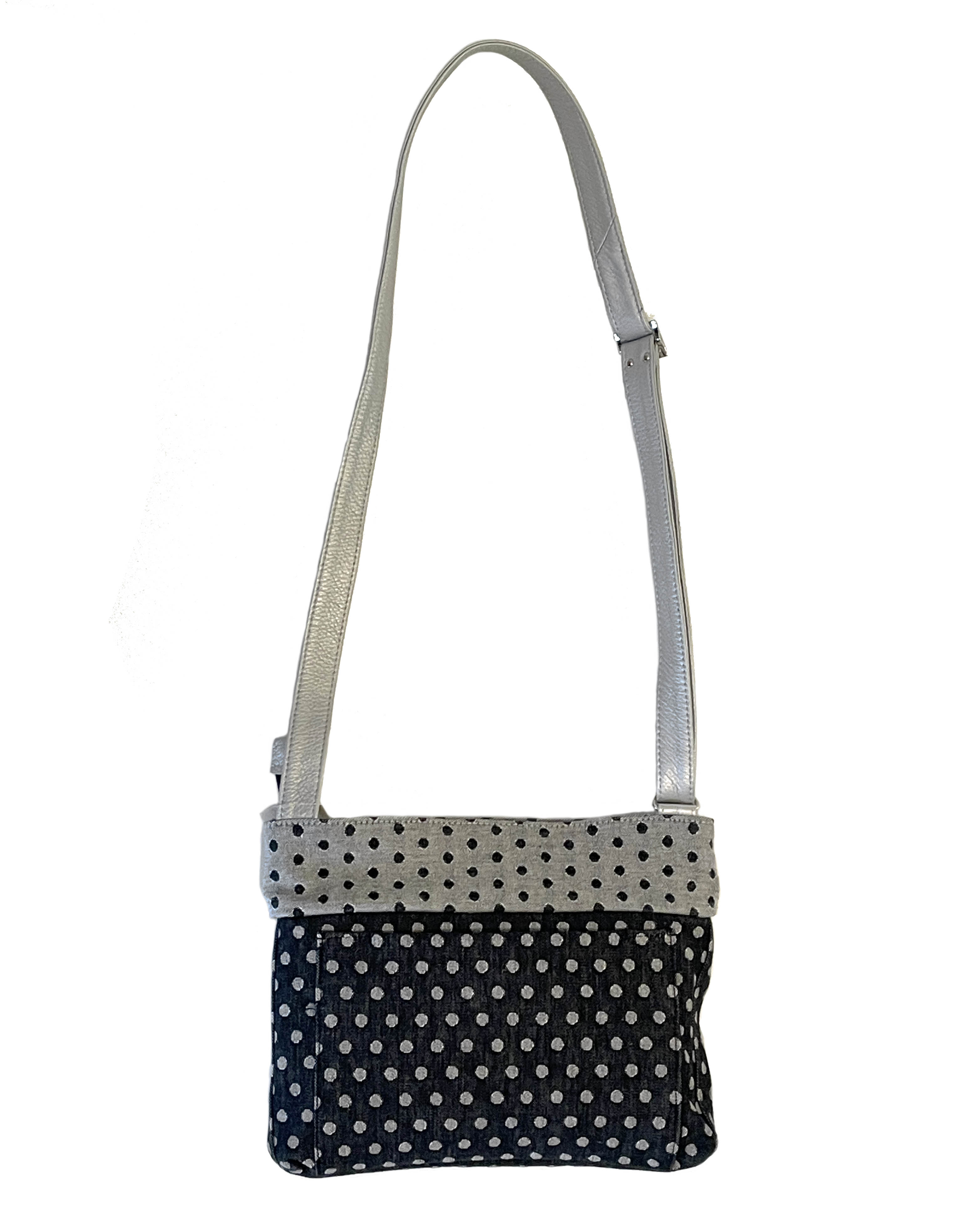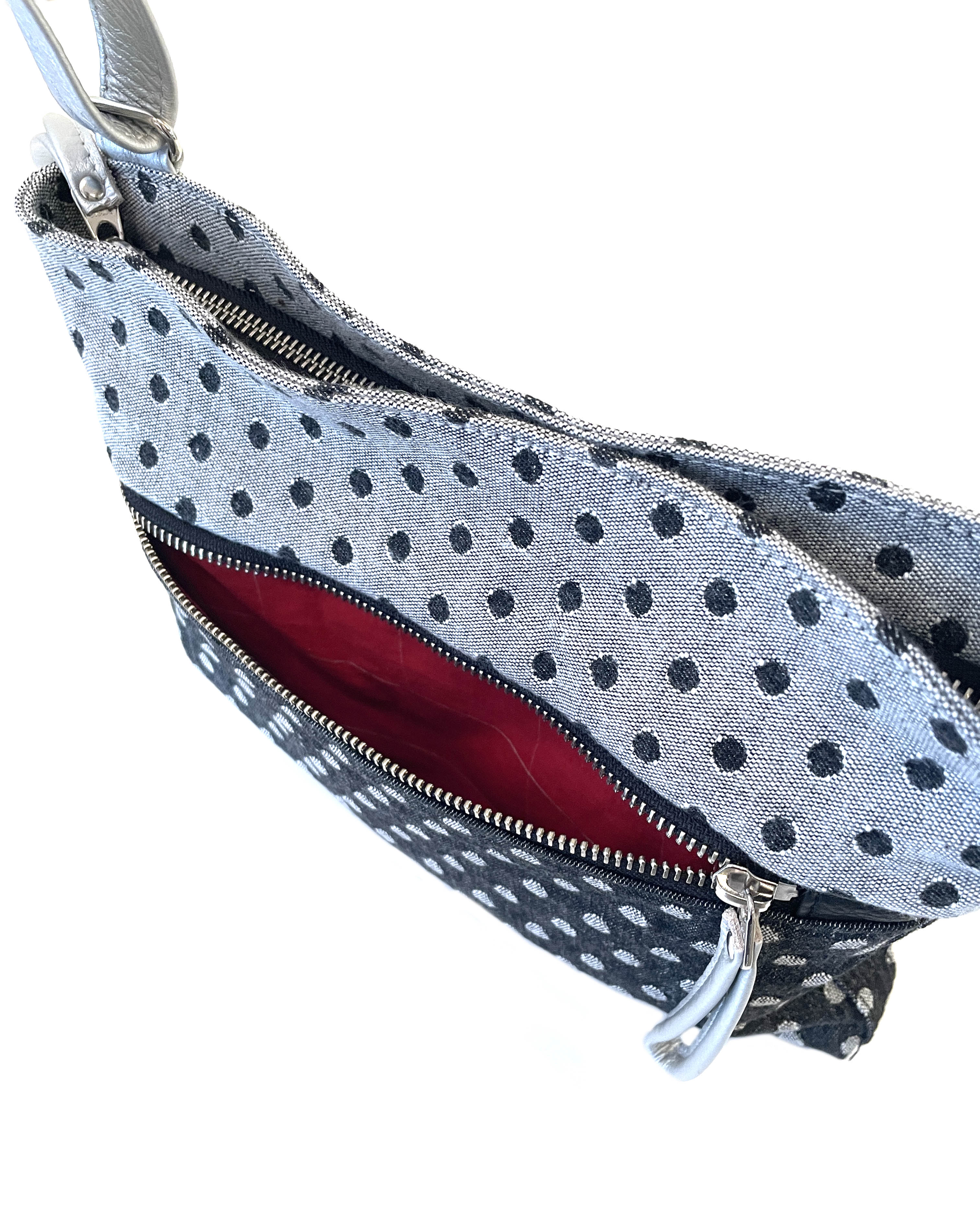 デニム素材にドット柄をあしらった、愛らしいデザインが特徴です。その優しい色合いと素材感は、どんな装いにも馴染みやすく、それでいてコーディネートに心地よいアクセントを加えてくれます。