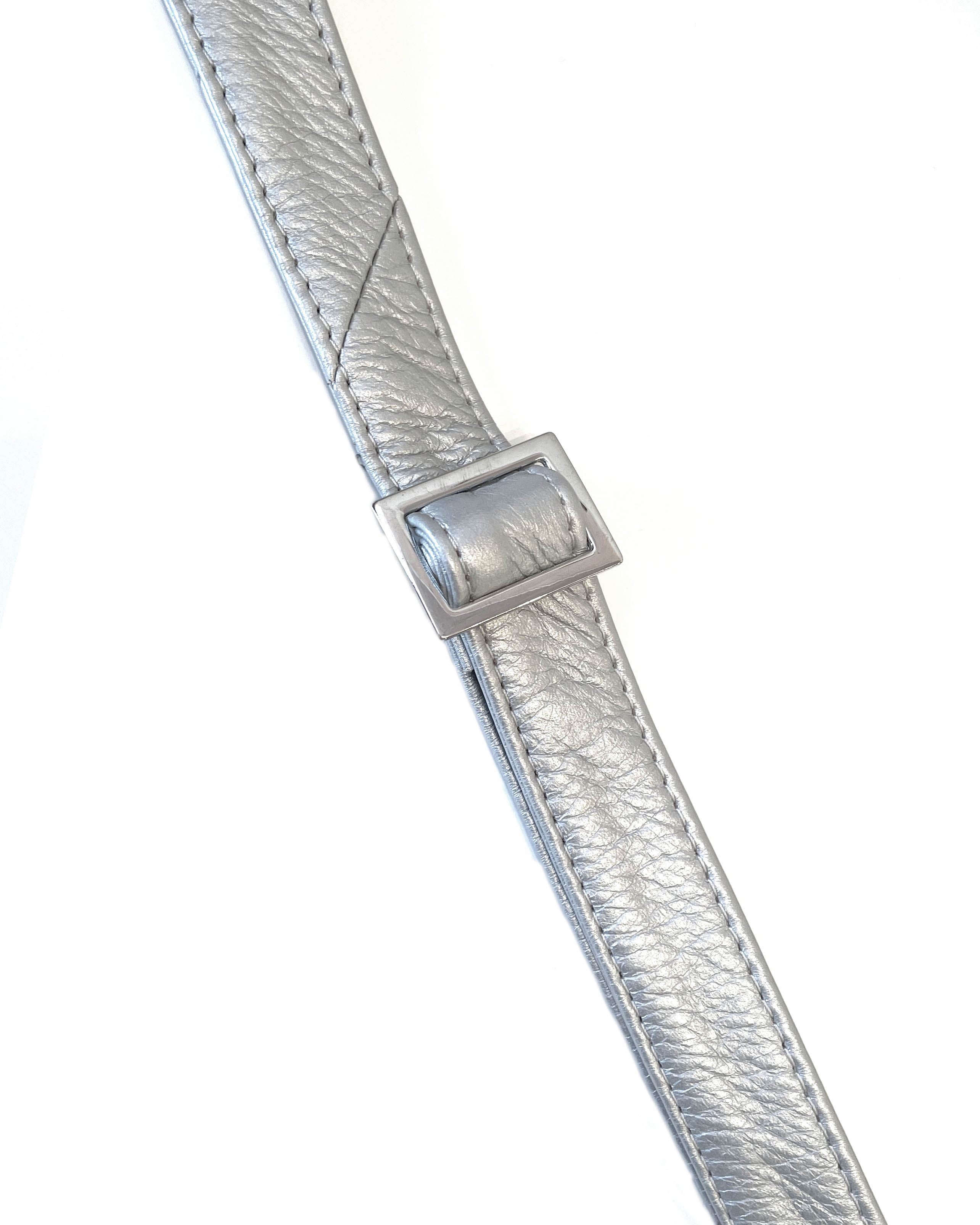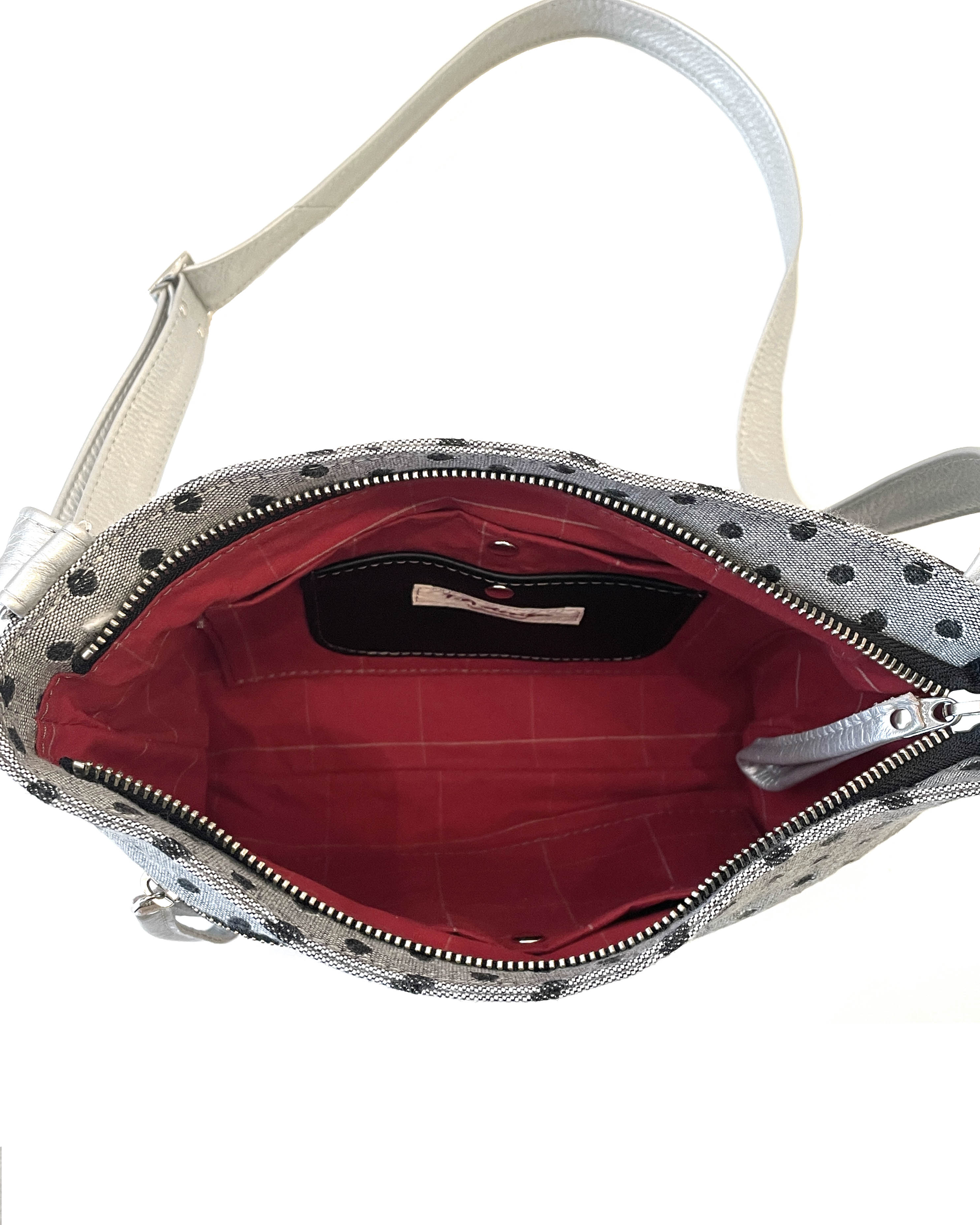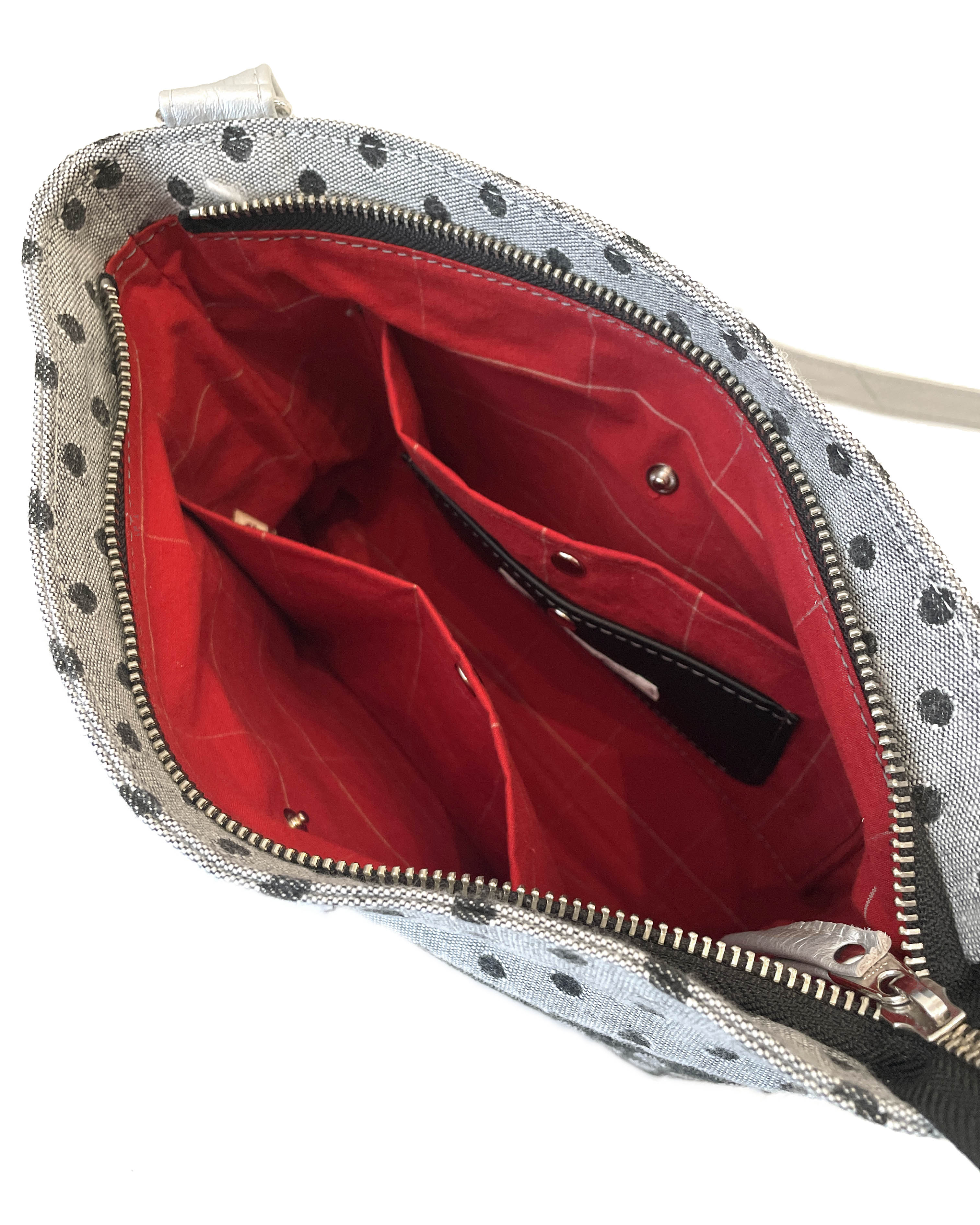 バッグ本体は程よいサイズのシンプルなショルダータイプで、メインの開閉部はファスナー式のため安心してお使いいただけます。収納面では、前後に設けられた外ポケットがとても便利です。正面側はファスナー、身体に触れる背面側はマグネットでの開閉となっており、小物などを分けて整理できます。また、マチが薄く作られているため、荷物を入れても体に自然とフィットする、持ち運びやすいデザインです。