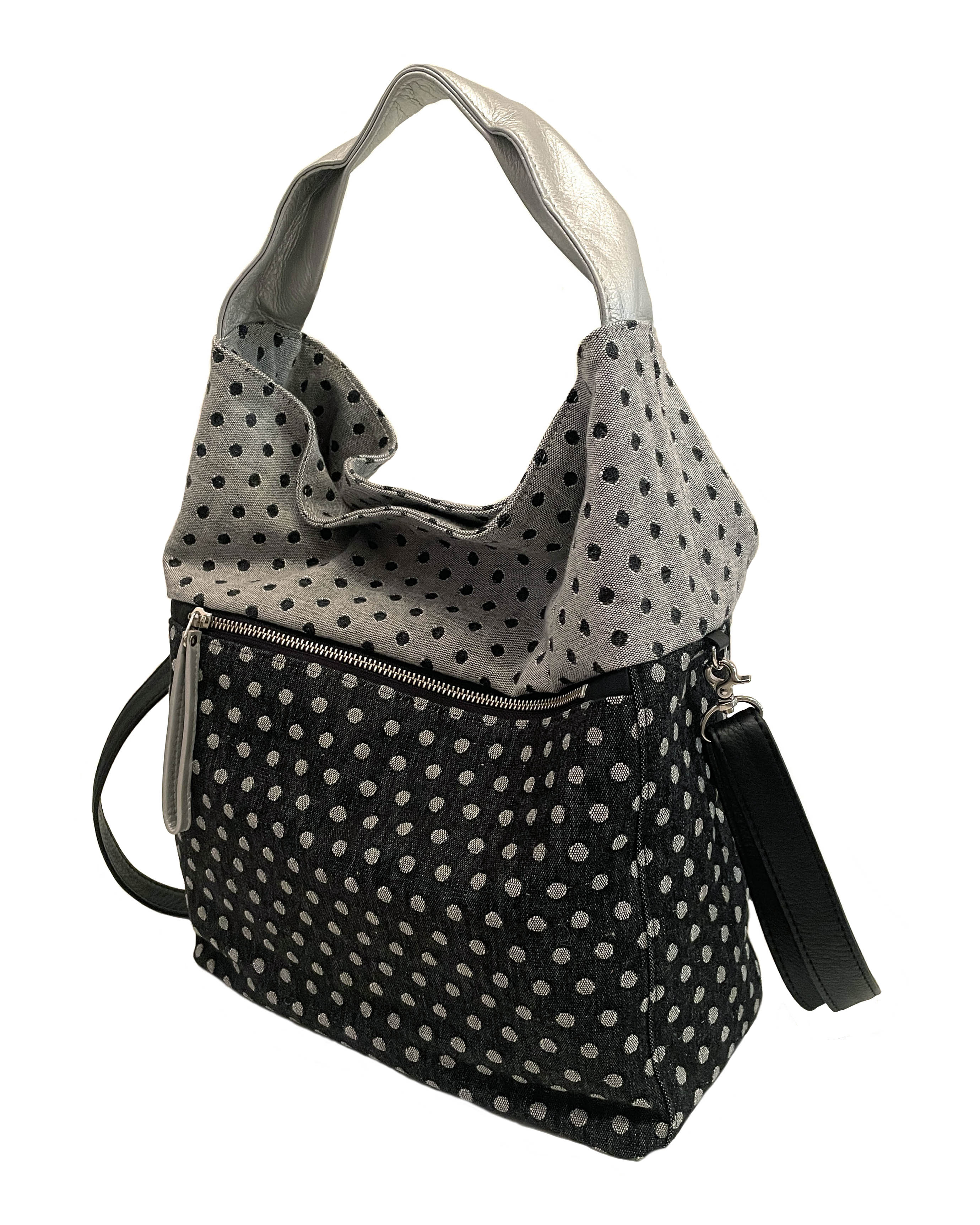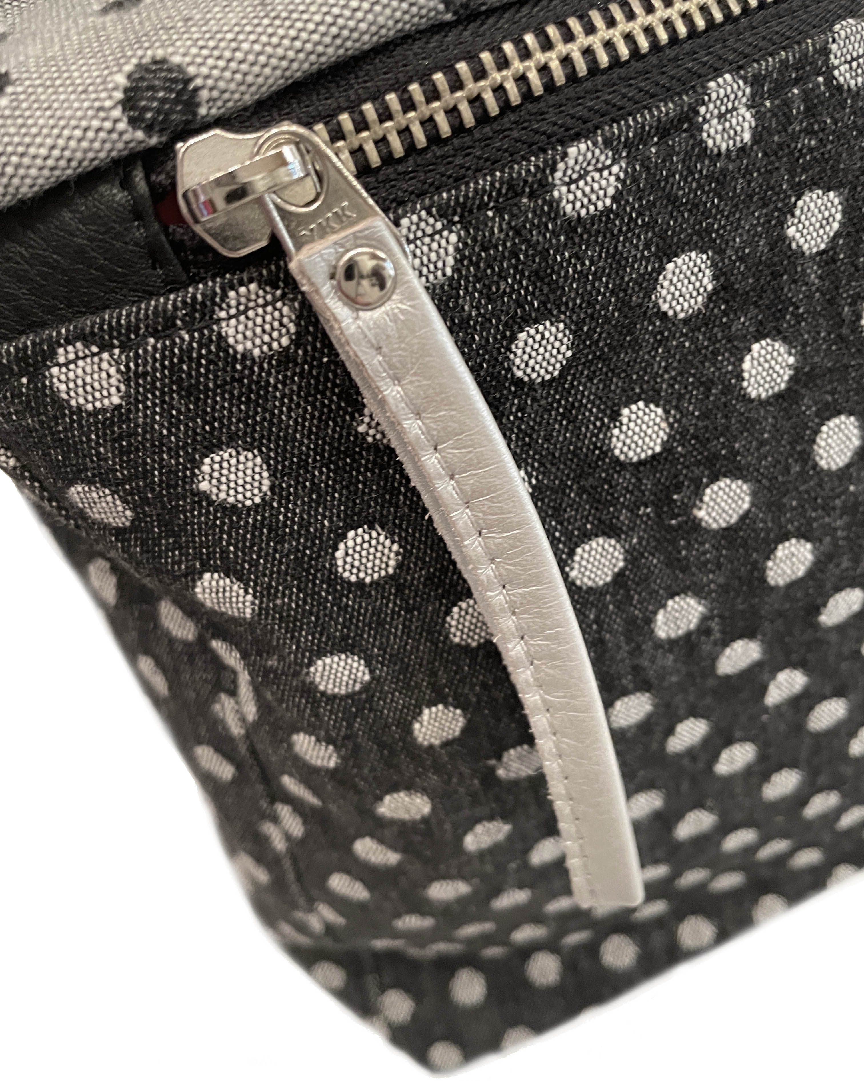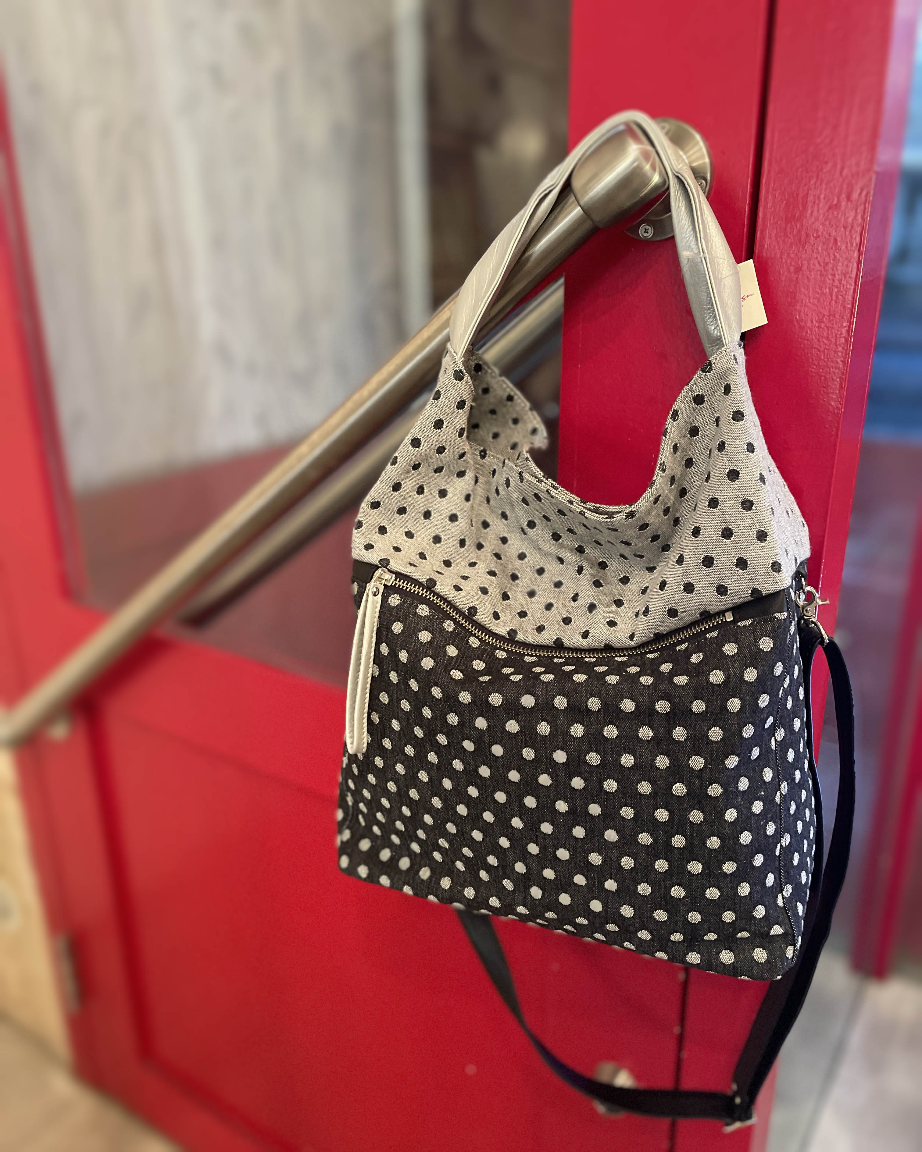 デニム素材にドット柄をあしらった、愛らしいデザインが特徴です。その優しい色合いと素材感は、どんな装いにも馴染みやすく、それでいてコーディネートに心地よいアクセントを加えてくれます。