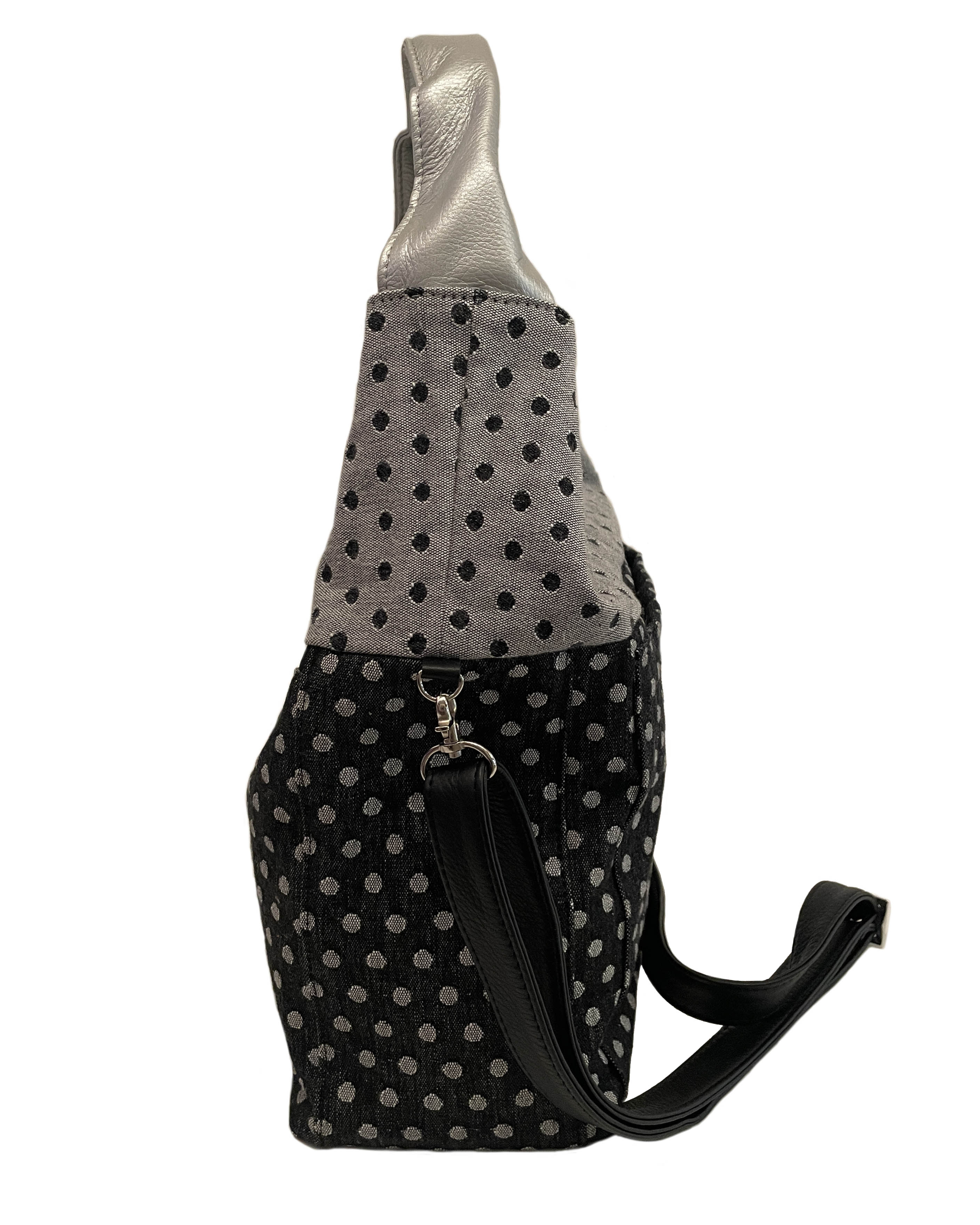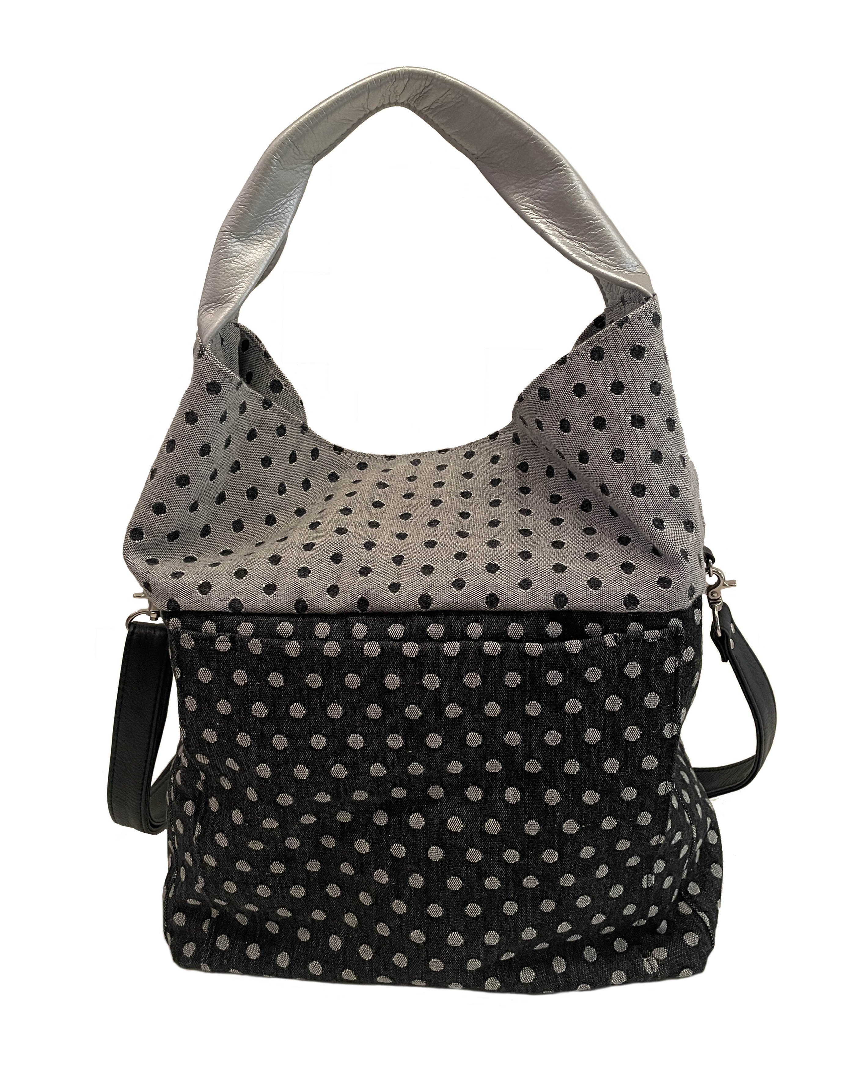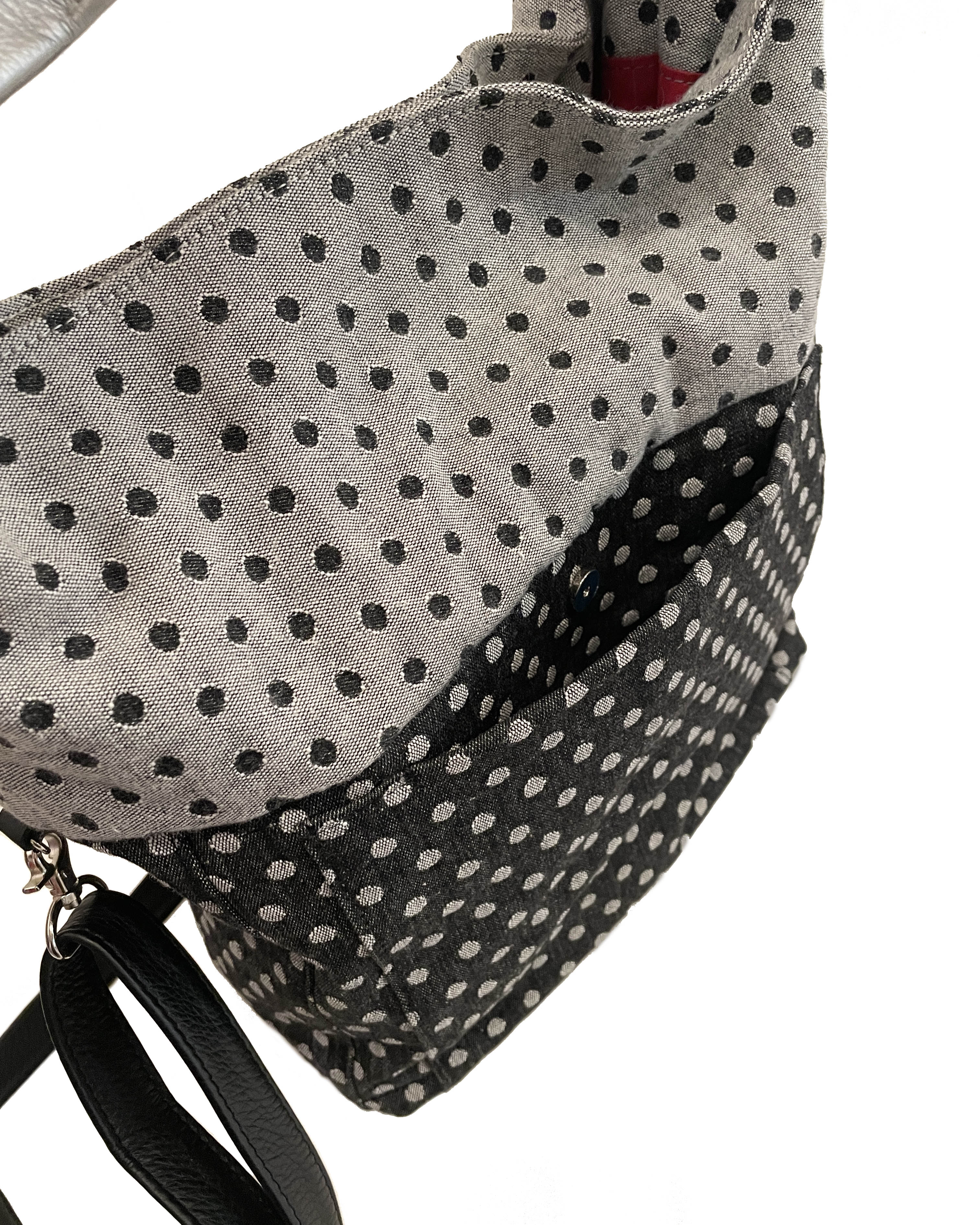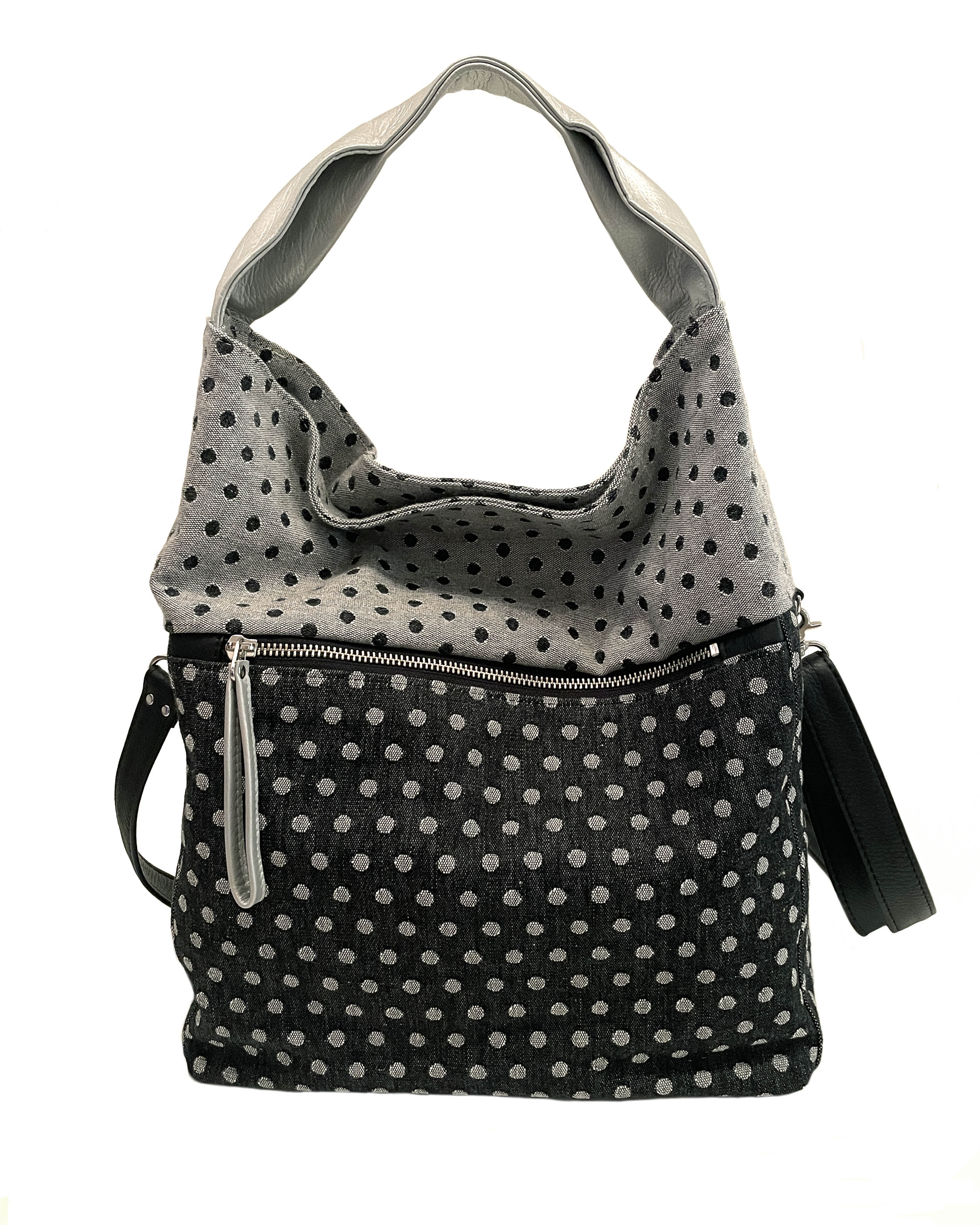 デニム素材にドット柄をあしらった、愛らしいデザインが特徴です。その優しい色合いと素材感は、どんな装いにも馴染みやすく、それでいてコーディネートに心地よいアクセントを加えてくれます。