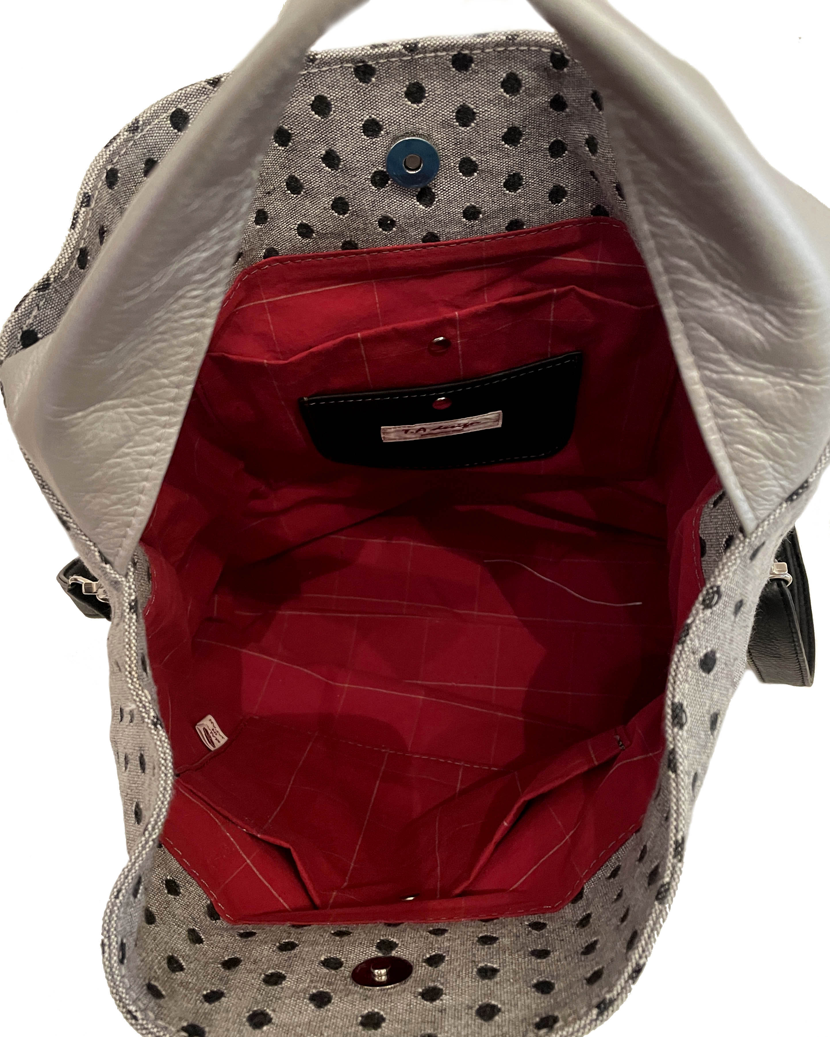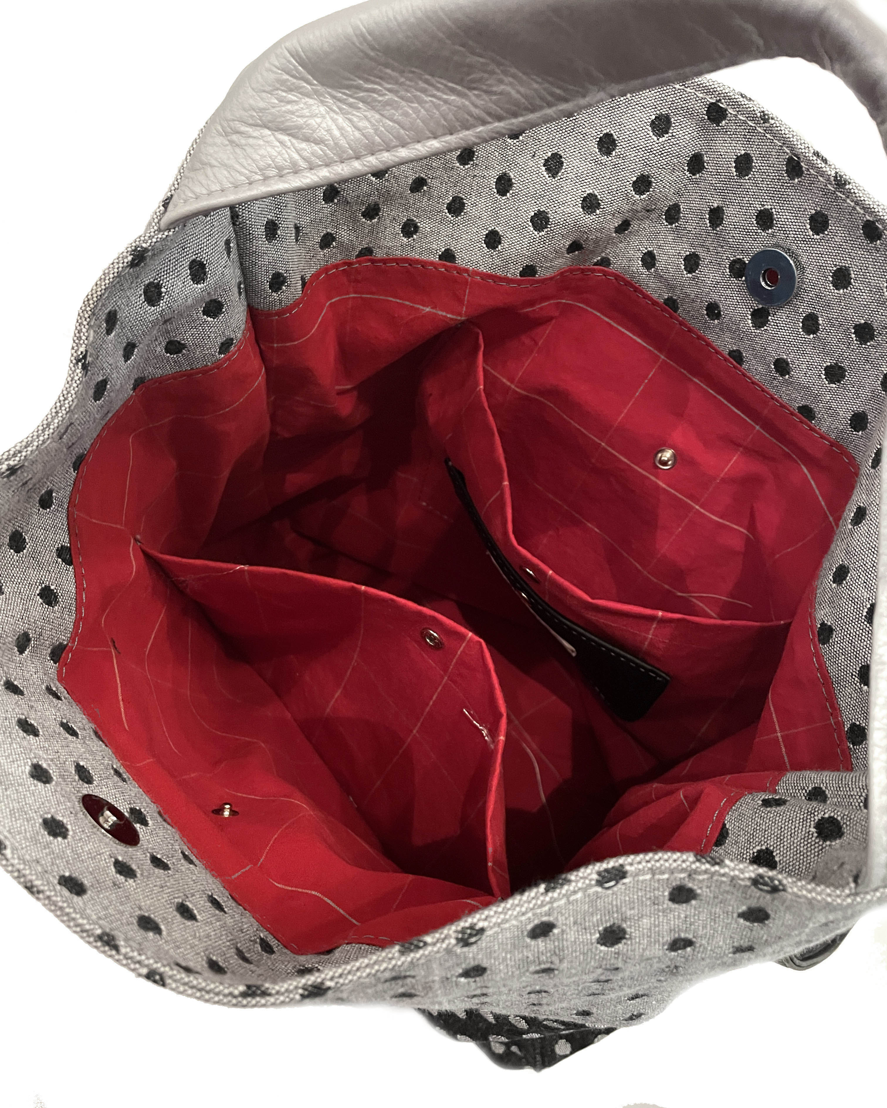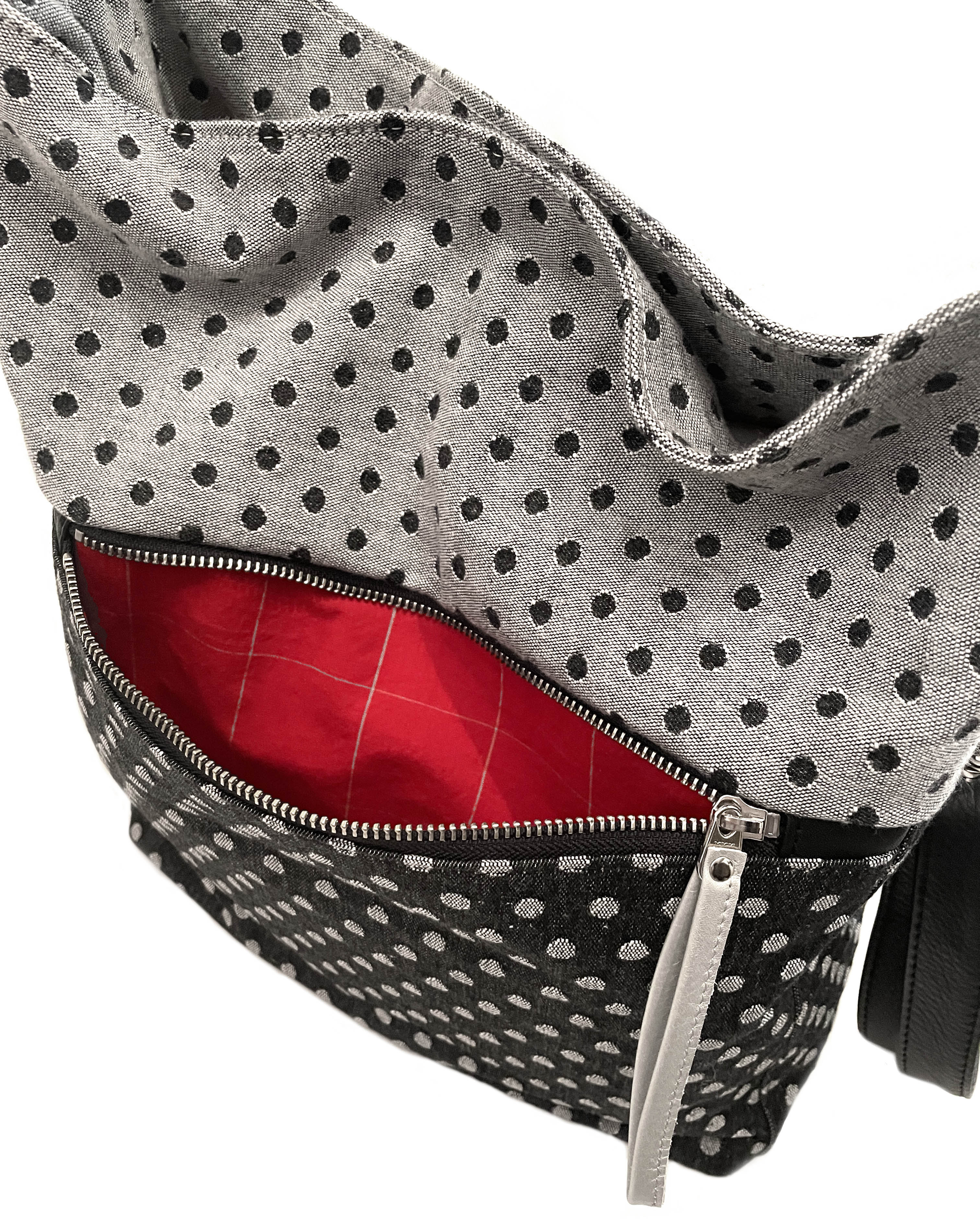 この織りの生地の表と裏を効果的に使用することで、水玉の模様が単なるプリントではなく、まるで彫刻のような立体感をもって表現されています。この技法により、柄に深みと独特な表情が生まれています。