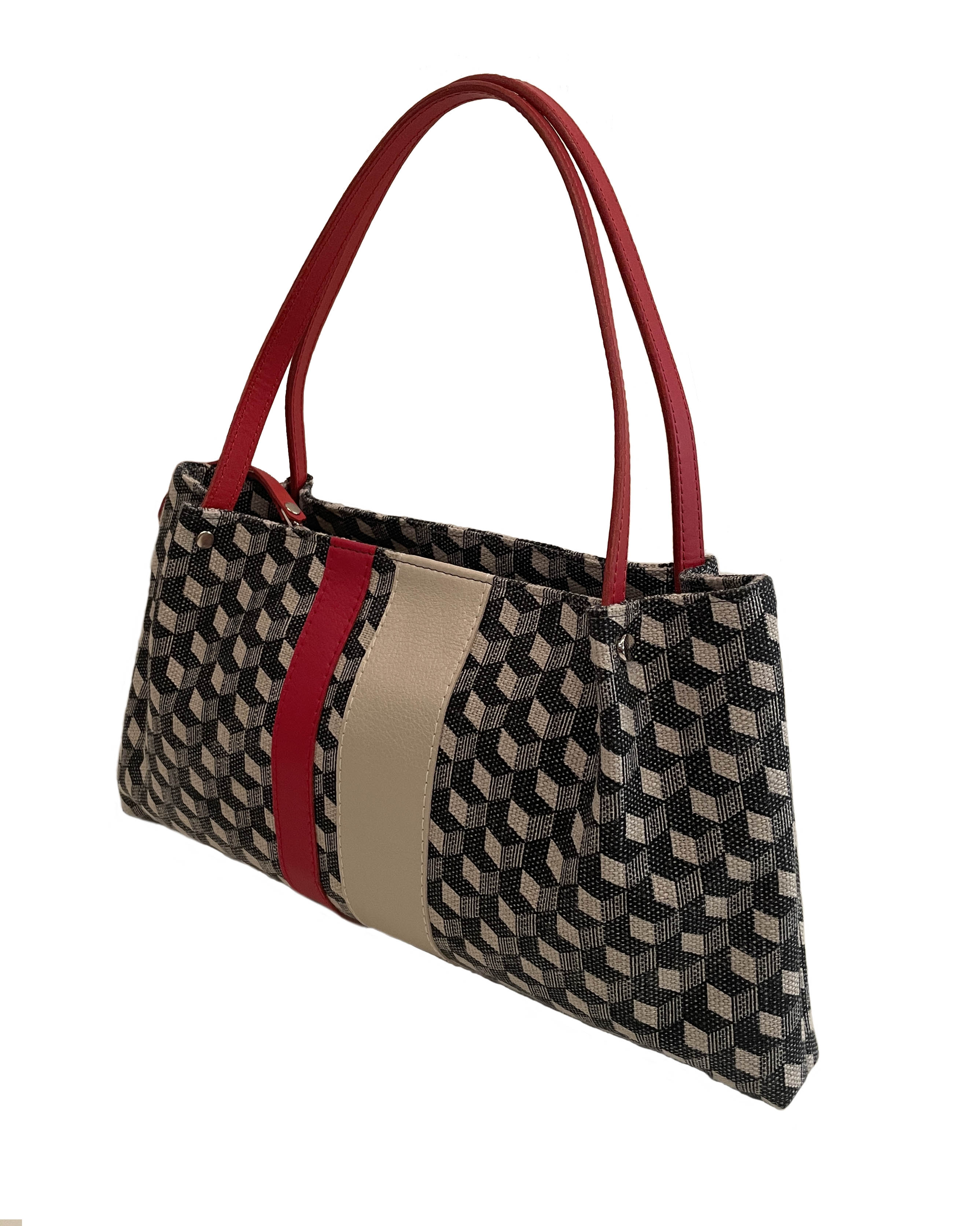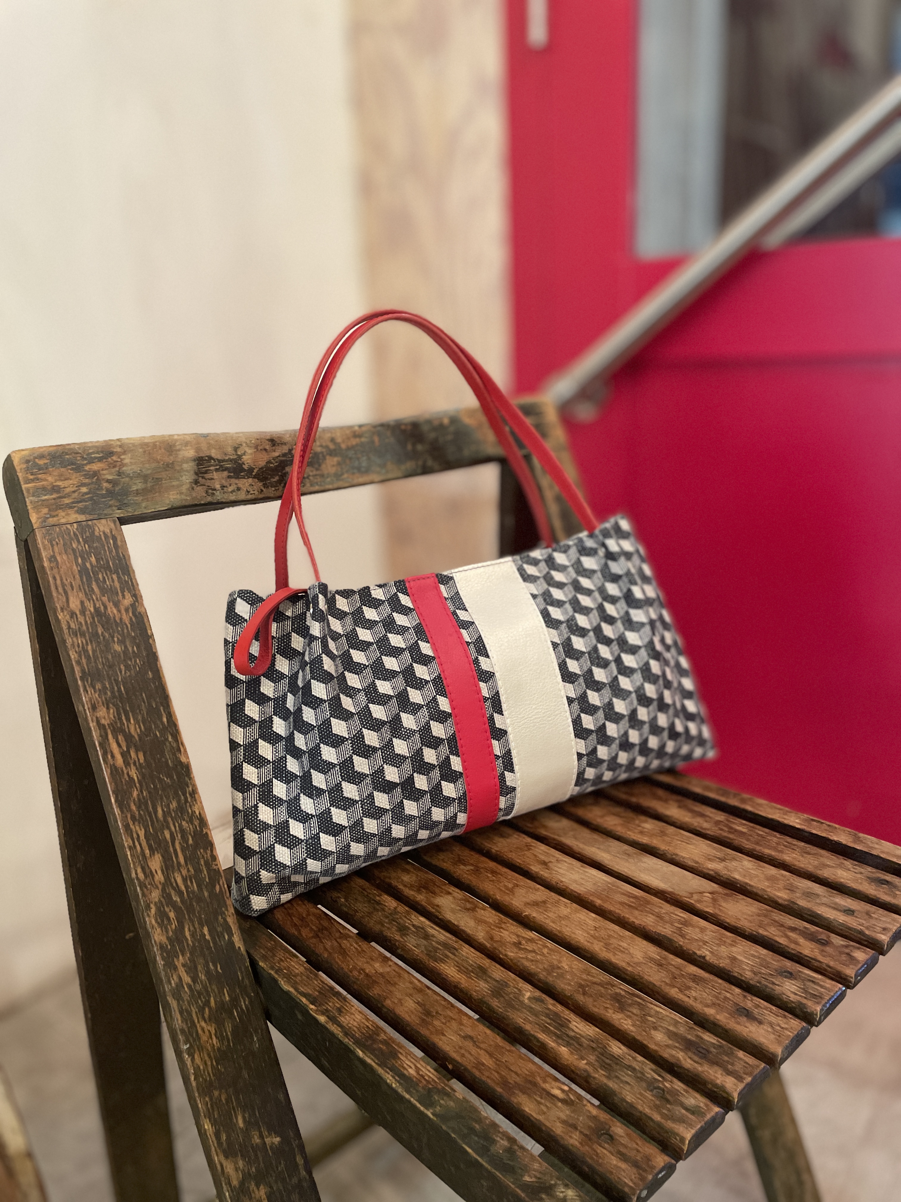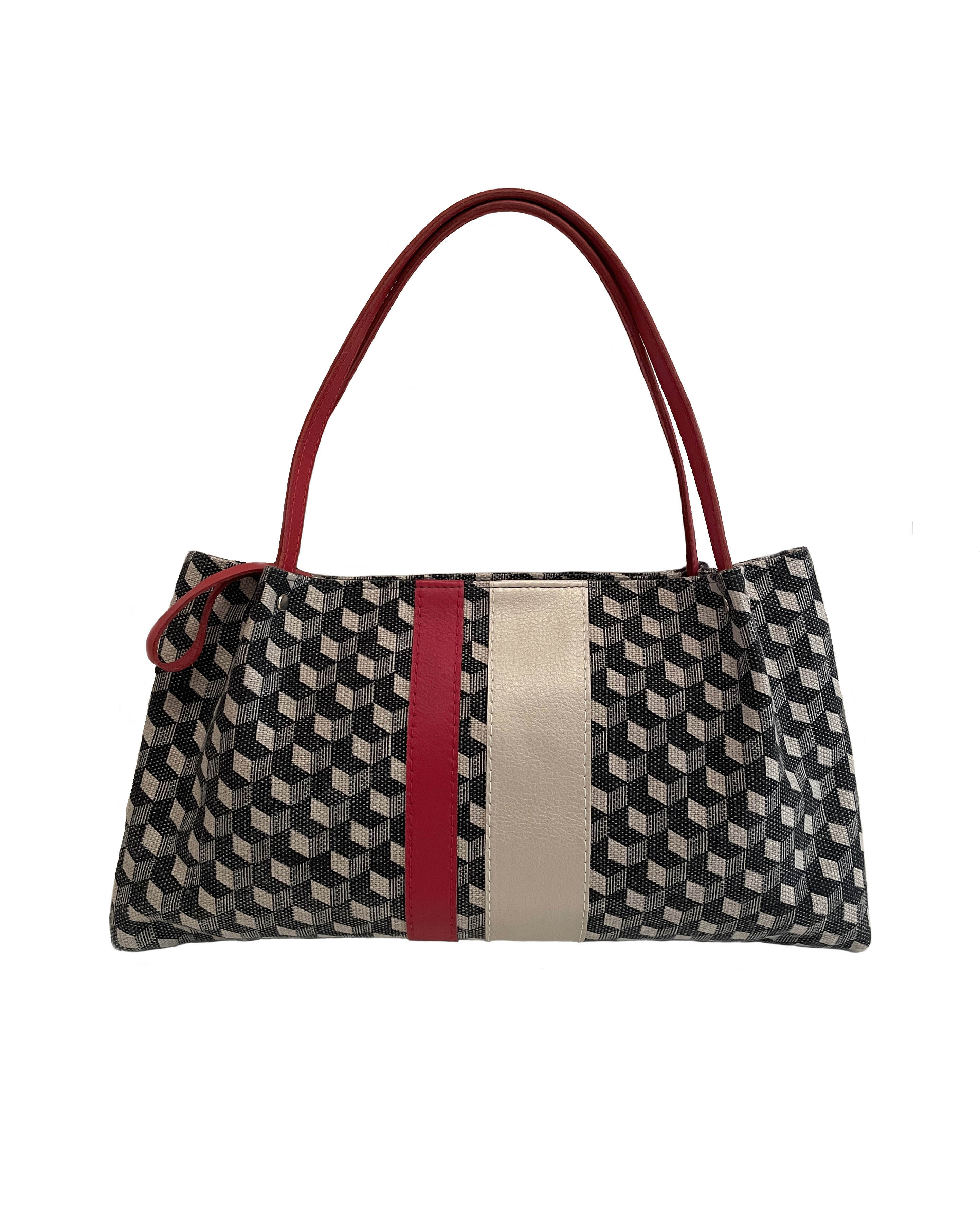 中身が見やすく取り出しやすい、横長タイプのデザインです。軽やかで程よいサイズ感のため、使うシーンを選びません。ハンドルは長めの設計で、薄着の季節には肩掛けスタイルでもバランス良く持ち歩けます。