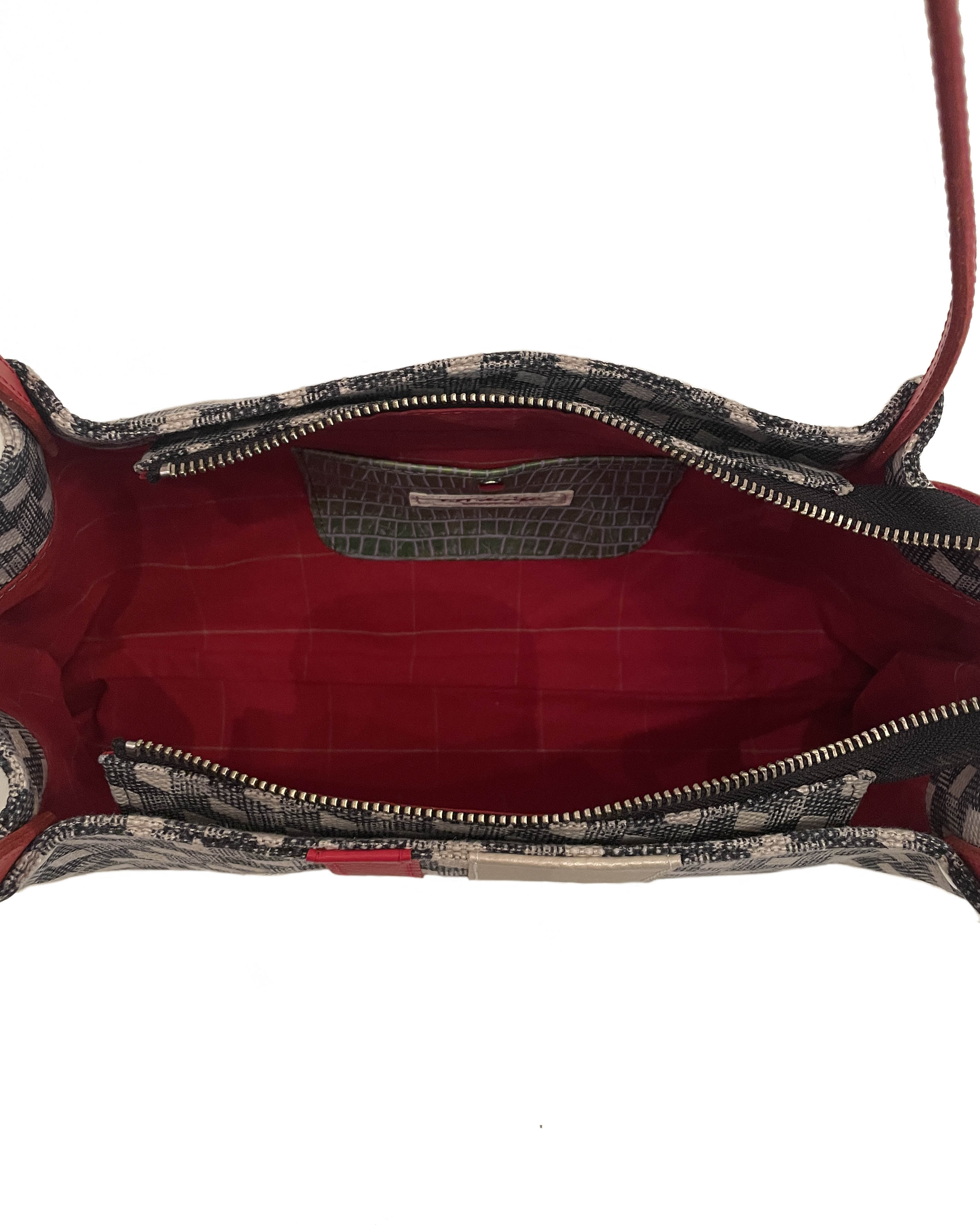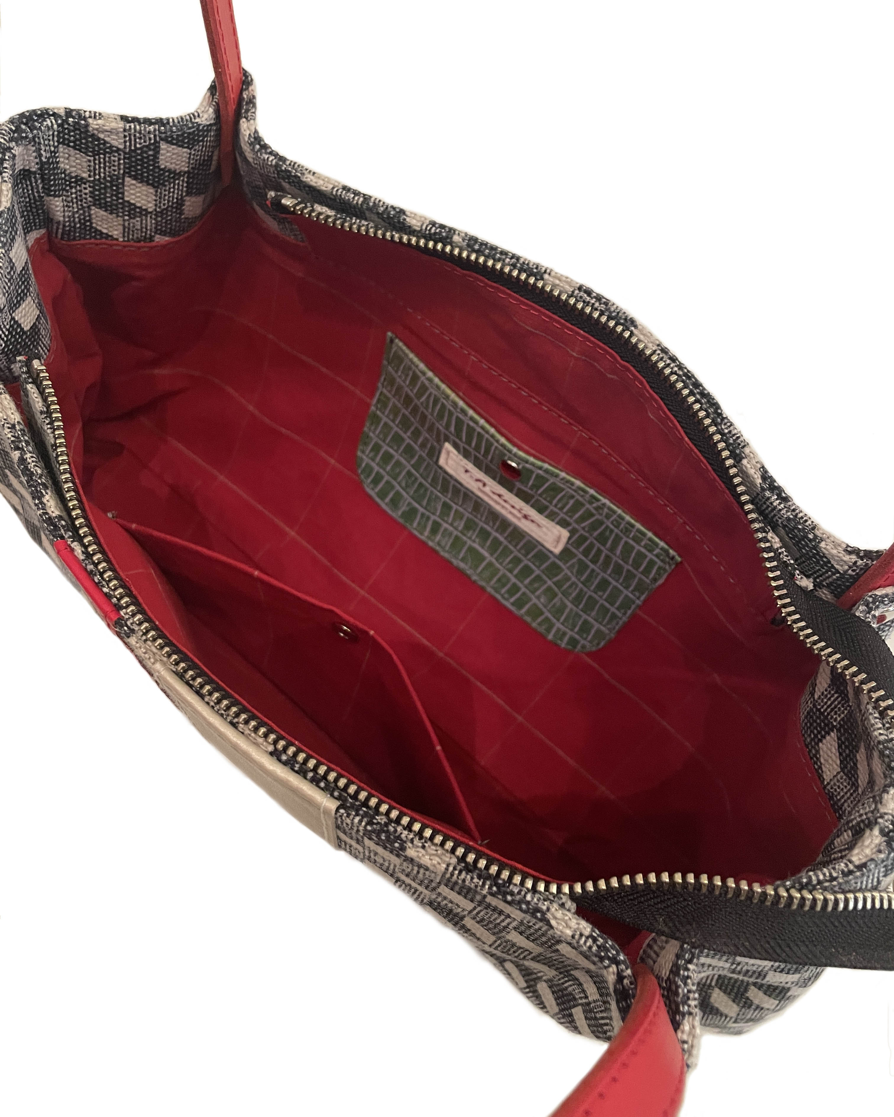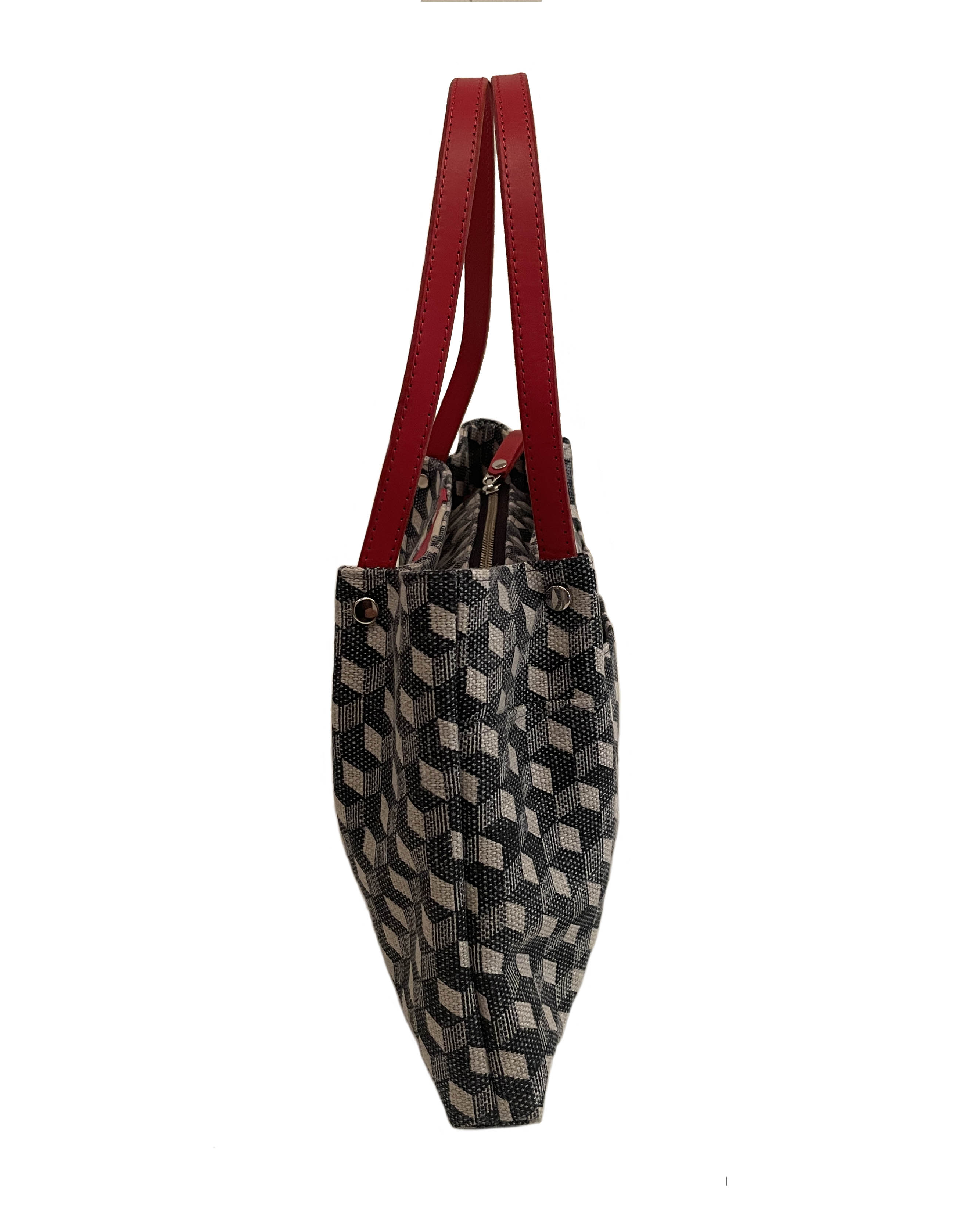中身が見やすく取り出しやすい、横長タイプのデザインです。軽やかで程よいサイズ感のため、使うシーンを選びません。ハンドルは長めの設計で、薄着の季節には肩掛けスタイルでもバランス良く持ち歩けます。